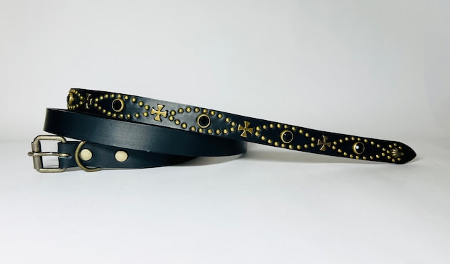 革幅約2センチ革厚約3,5ミリ 剣先にアイアンクロススタッズとサークルパターンを施した剣先35cmのナローベルトです。バックルの留め具がスナップボタン式ですのでバックルを取り外しできます。 全長 28inch 110センチ ケン先(約35センチ) 30inch 115センチ ケン先(約35センチ) 32inch 120センチ ケン先(約35センチ) 34inch 125センチ ケン先(約35センチ) 36inch 130センチ ケン先(約35センチ) 38inch 135センチ ケン先(約35センチ) ケン先はベルトの最終穴から末端までの事です。 ※ベルト先端の形を選択できます。 ※スーパーナロー(+13cm)を選択可能です。 ※ホースシューバックルへ変更可能です。 オプションより選択して下さい。
