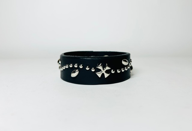革幅約2.2cm 革厚:約3.5mm フリーサイズ、内周:約18cm 〜22cm ブラックカラーのアイアンクロススタッズを9つ使用したブレスレット、スナップもブラックカラーで統一したモデル。ダブルスナップボタンによりサイズが調整できます。お問い合わせ頂ければ他のサイズもご希望のサイズでオーダー可能です(無料)