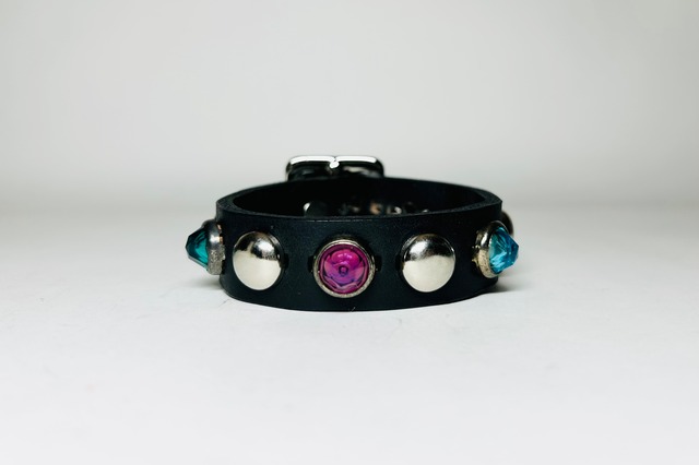 革幅約2cm 革厚:約3.5mm 大きなラウンドスタッズ、と5色のハイドームジュエルを用いたブレスレット。フリーサイズ:内周:約15cm 〜22cm ベルトバックルによりサイズが調整できます。お問い合わせいただきましたら他の希望のサイズもオーダー可能です(無料)お気軽に問い合わせ下さい。