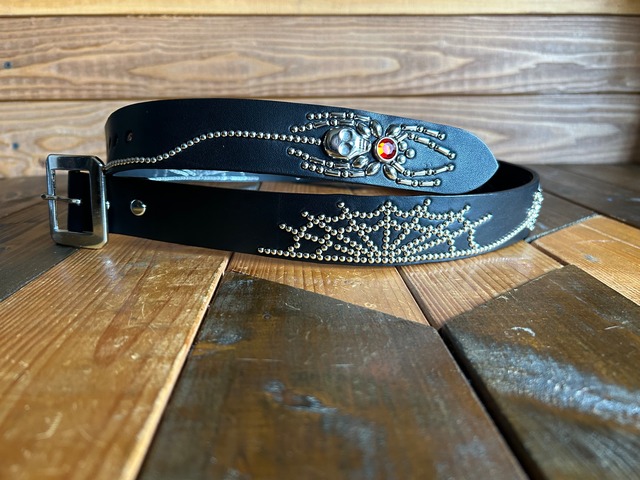 革幅3.5 cm革厚3.5mm 36インチで制作 ストーンをレッドジュエルへ変更 3匹の蜘蛛がそれぞれの巣を作っているデザインのスタッズベルト。剣先には幸運の象徴であるスカルスパイダーがおり二匹が後を追います。バックルはダブルピン使用で留め具がスナップボタン式ですのでバックルの取り外しや付け替えが簡単行えます。 全長サイズ 28inch 約94センチ ケン先(約19センチ) 30inch 約99センチ ケン先(約19センチ) 32inch 約104センチ ケン先(約19センチ) 34inch 約109センチ ケン先(約19センチ) 36inch 約114センチ ケン先(約19センチ) 38inch 約119センチ ケン先(約19センチ) 40inch 約124センチ ケン先(約19センチ) ※ケン先はベルトの最終穴から末端までの事です。