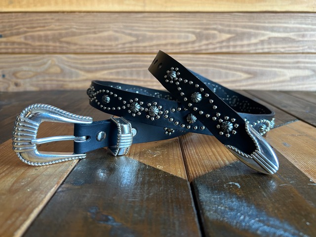 革幅約4センチ革厚約3,5㍉ アラベスクバックル 剣先ターコイズストーンへ ベルト全面の360度にスタッズを施したベルトはフラワーとバタフライの2種類のデザインをベルトの中央で切り替えたアシンメトリーデザイン。
