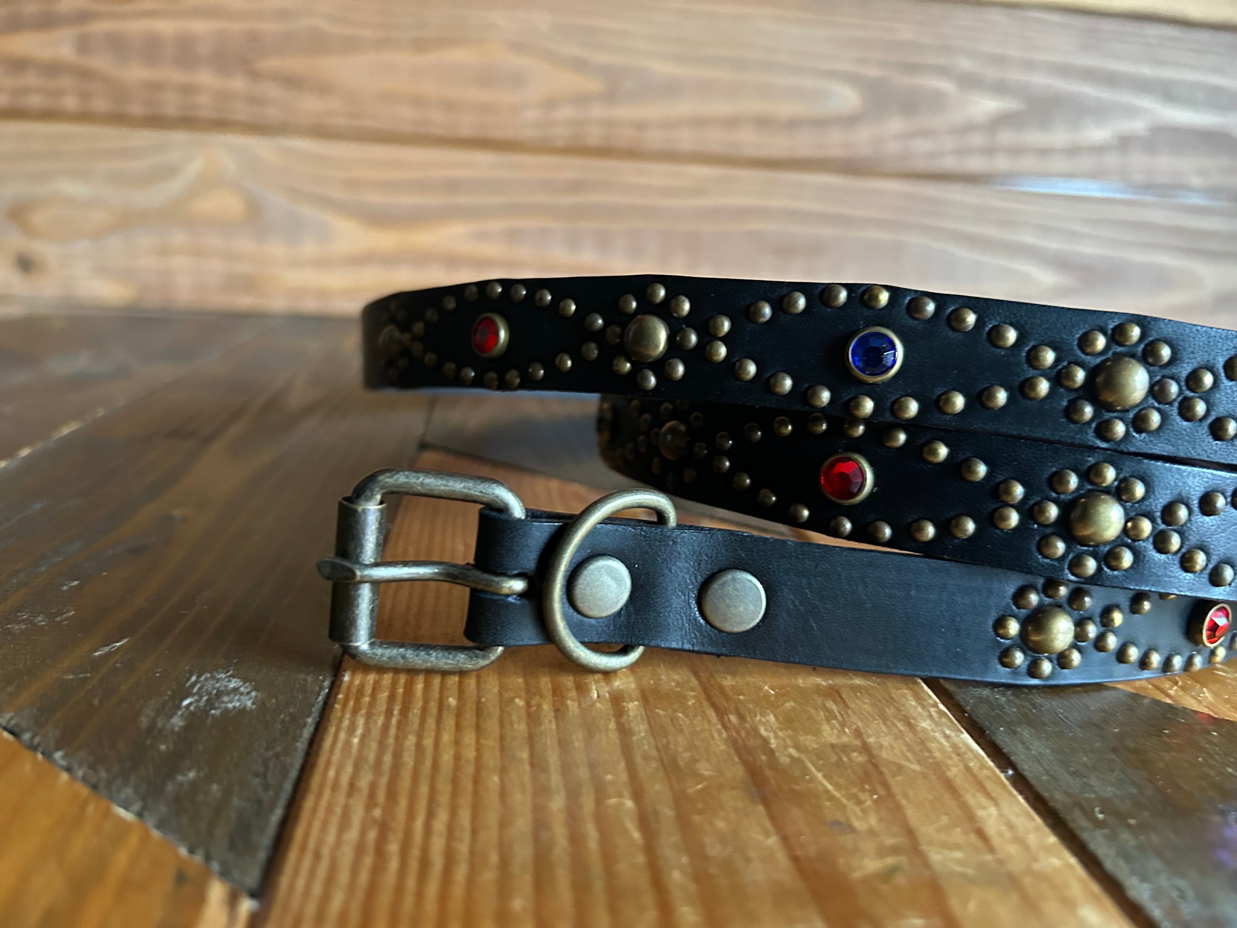 金具、スタッズの全てがアンティークブラス使用のナローベルト、ストーンが連なるチェーンデザインには「幸運の連鎖」の意味が込められています。画像はケンサキスクエアとなります。※バックルの留め具がスナップボタン式ですのでバックルの取り外しが可能です。