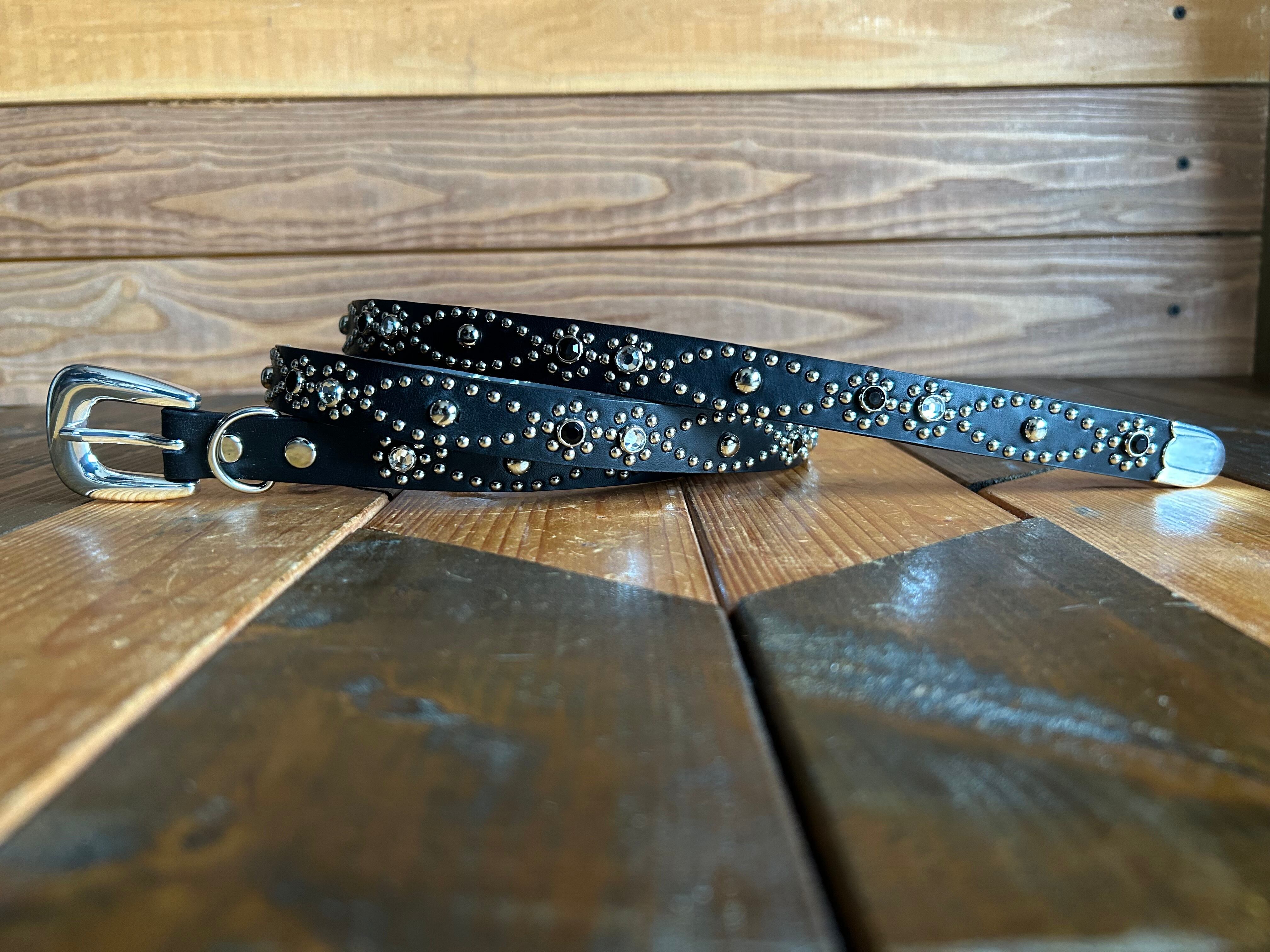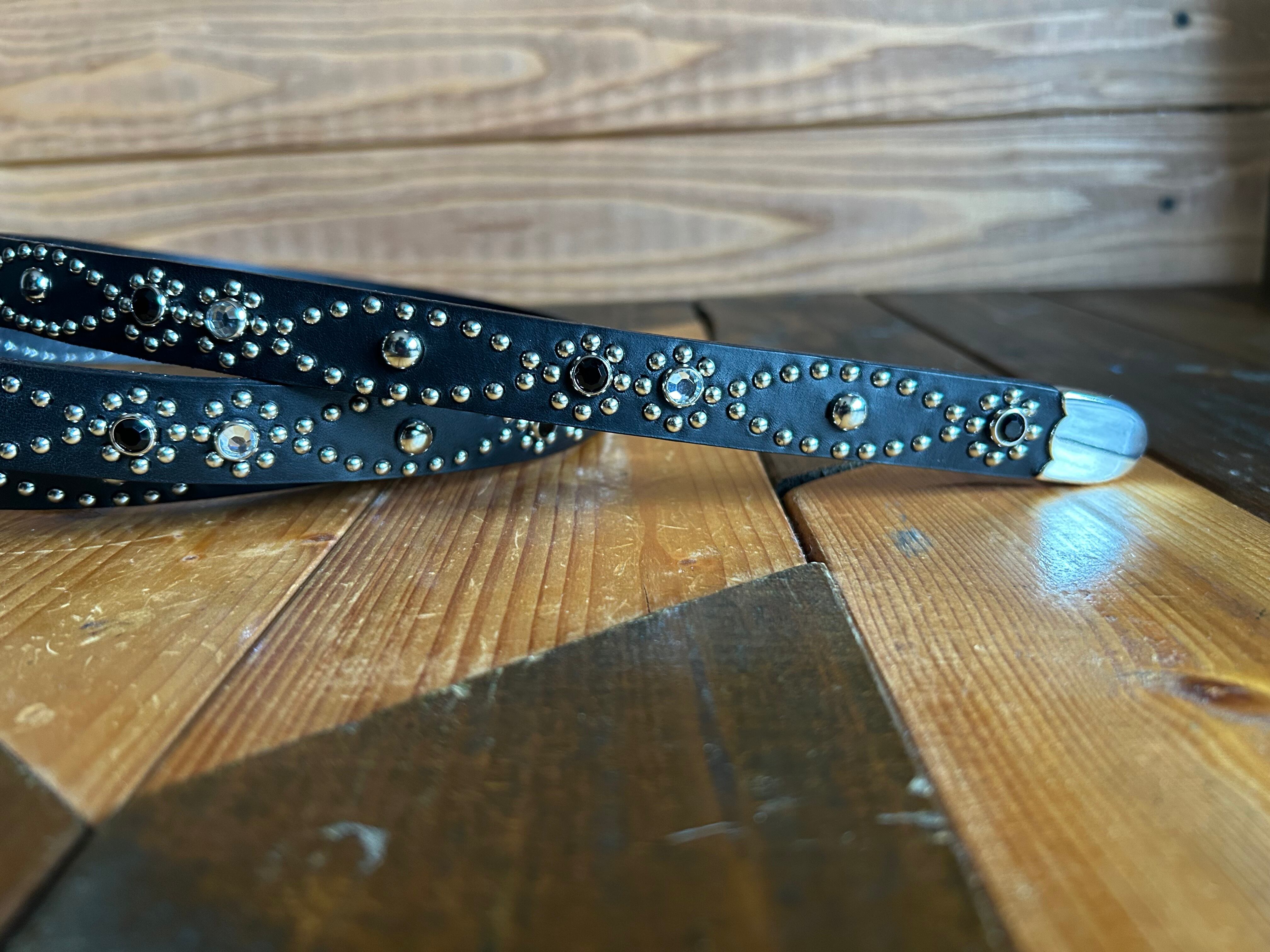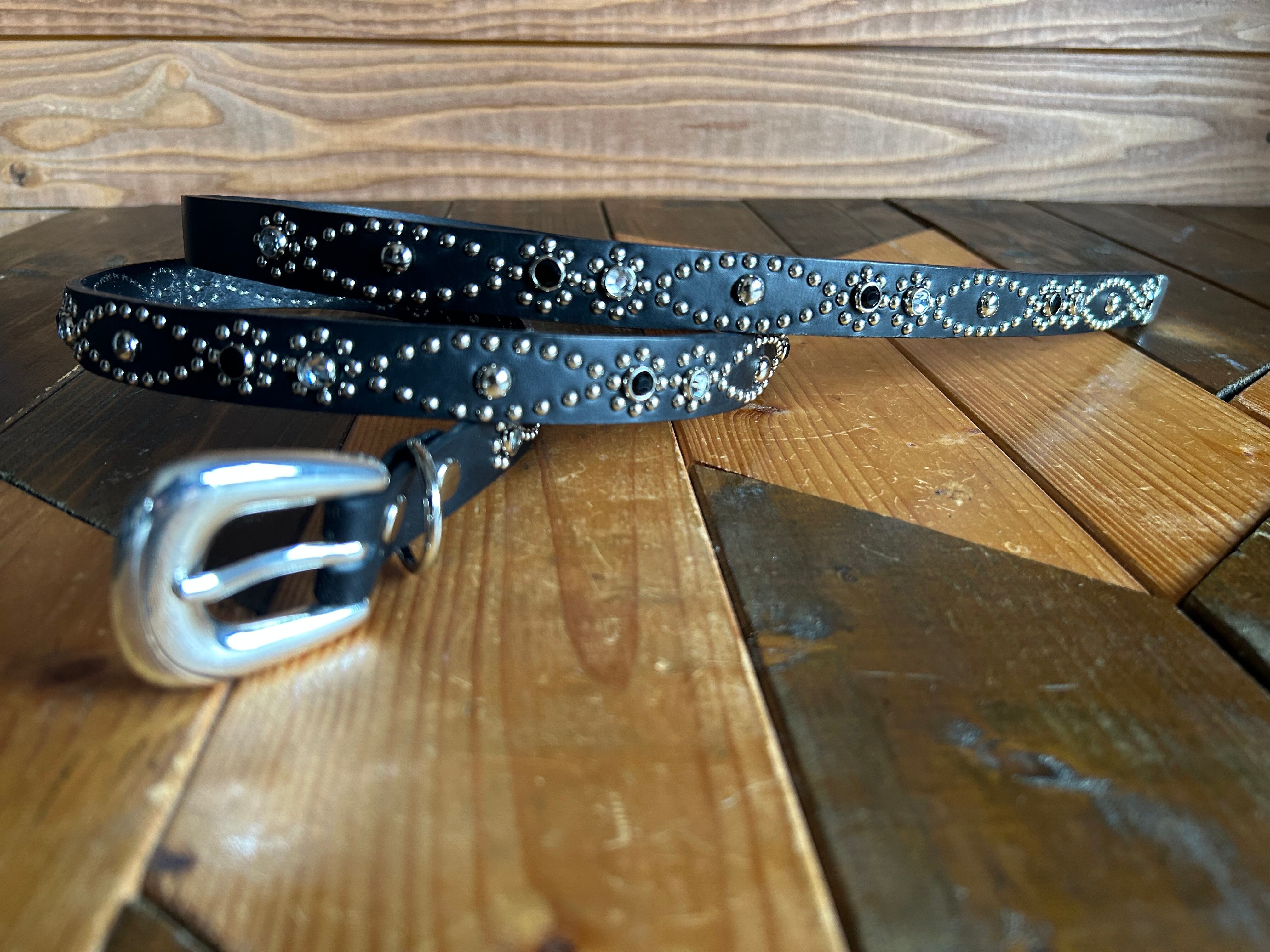 剣先金具、ウエスタンバックルを採用し、ベルト全面の360度にスタッズを施したウエスタンナローベルトです。ケンサキが45センチのためクラシックノットスタイルでの着用も可能です。※バックルの留め具がスナップボタン式でバックルの取り外しが可能です。