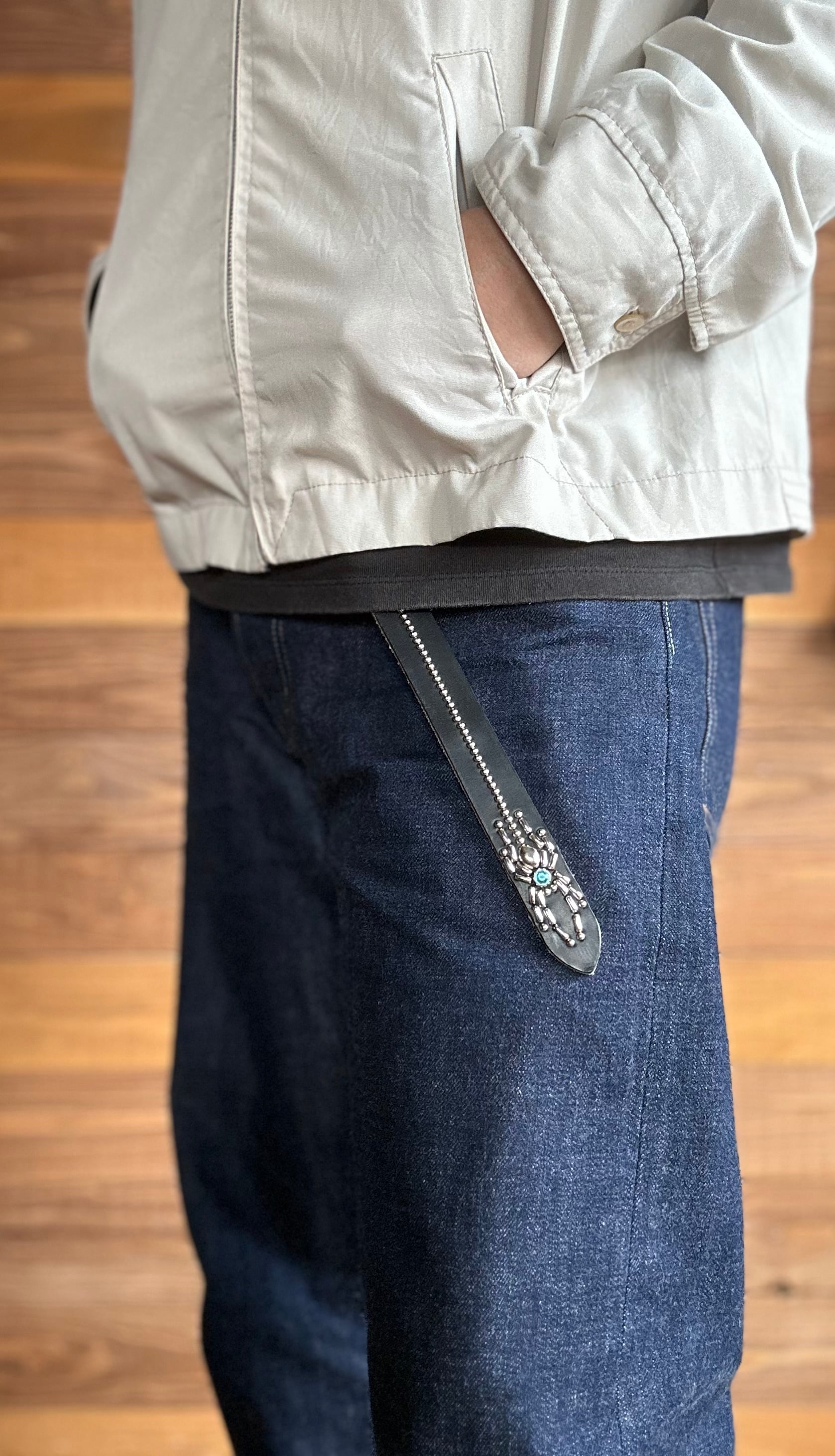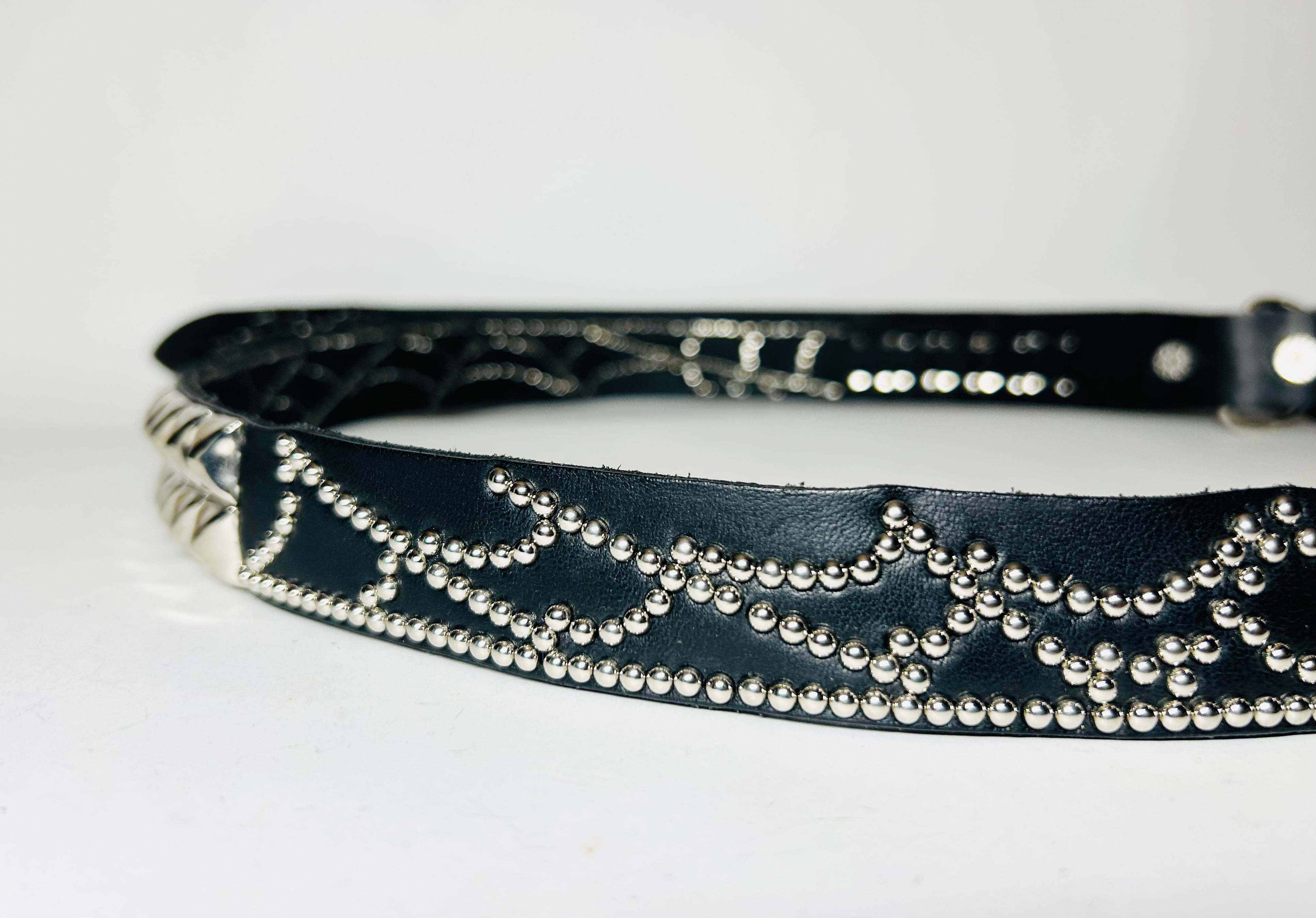 ベルトケンサキにスパイダー、腰回りにスパイダーウェブデザインを施したナローロングベルト。ケンサキから途切れる事なく一周する蜘蛛の糸は幸運を掴みあなたを守ってくれるとか… 着用画像のケンサキスタイルはシャープです。バックルの留め具がスナップボタン式ですので取り外し可能です。