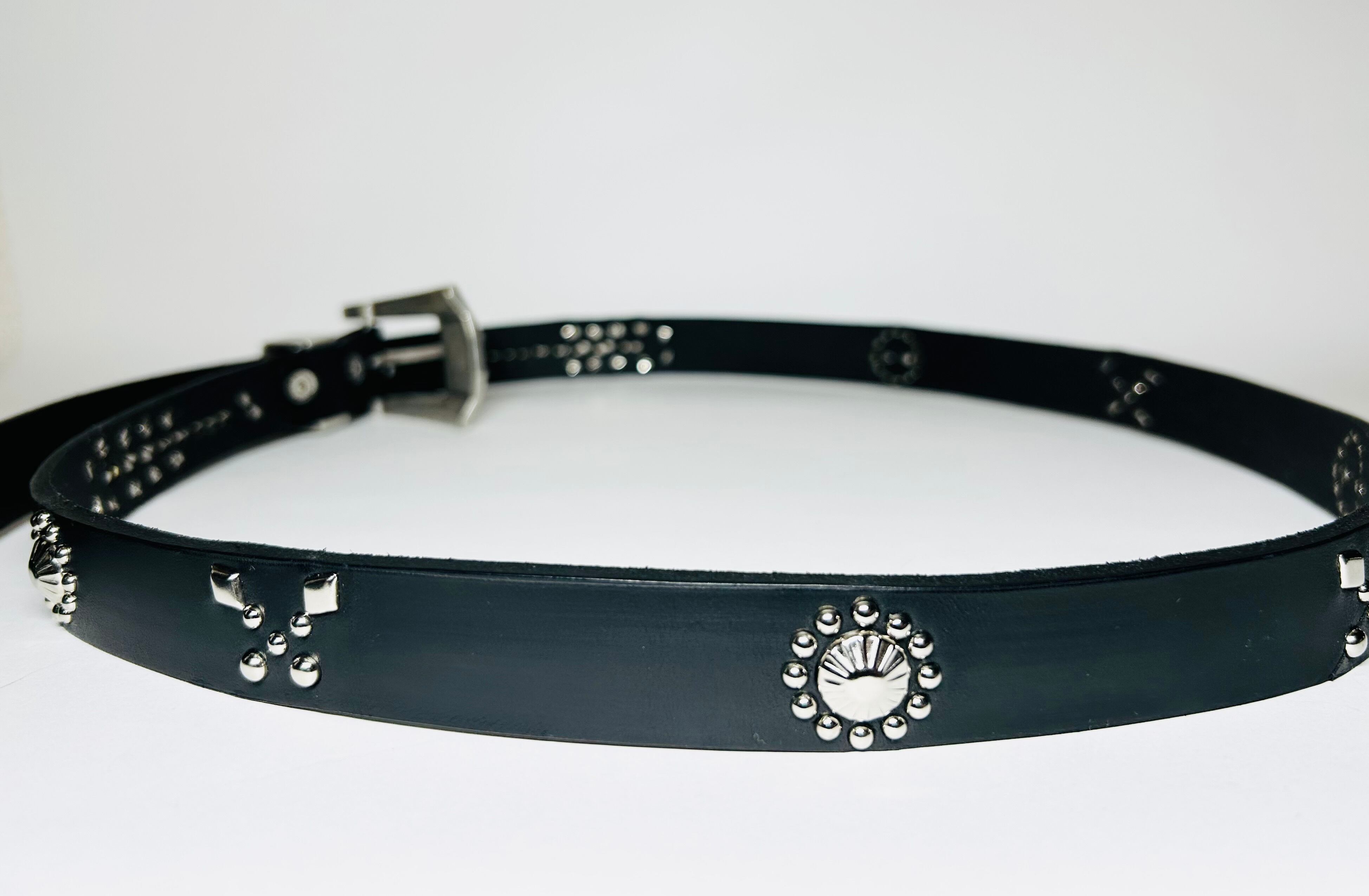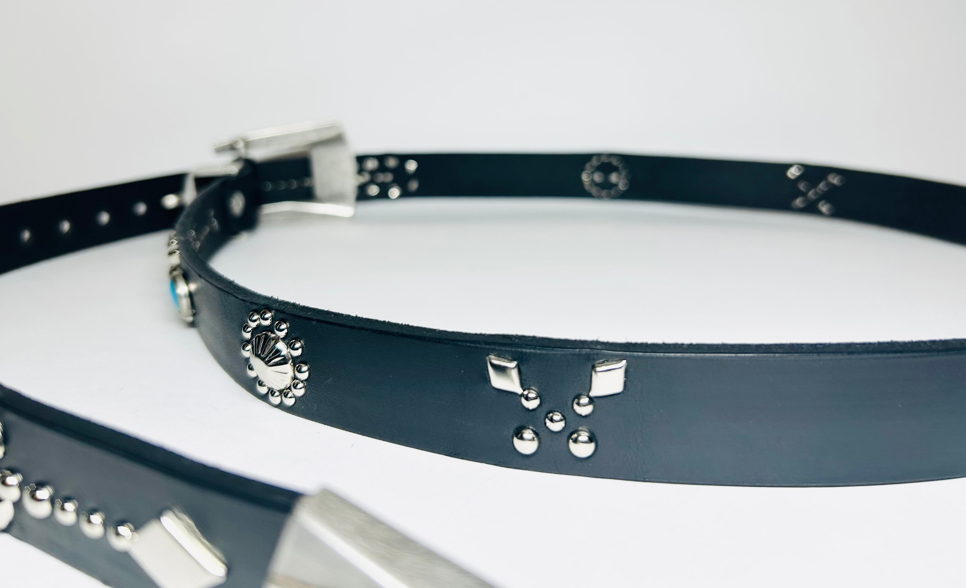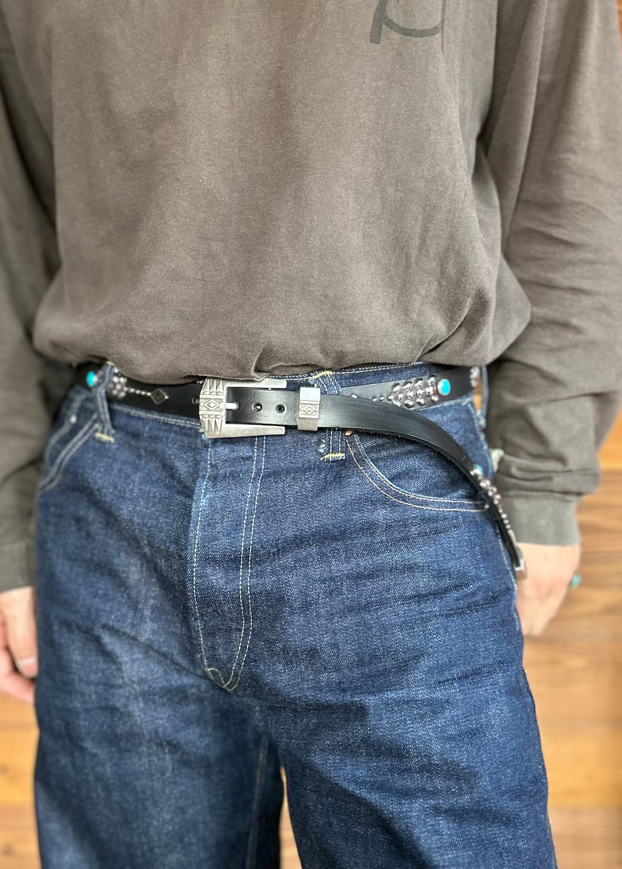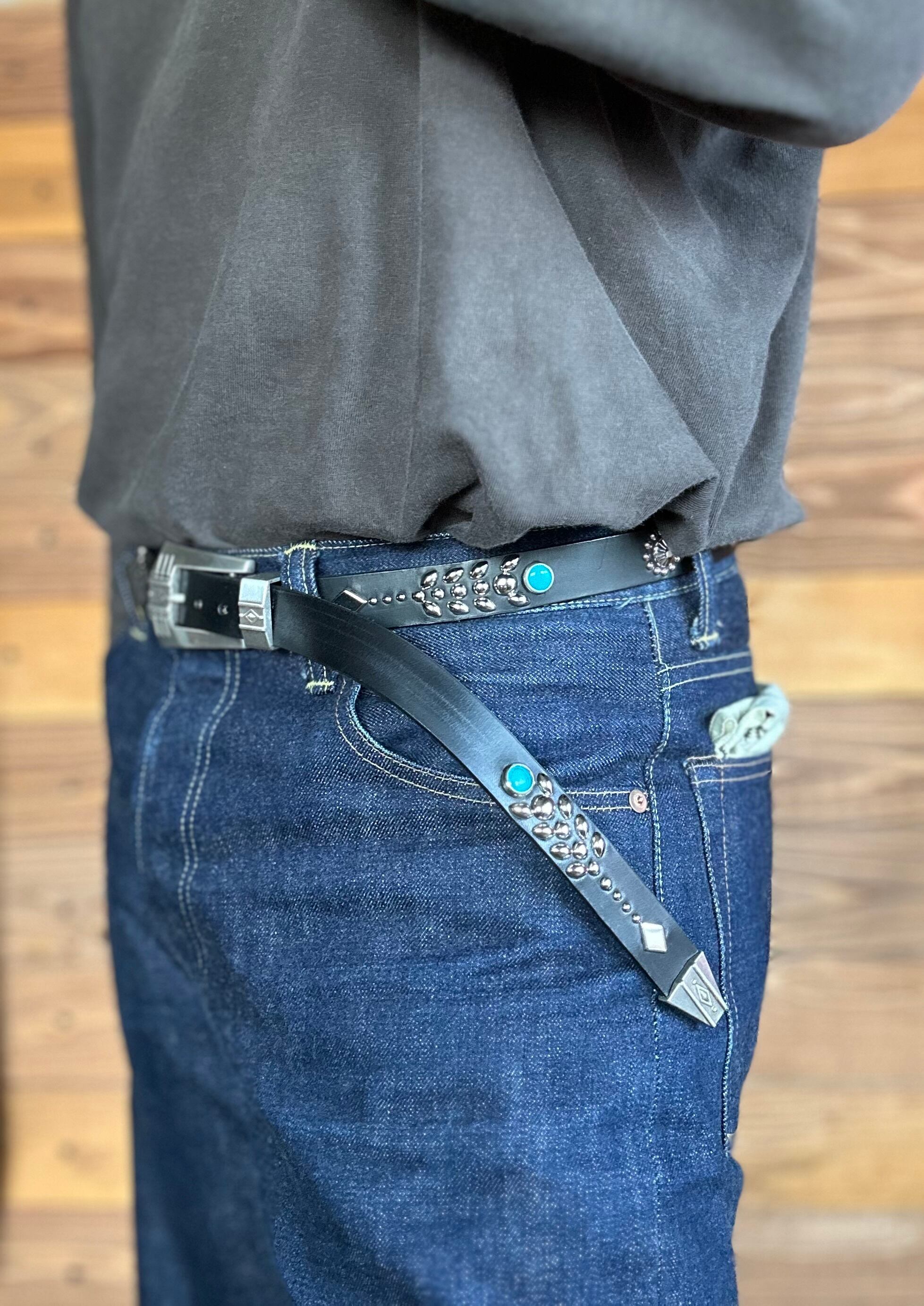 3ピースウエスタンバックルを採用したケンサキ27センチのウエスタンナローベルト。剣先のスタッズデザインにはインディアンにとって守りを意味する矢尻(インディアンアロー)を、また胴回りには友情や絆を意味するクロスアロー(交差した矢)を施しています。