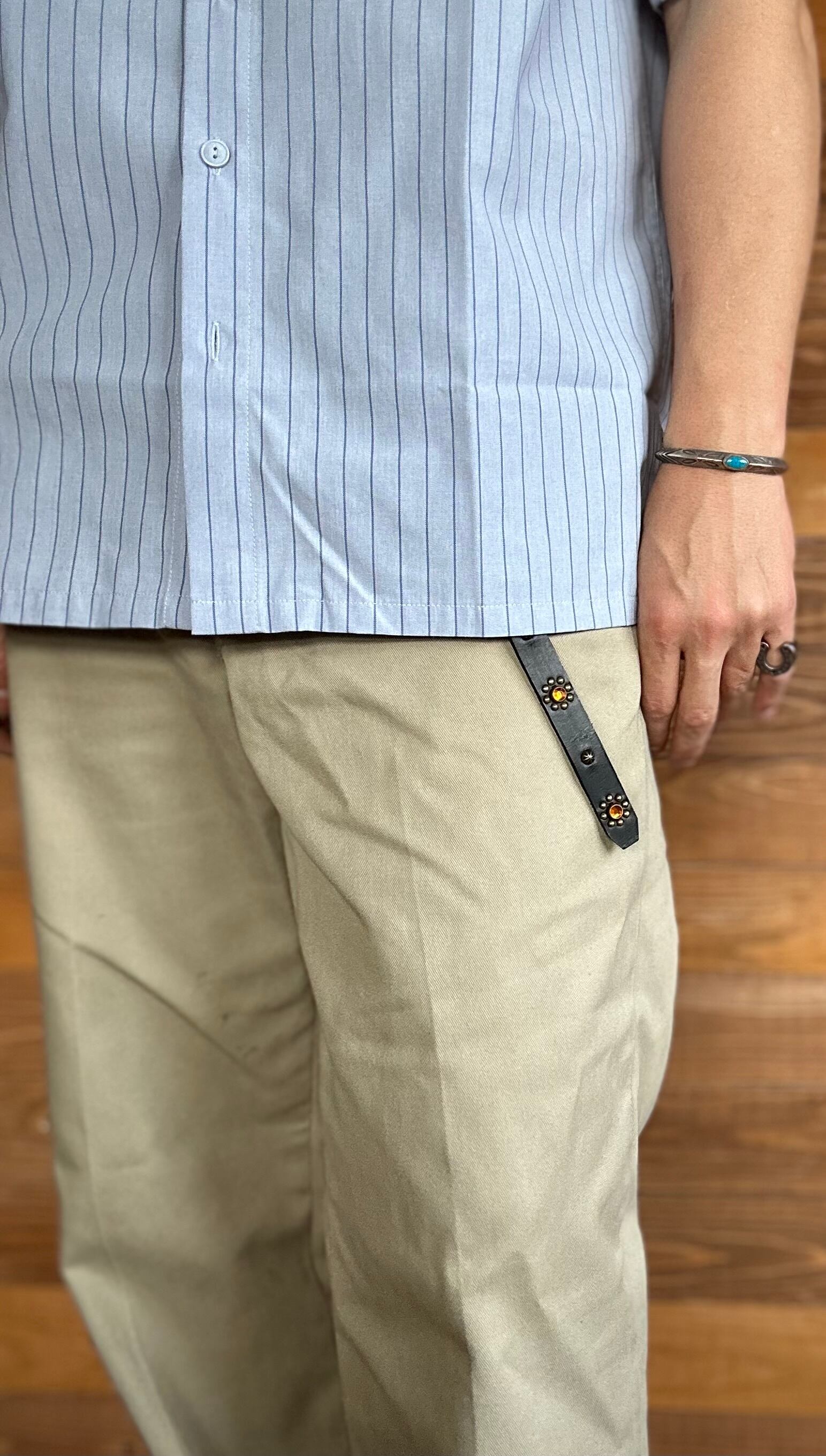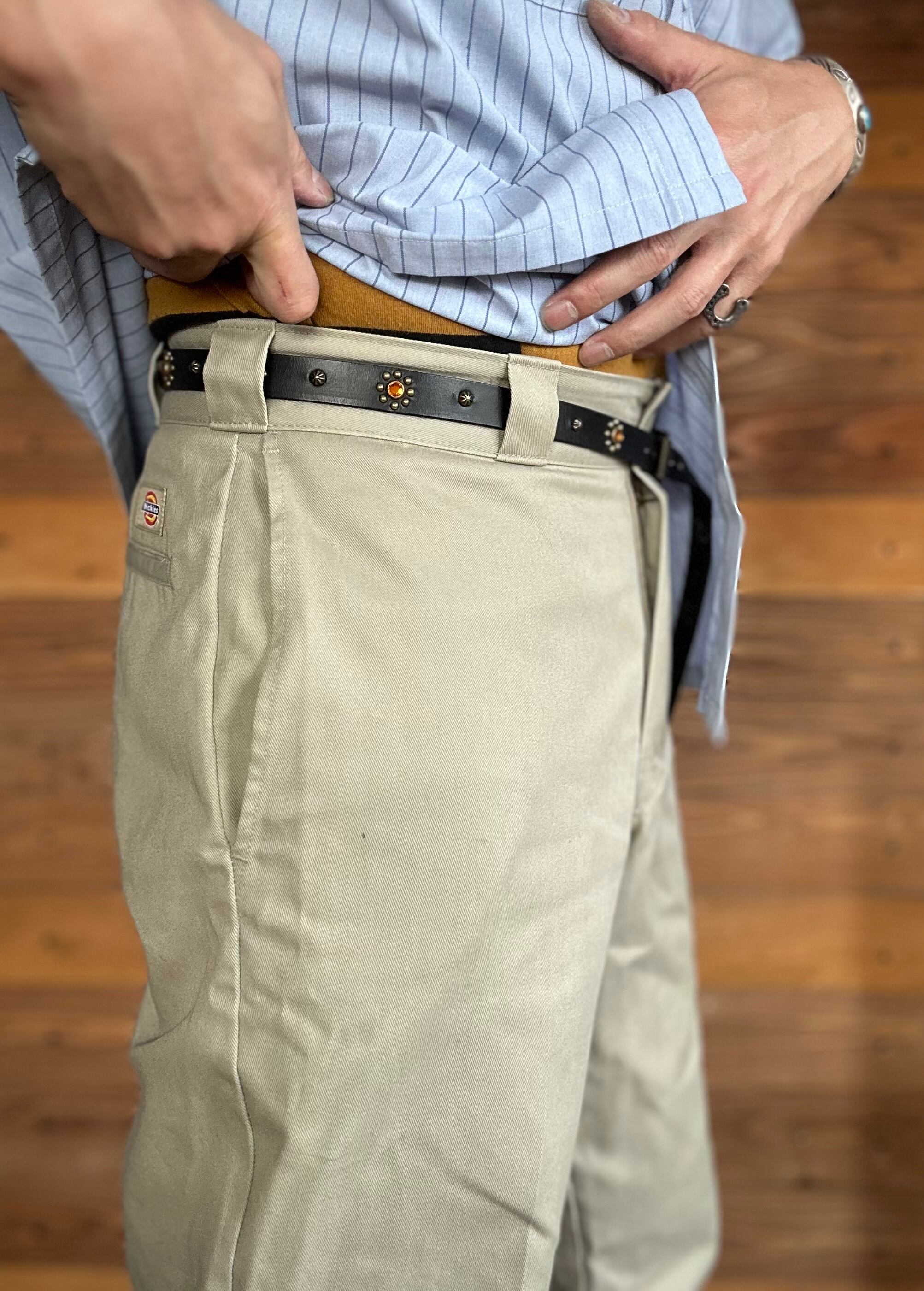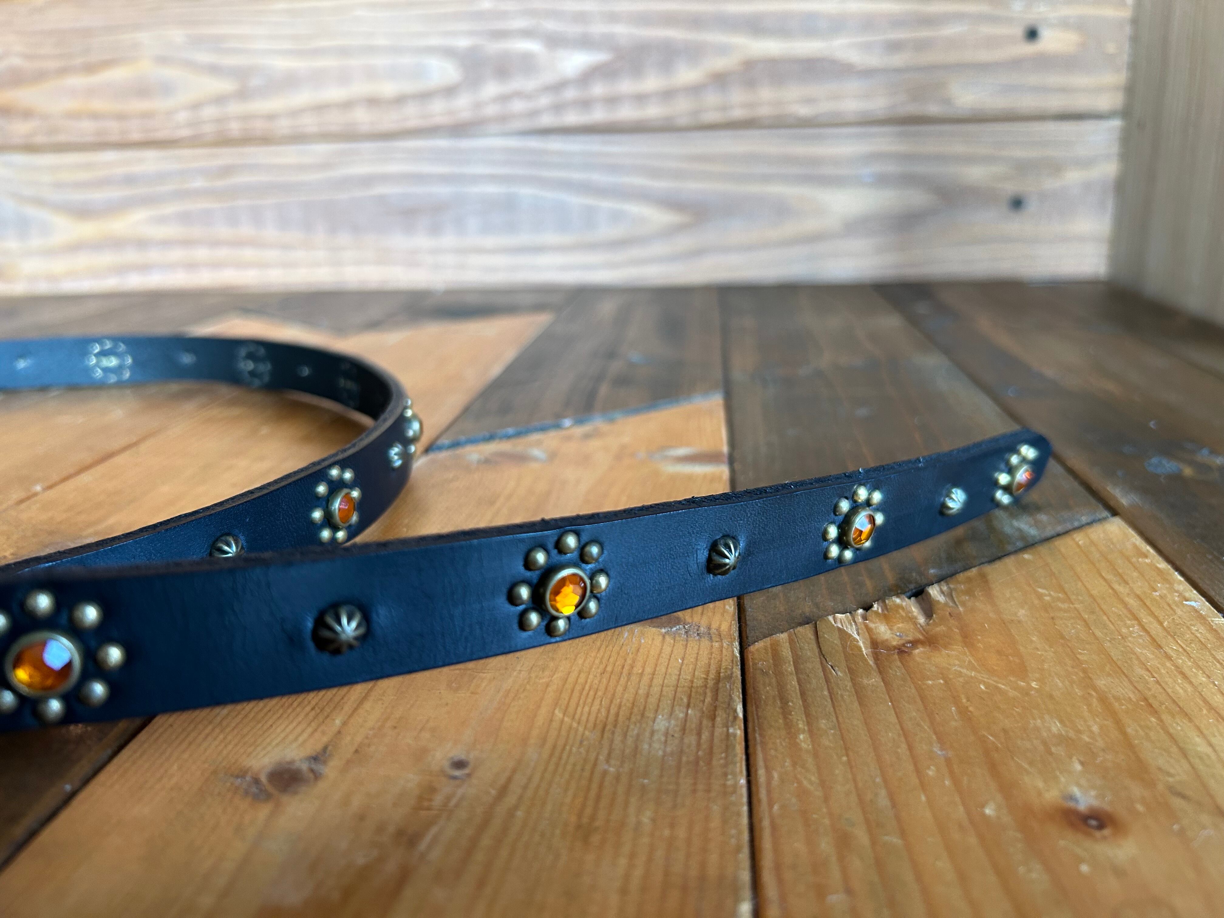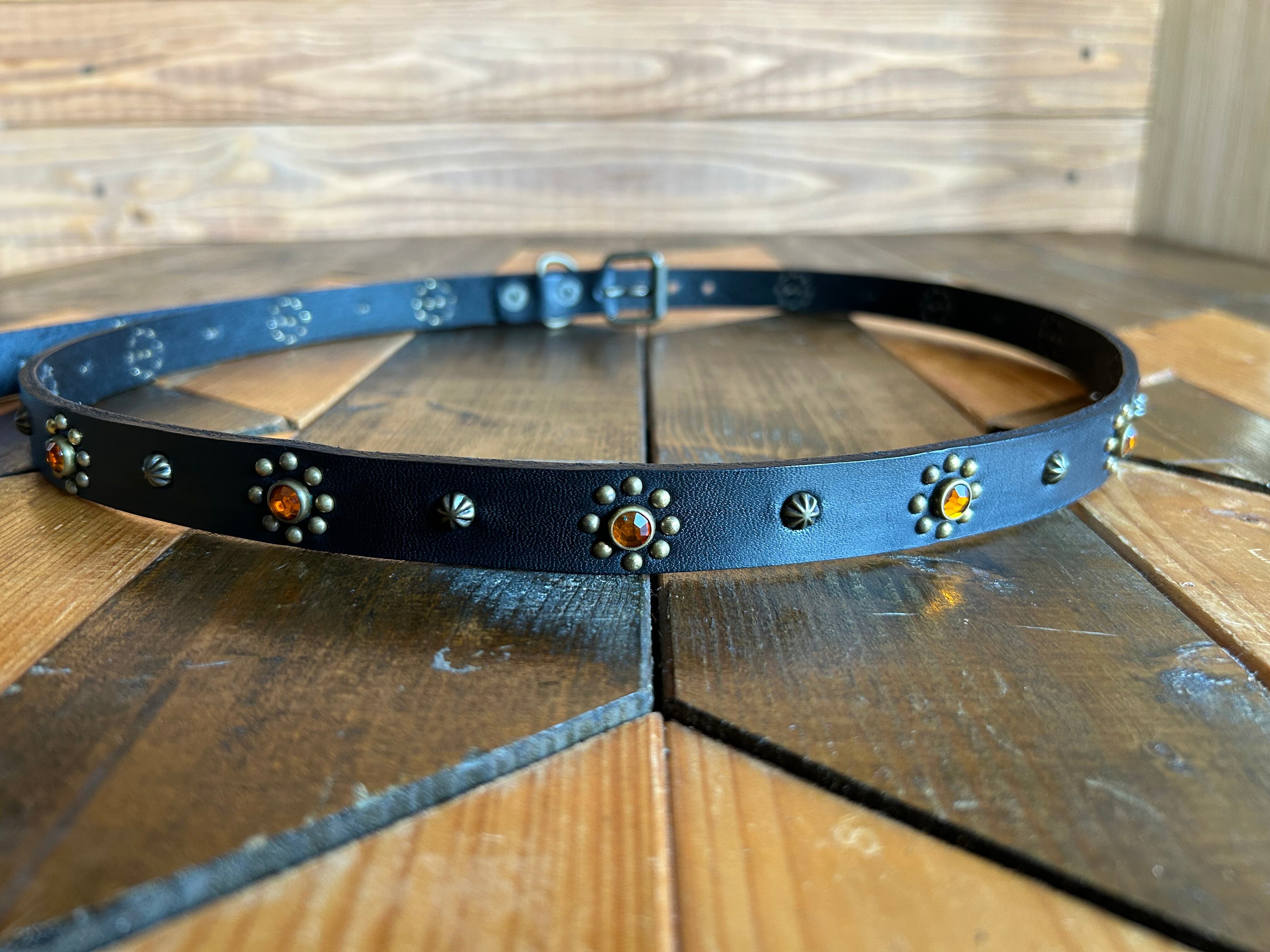 ベルト全面の360度にサークルパターンとアポロスタッズを施したナローベルト。ストーン同士の間隔は6.5cmで全てアンティークブラスバックルを使用したALLBRASSモデル。
