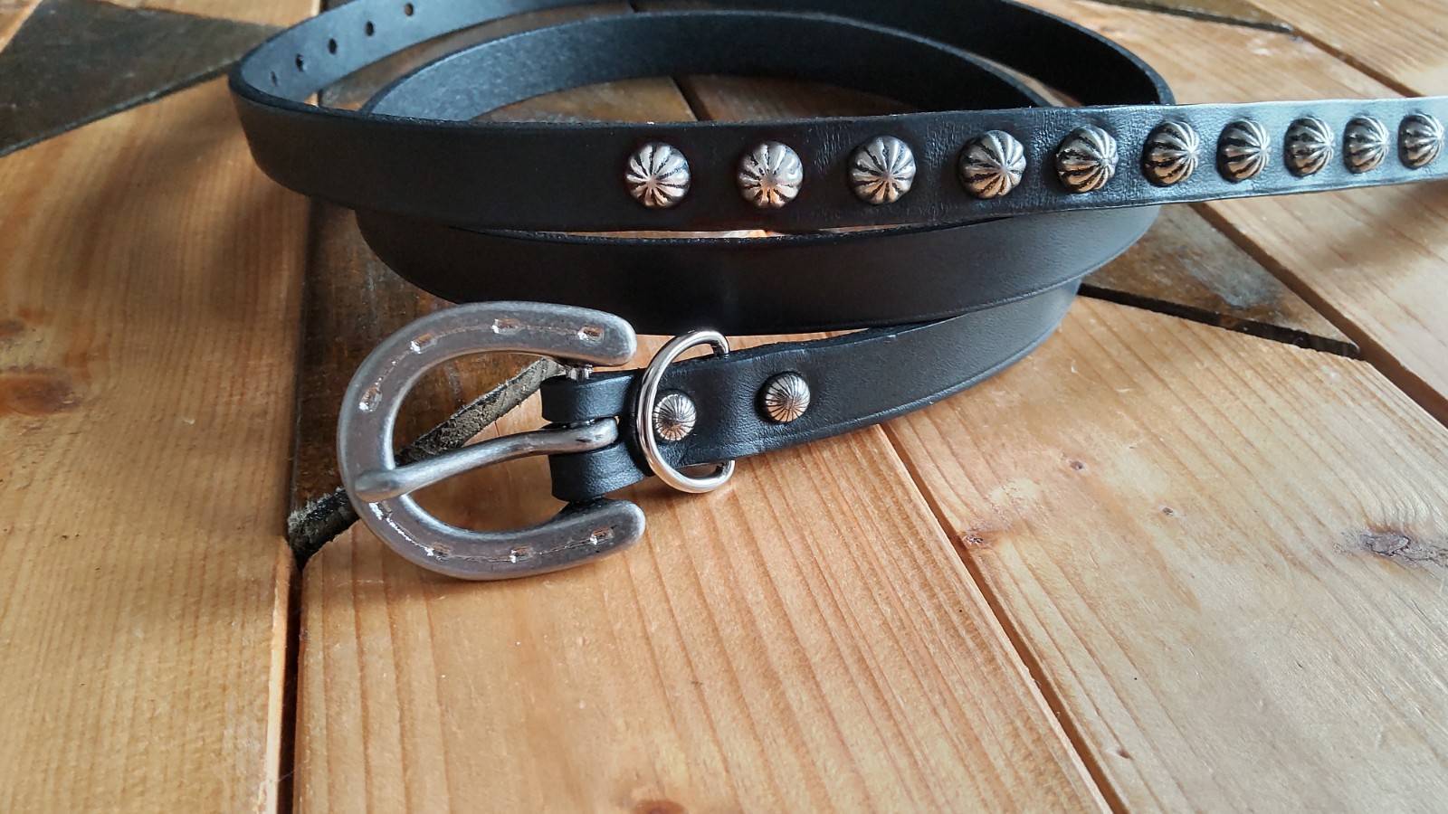 エンドに直径10mmのビックポロスタッズを打ち込んだ革カラーライトブラウンのナローベルト。