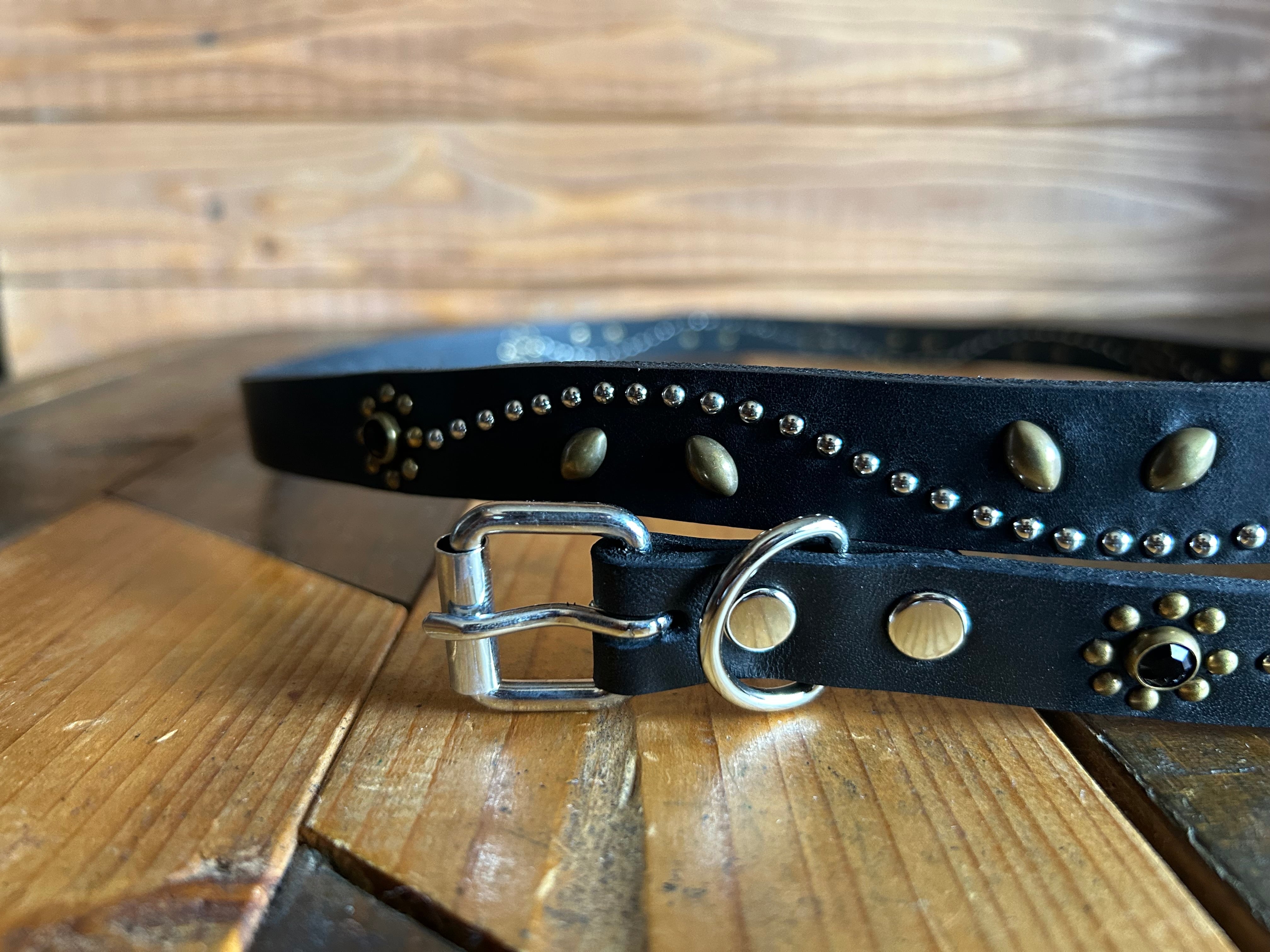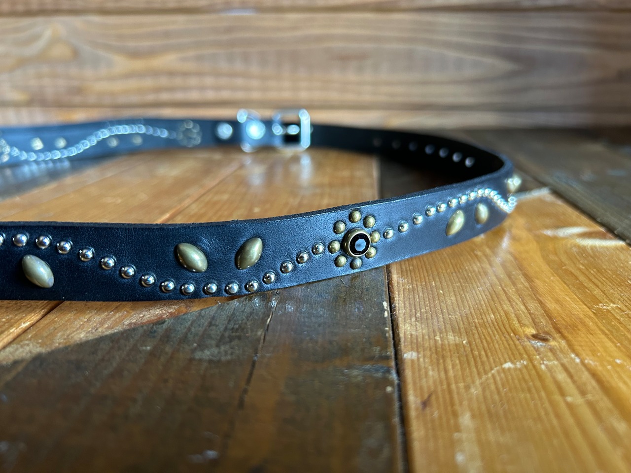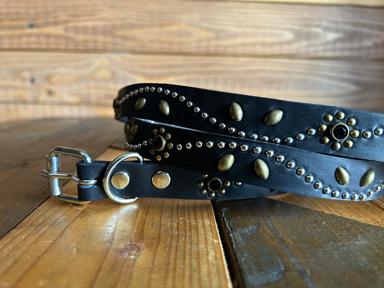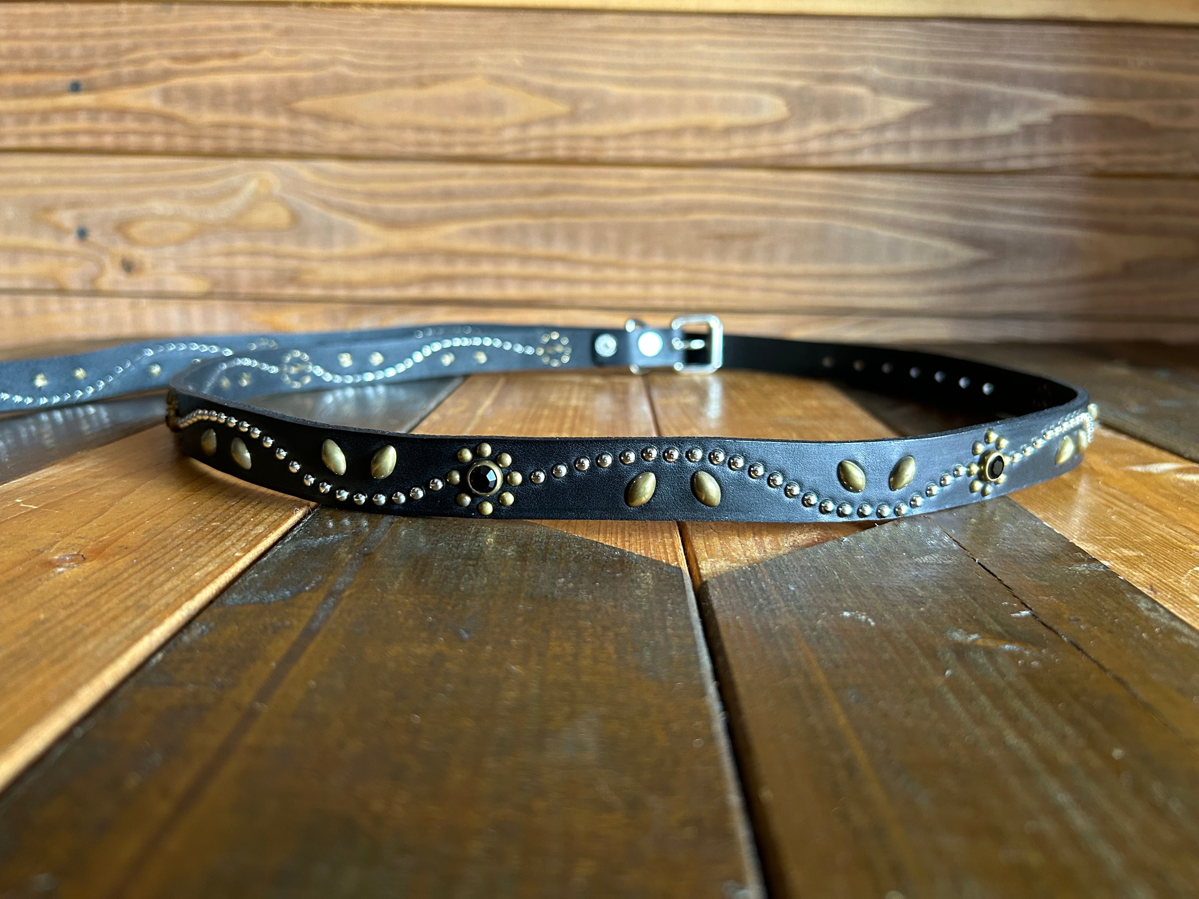 ベルト全面の360度にチューリップフラワーパターンを表現したナローベルト。リーフとサークルにブラススタッズ、ストーンはブラック(ブラス枠)その他のスタッズとバックル金具にシルバーカラーを使用したモデル。バックルの留め具がスナップボタン式ですのでバックルの取り外しが可能です。
