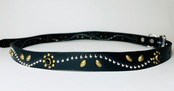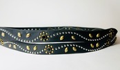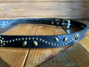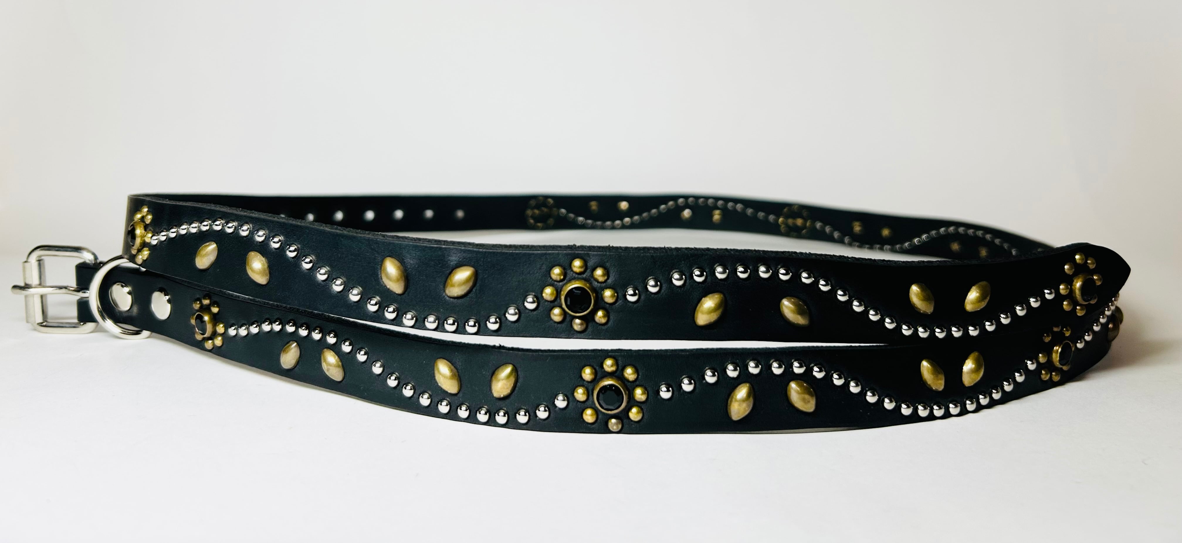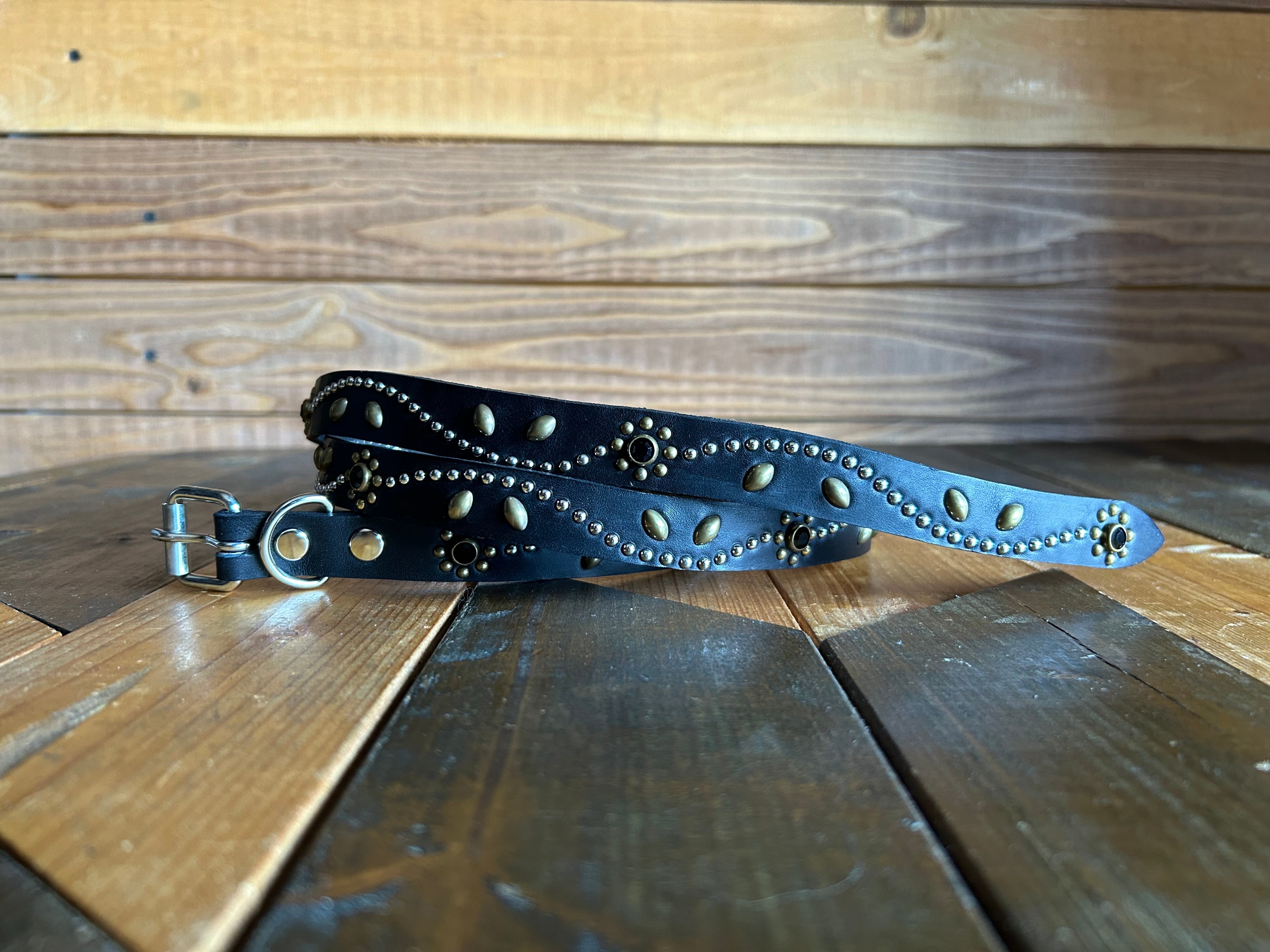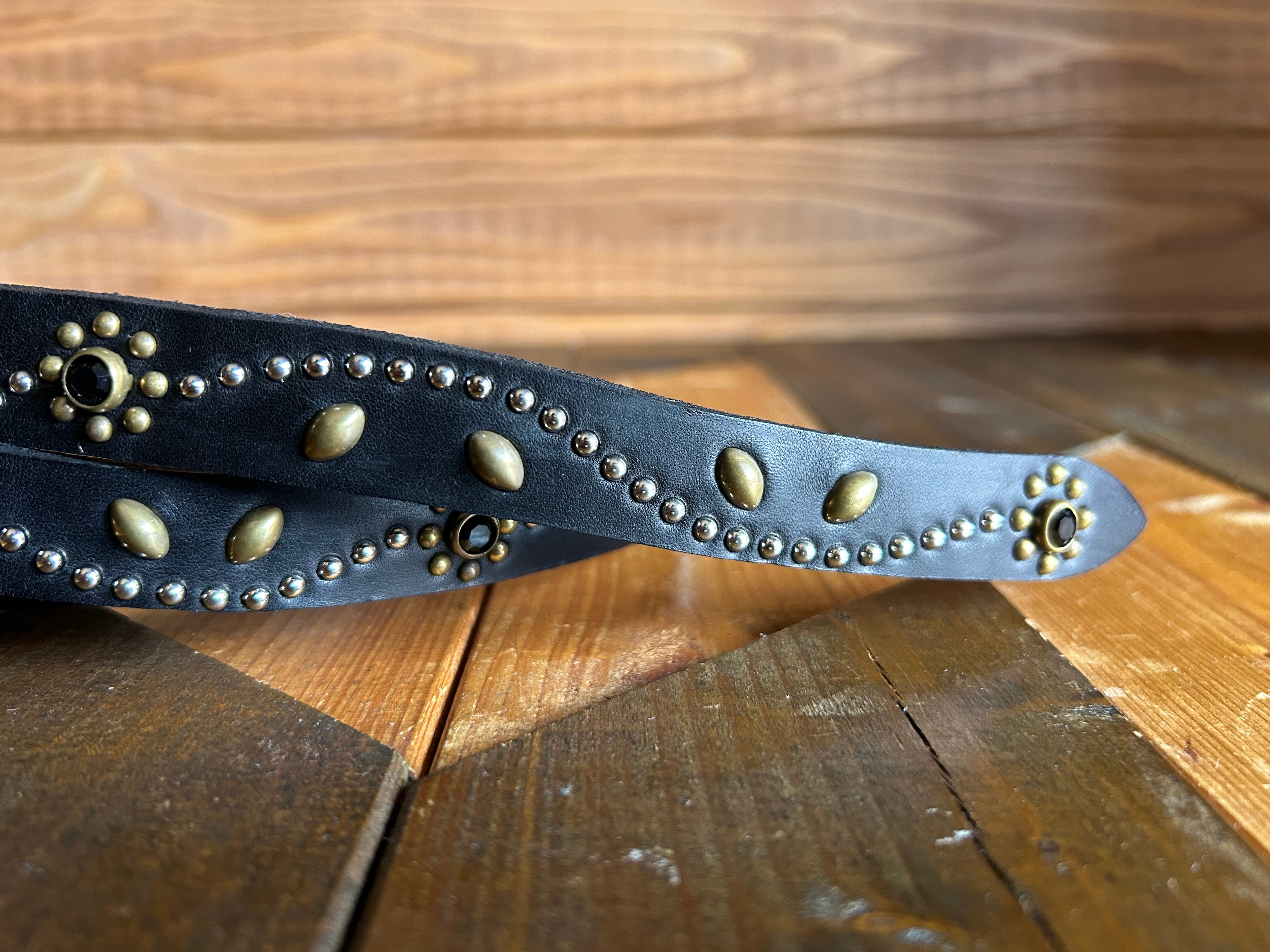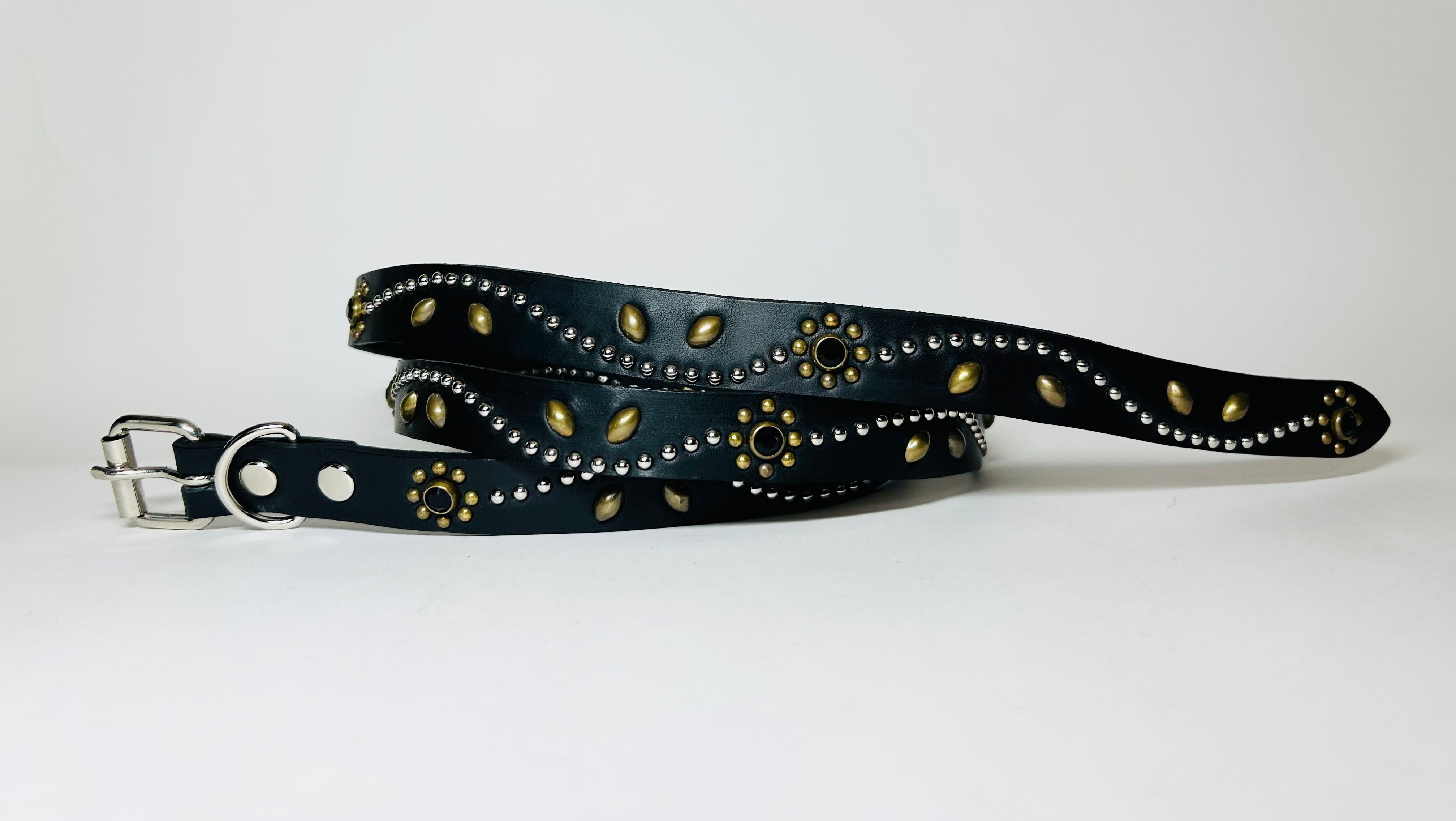 ベルト全面の360度にチューリップフラワーパターンを表現したナローベルト。リーフとサークルにブラススタッズ、ストーンはブラック(ブラス枠)その他のスタッズとバックル金具にシルバーカラーを使用したモデル。バックルの留め具がスナップボタン式ですのでバックルの取り外しが可能です。
