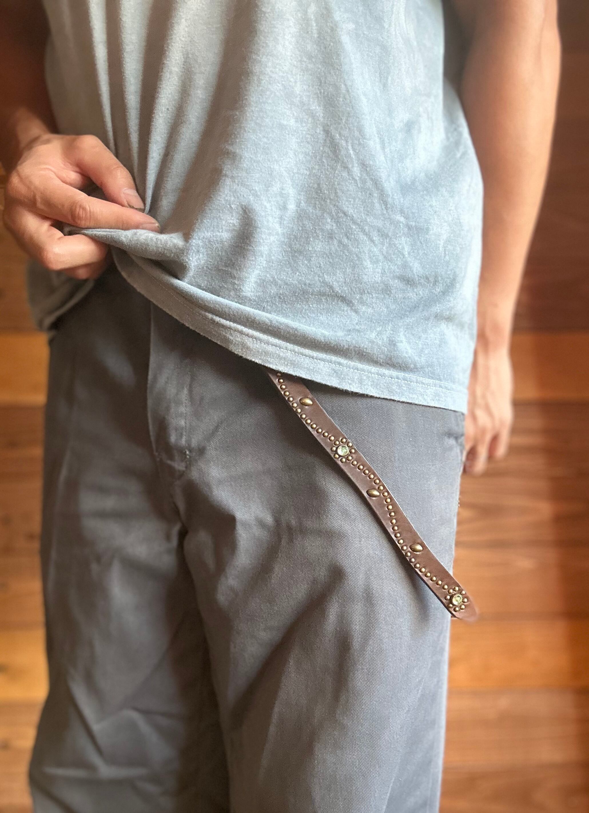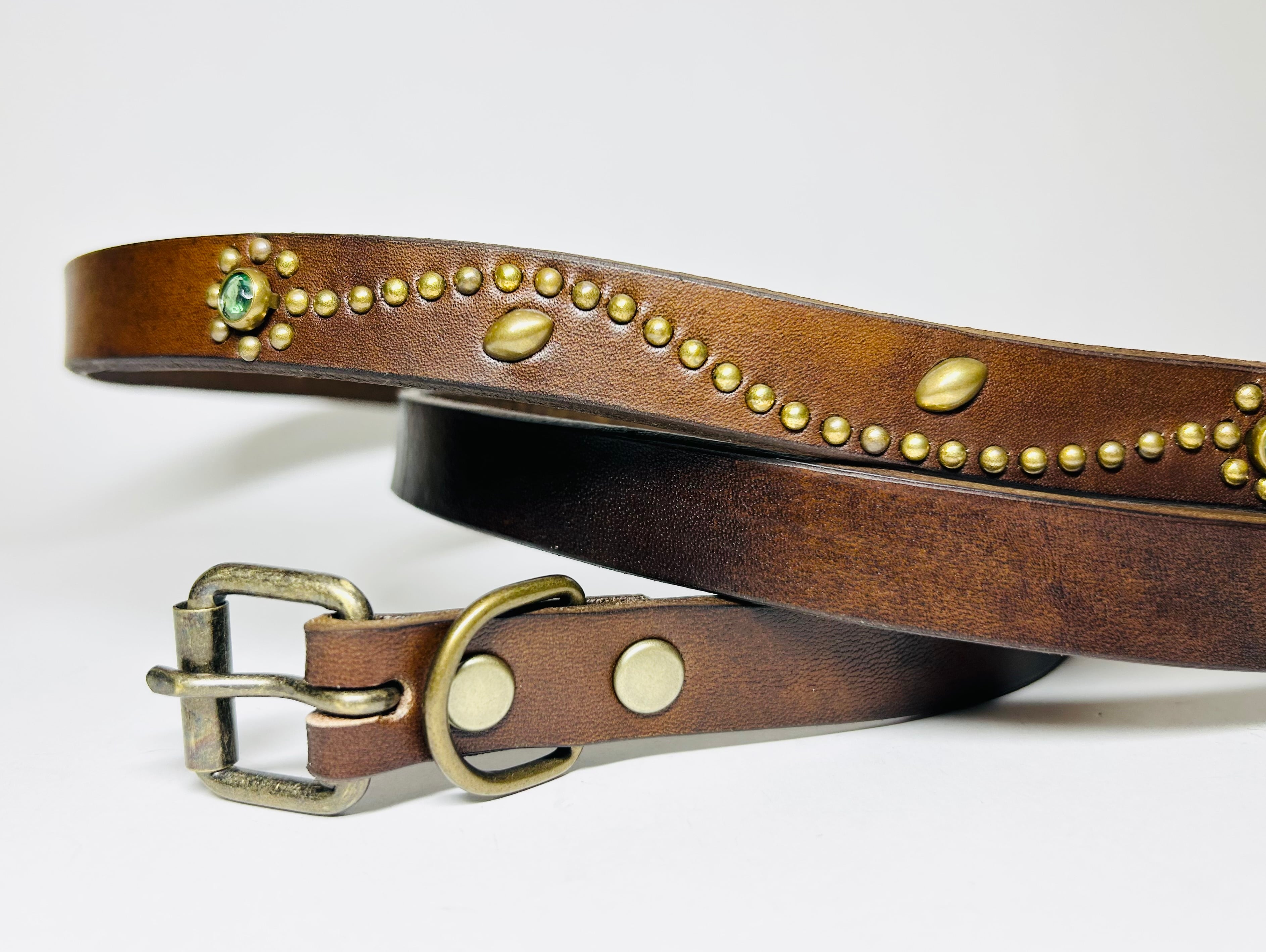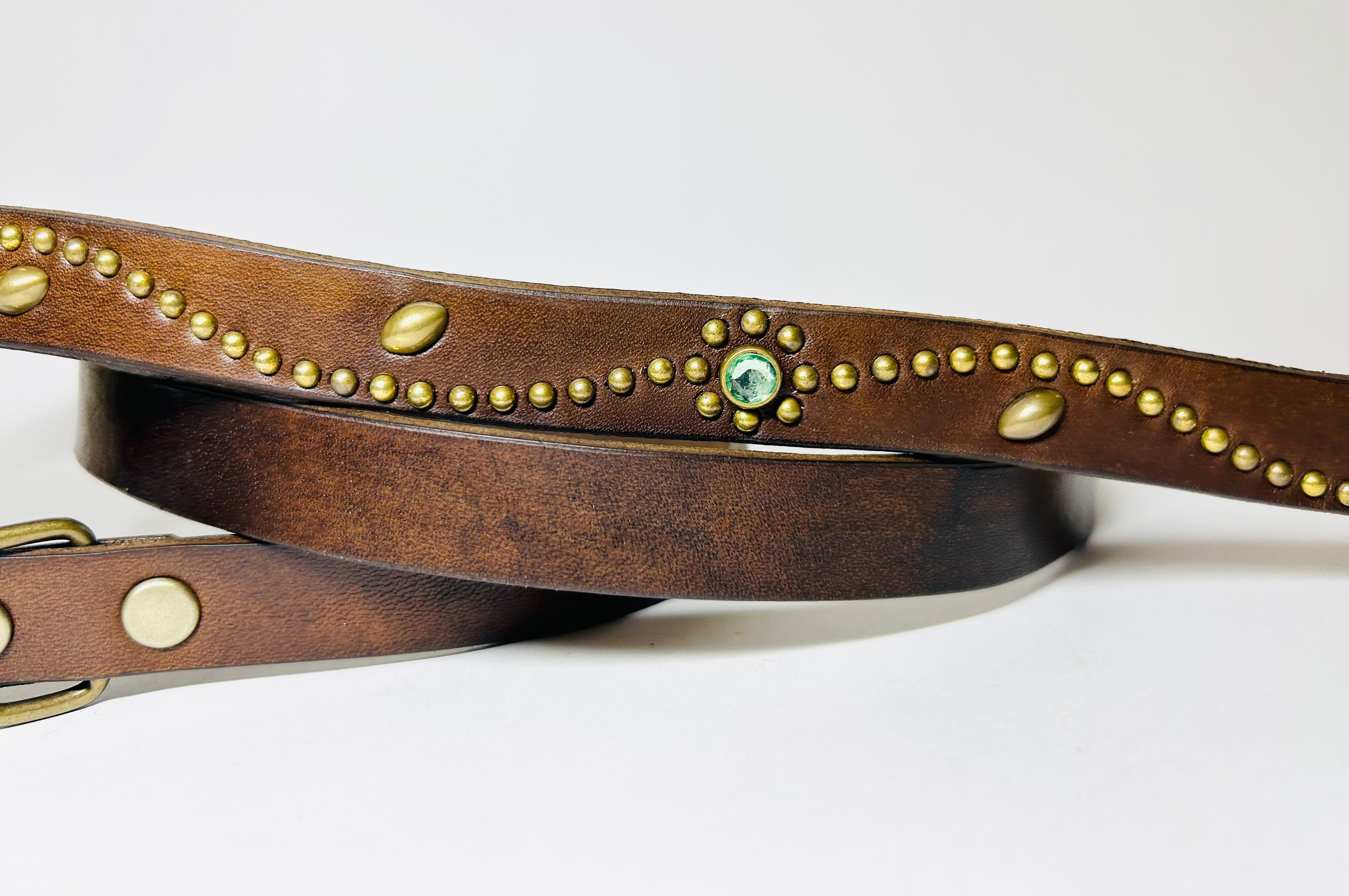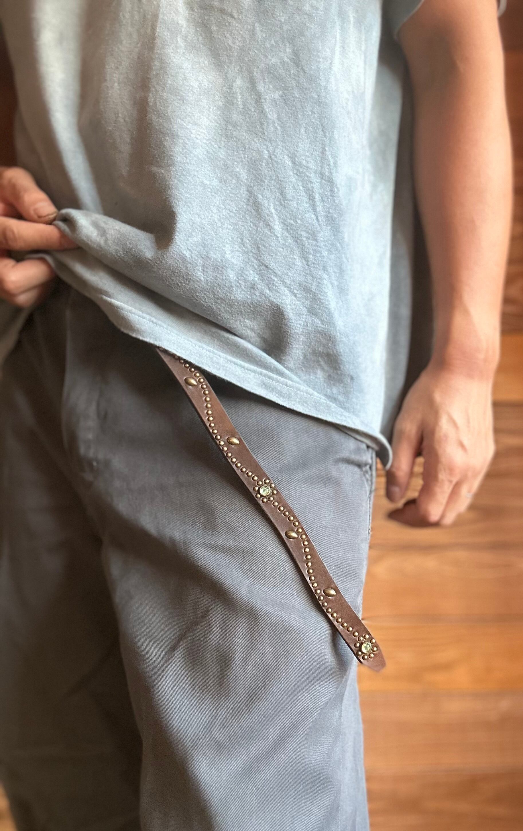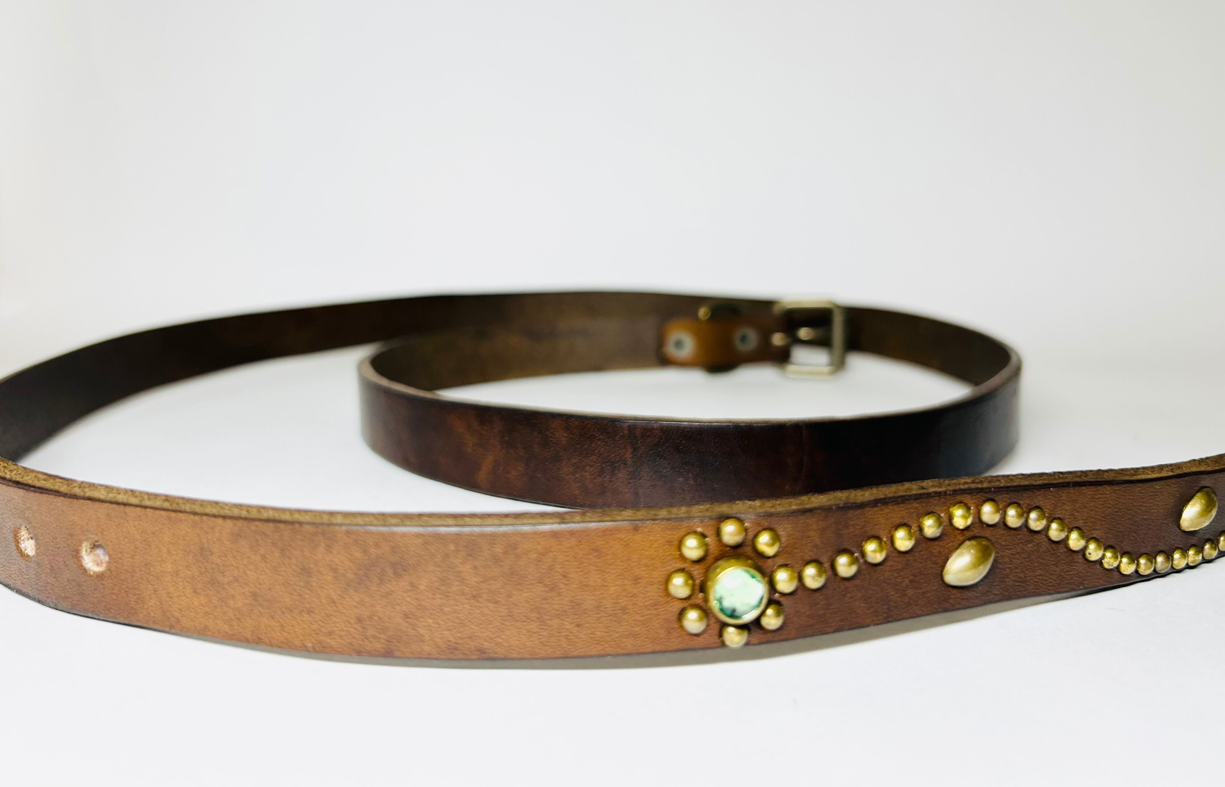 剣先にアンティークブラススタッズでフラワーを施したナローベルトです。ストーンはライトグリーン革色はダークブラウンです。バックルの留め具がスナップボタン式でバックルを取り外しする事が可能となります。