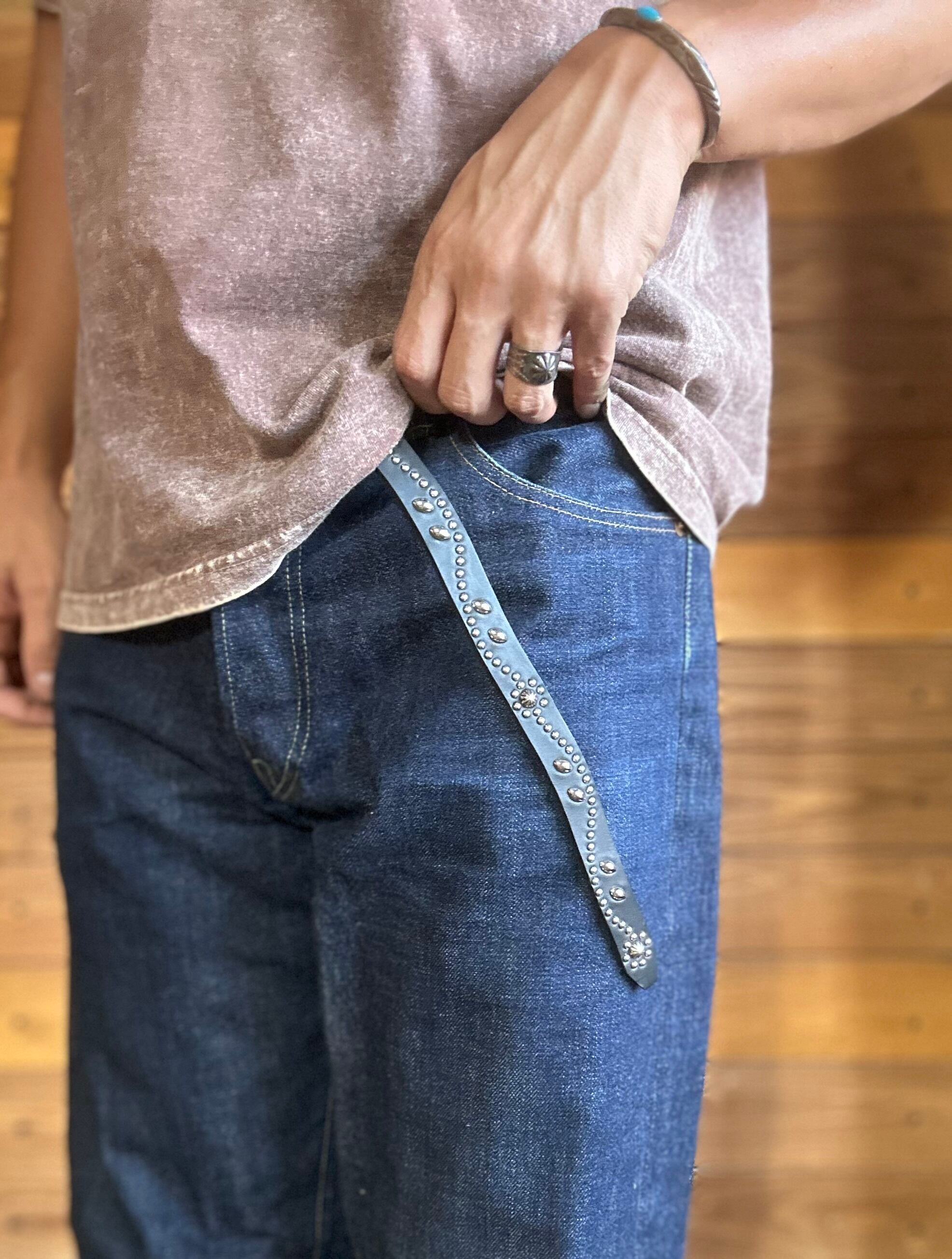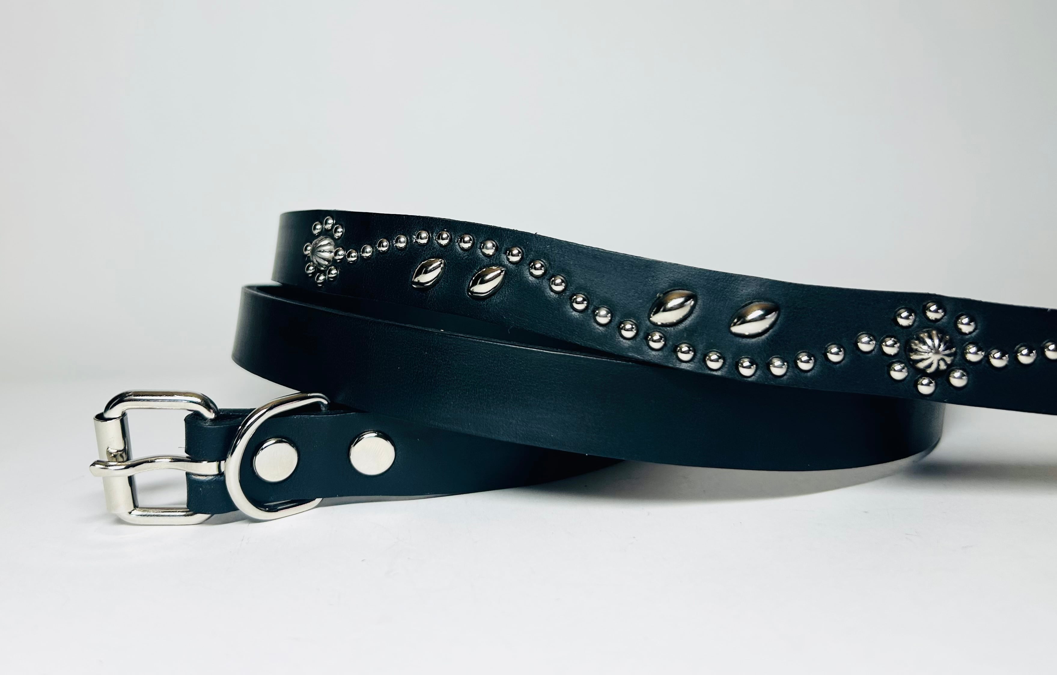 剣先にアポロ8mmのビッグアポロスタッズでフラワーを施した剣先35cmのナローベルトです。バックルの留め具がスナップボタン式ですのでバックルを取り外しできます。