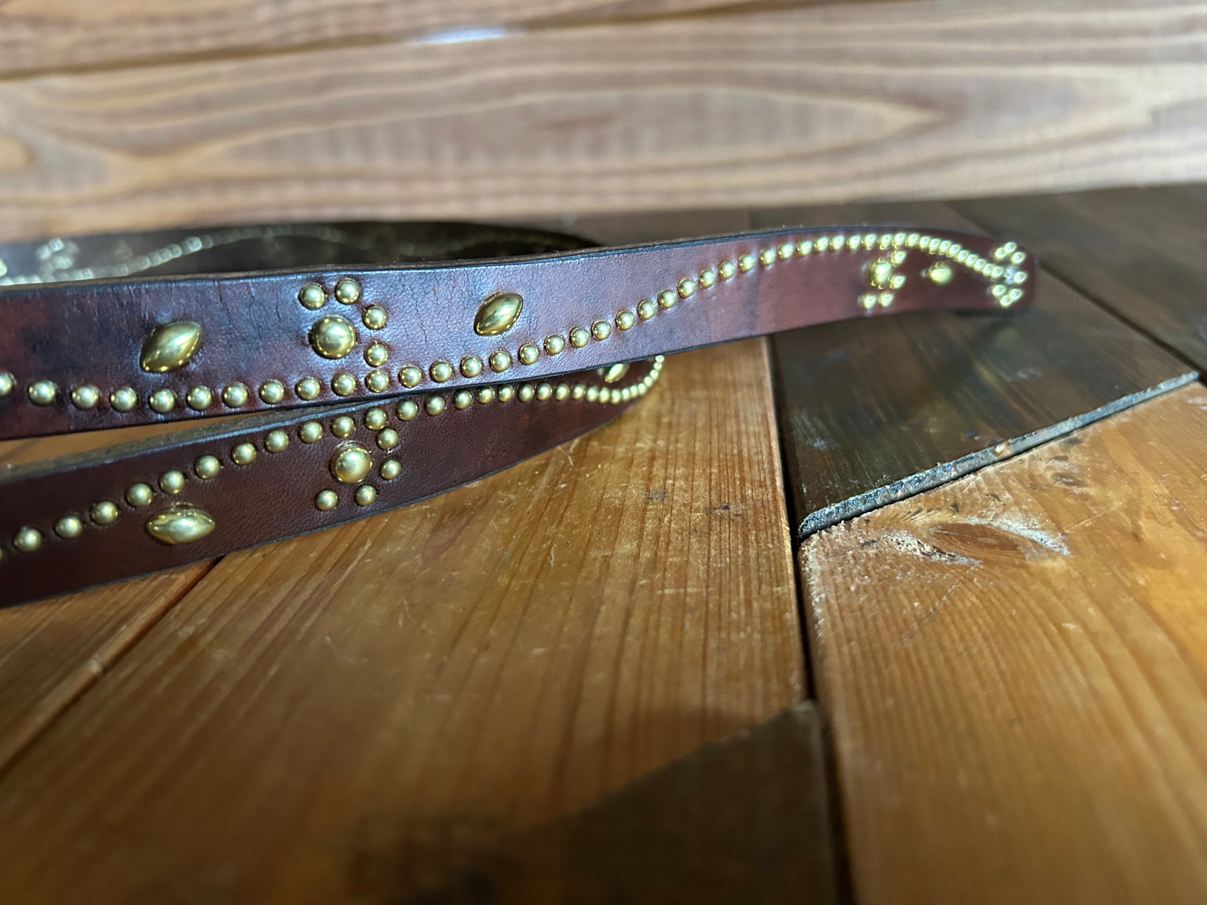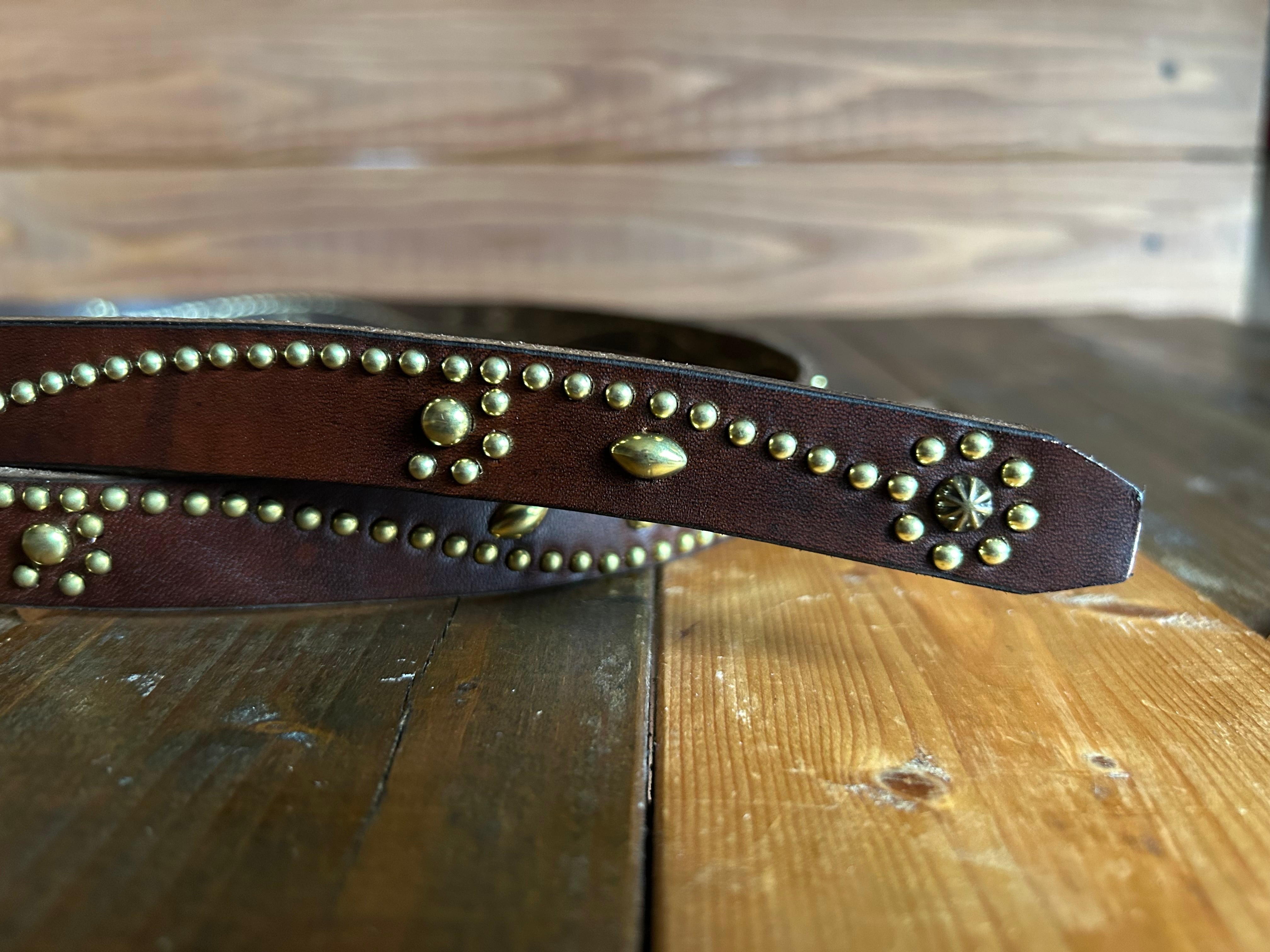 ダークブラウンのベルト全体にアラベスク柄をゴールドスタッズで施したケンサキ40cmのナローベル