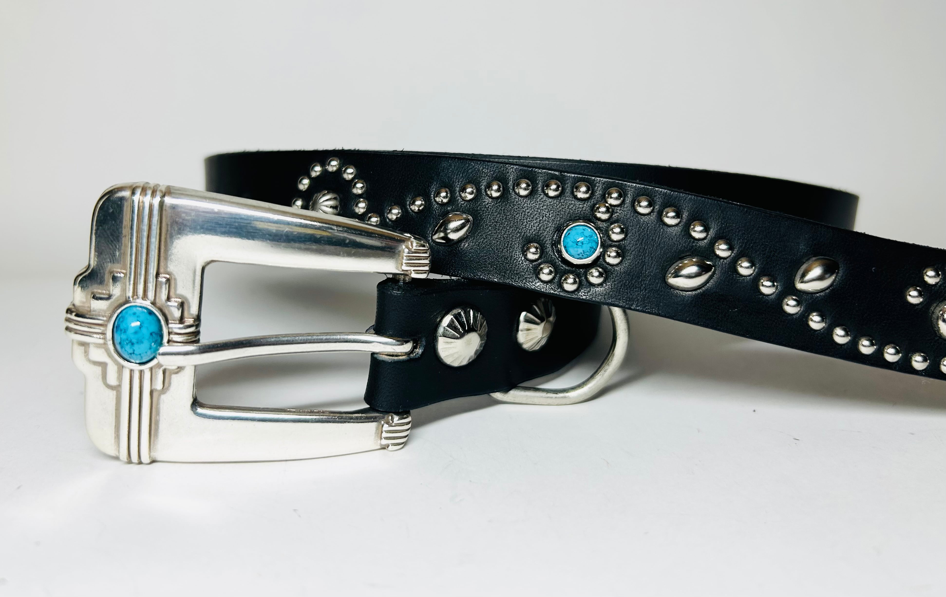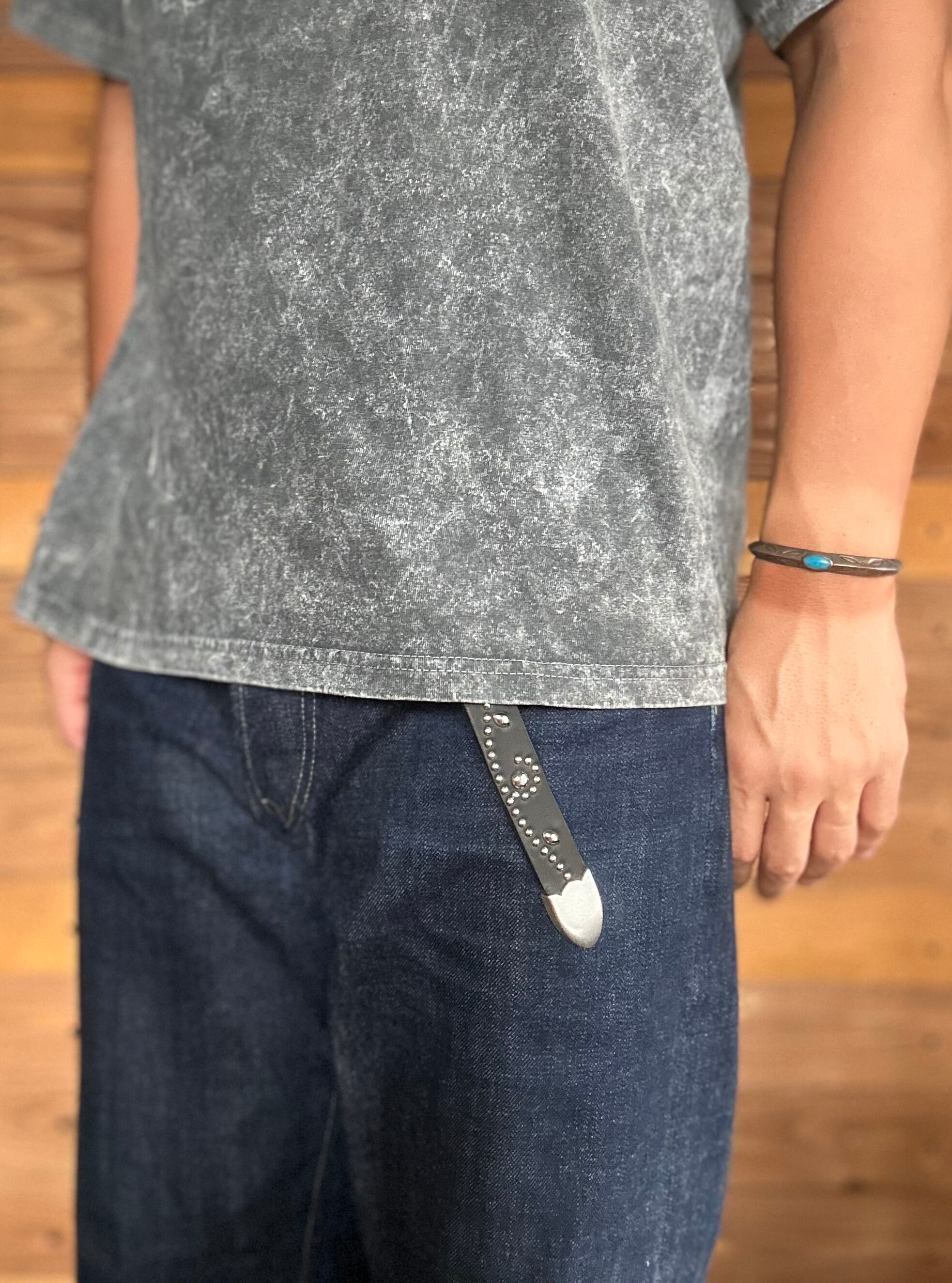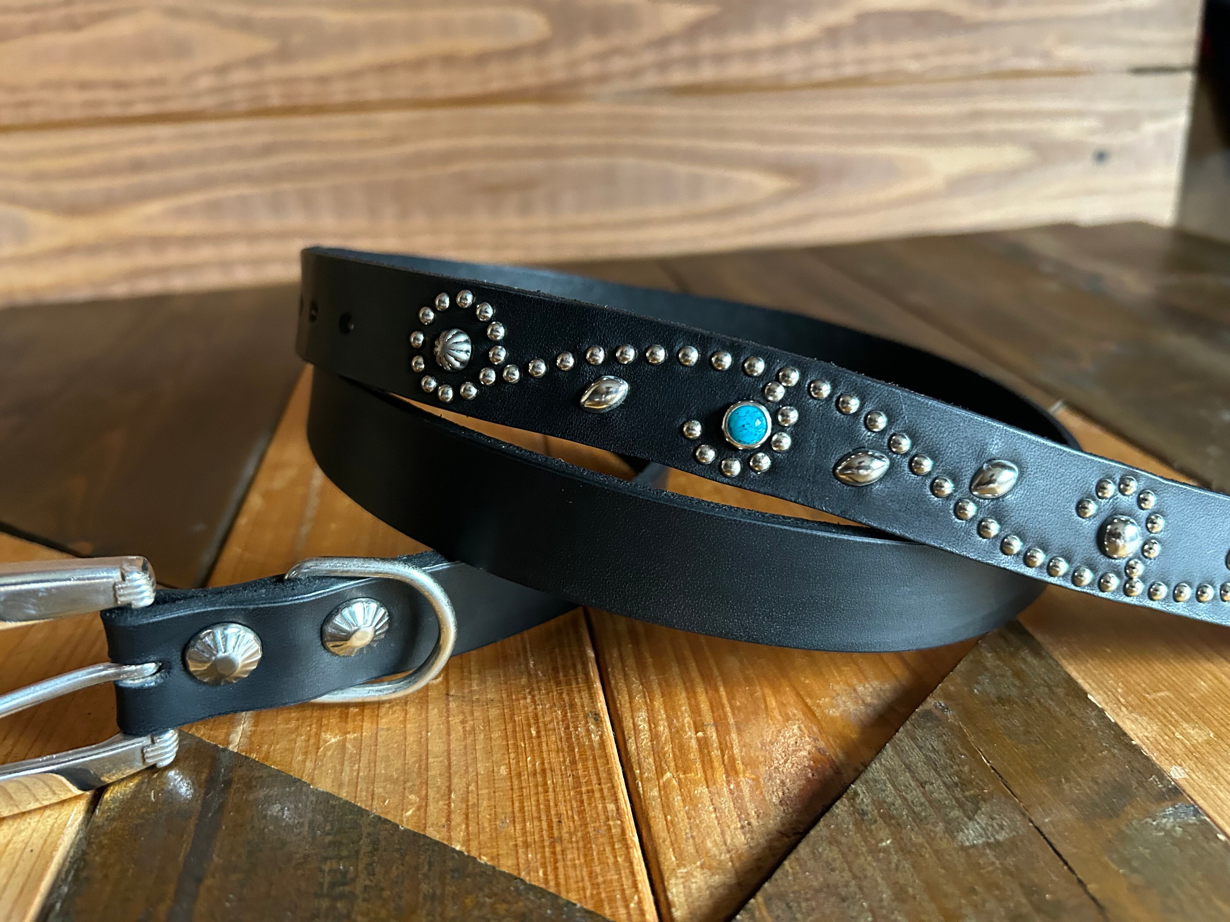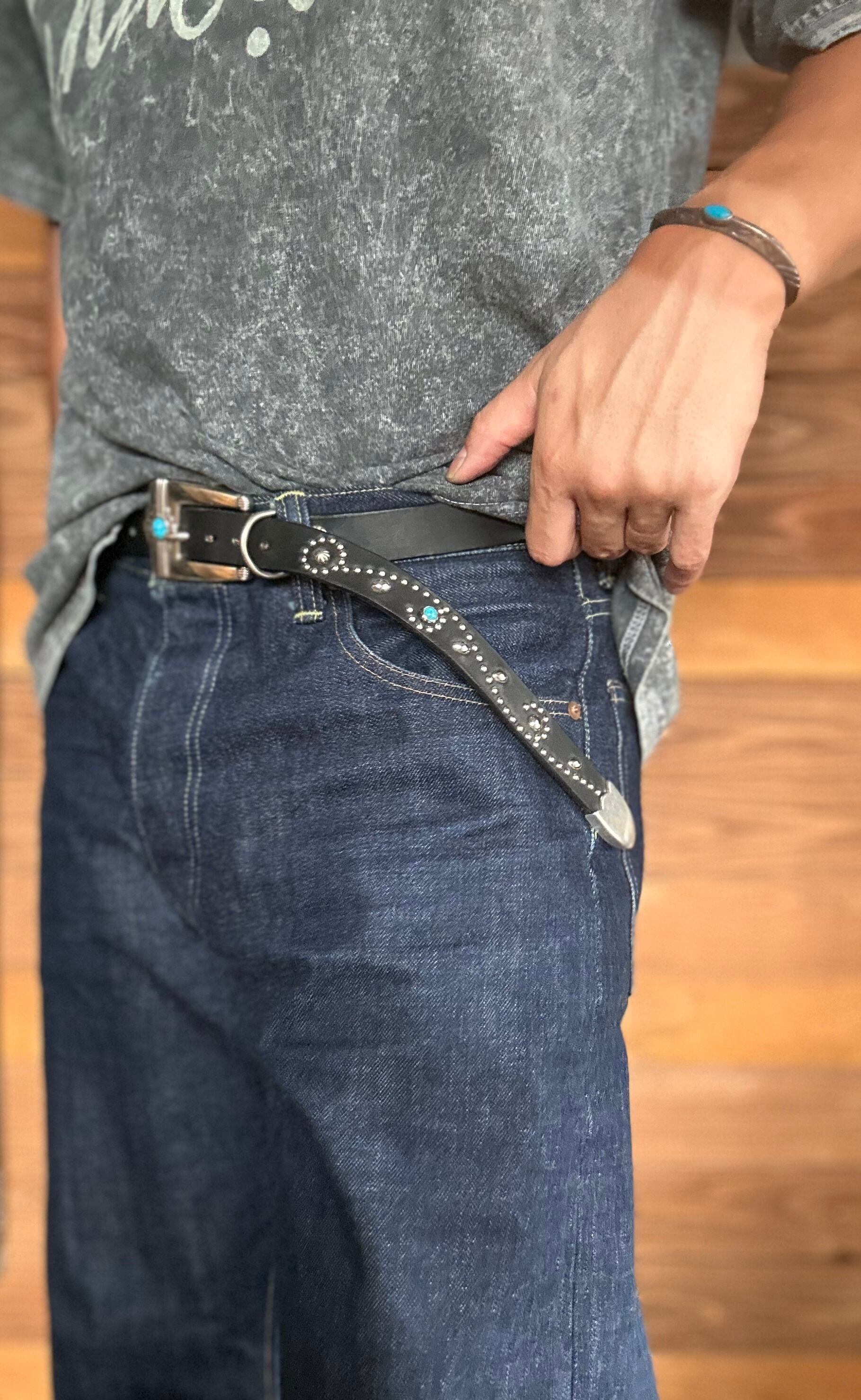 プレーン剣先金具、ターコイズウエスタンバックルを採用した剣先のみにアラベスクスタッズを施したケンサキ24センチのウエスタンナローベルト。
