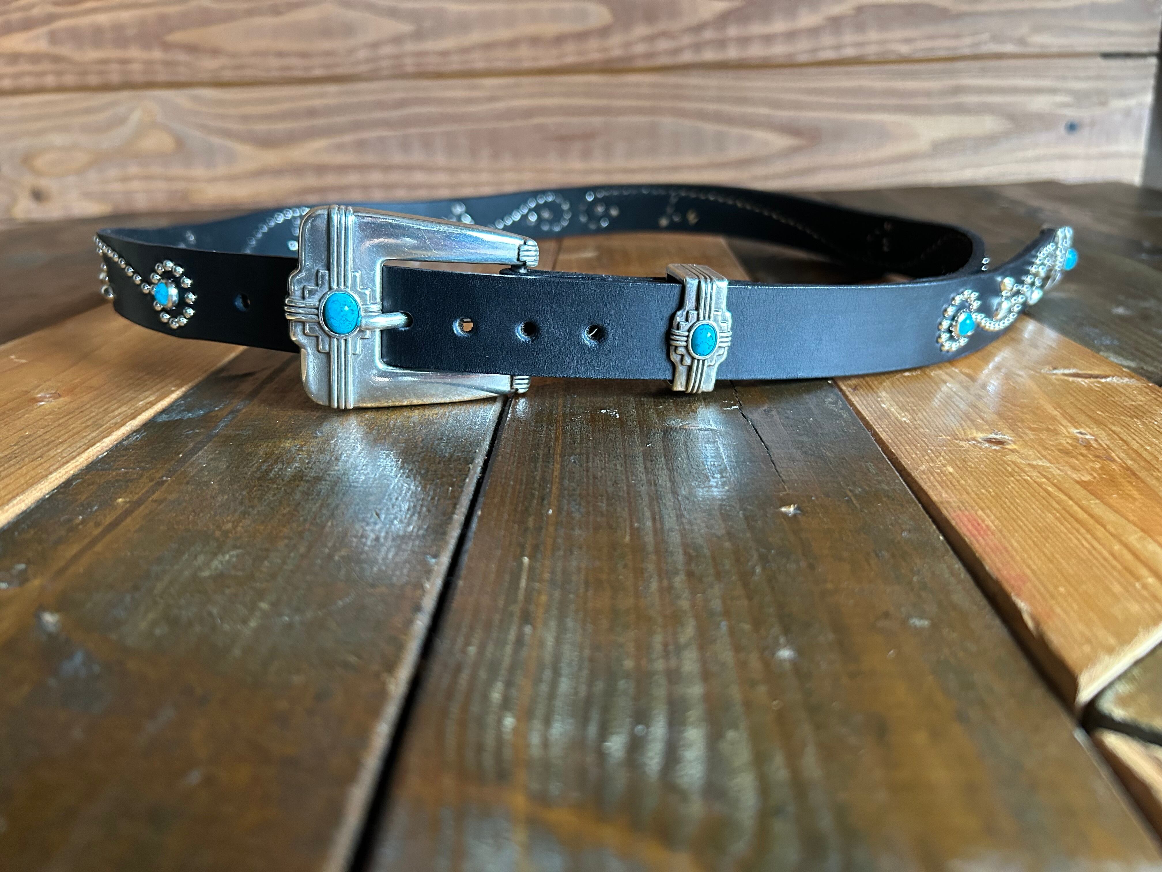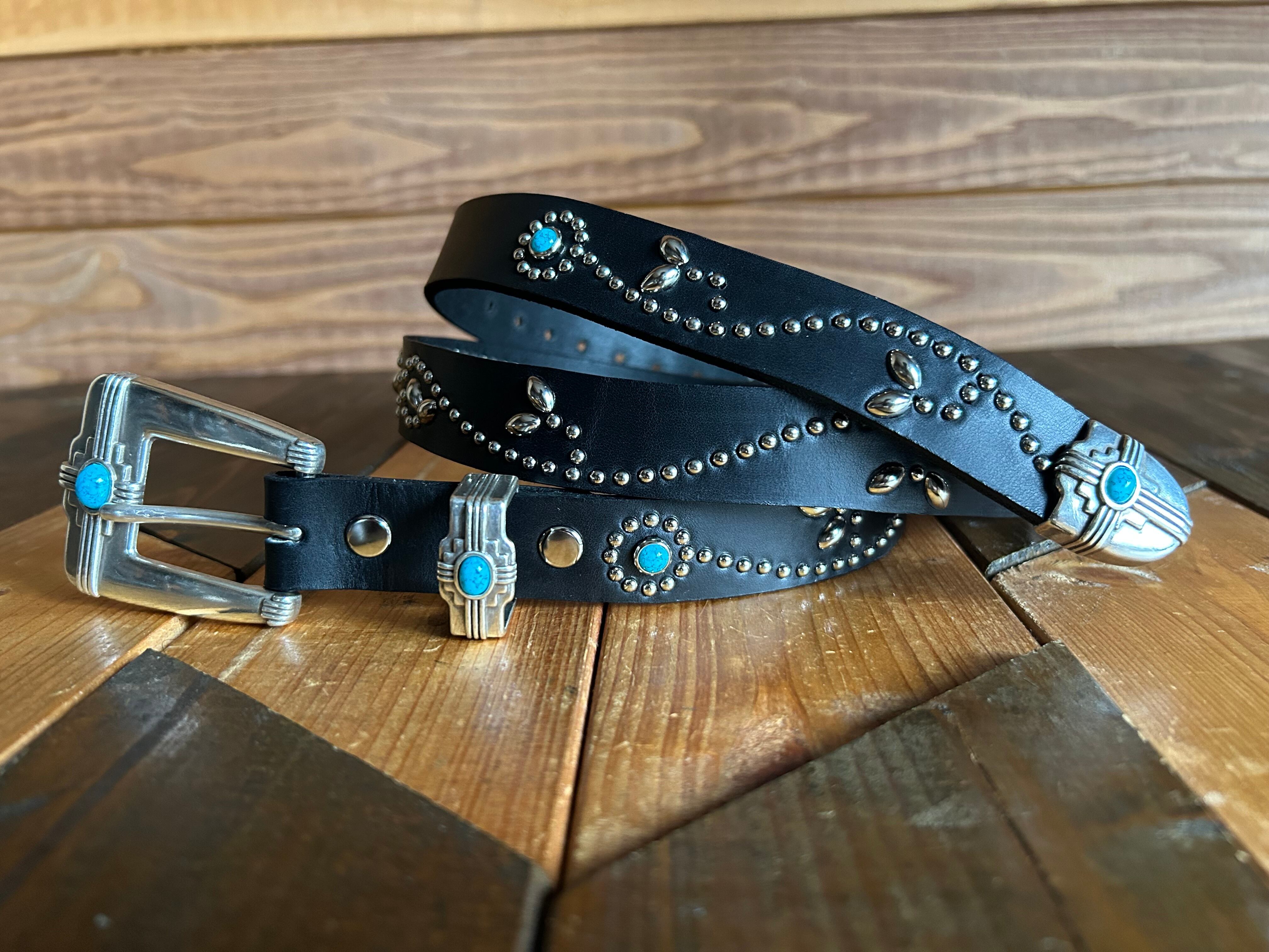 剣先26cmのスリーピースウエスタンナローベルト。ターコイズを採用したスリーピースバックルが特徴的なベルトは胴回り、剣先に反映や繁盛を意味する柄のアイビーアラベスク(蔦)を施しています。