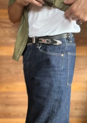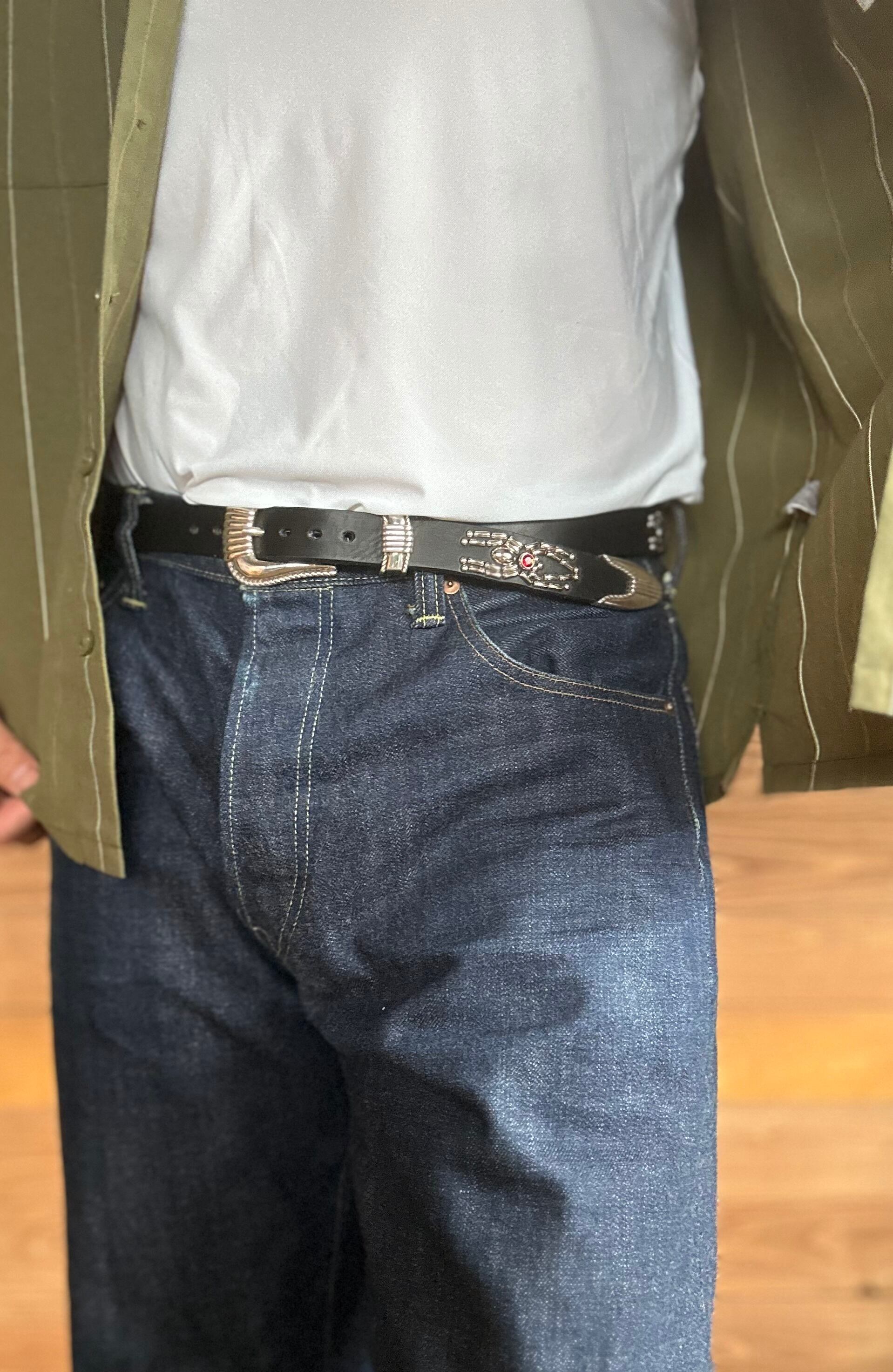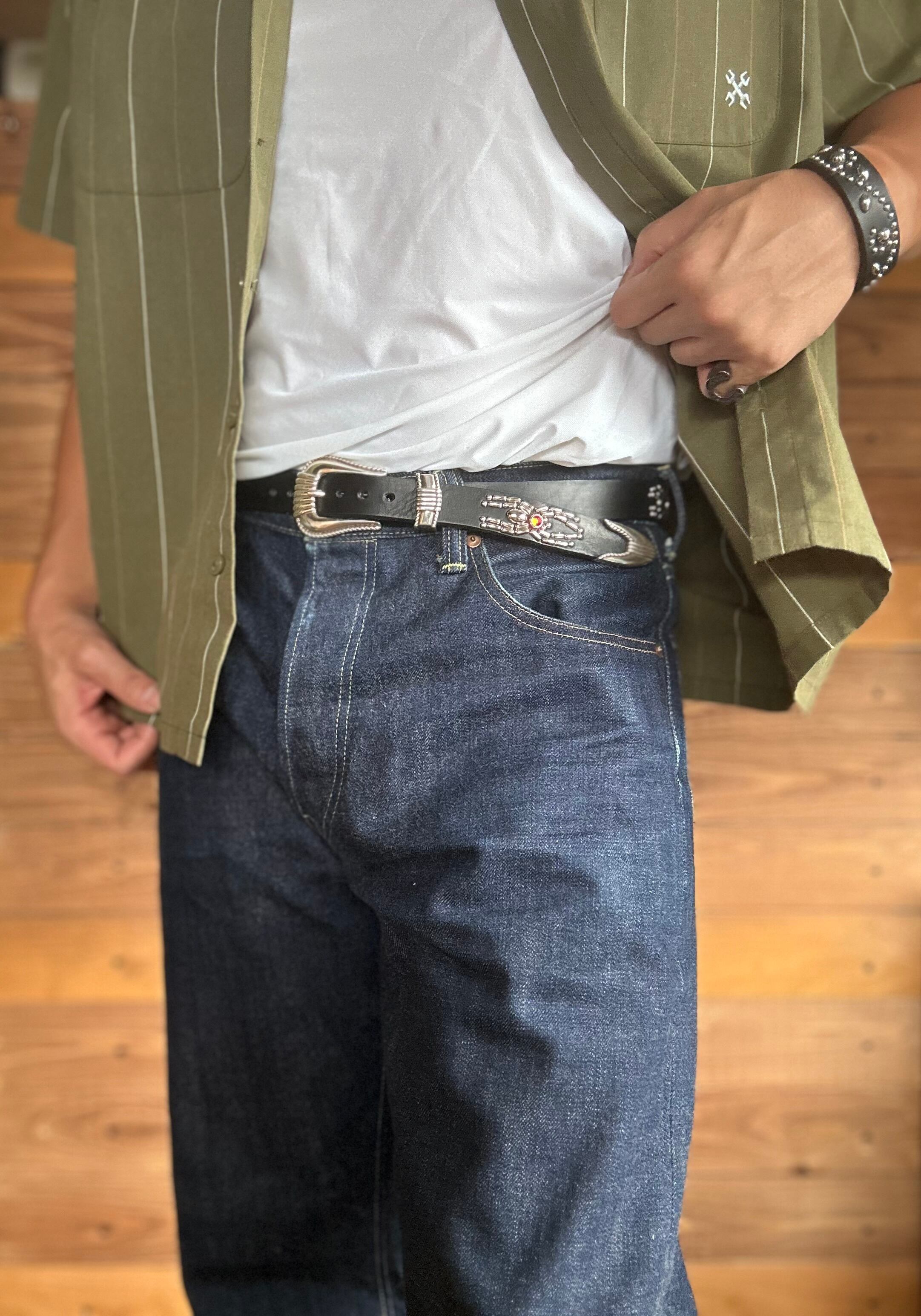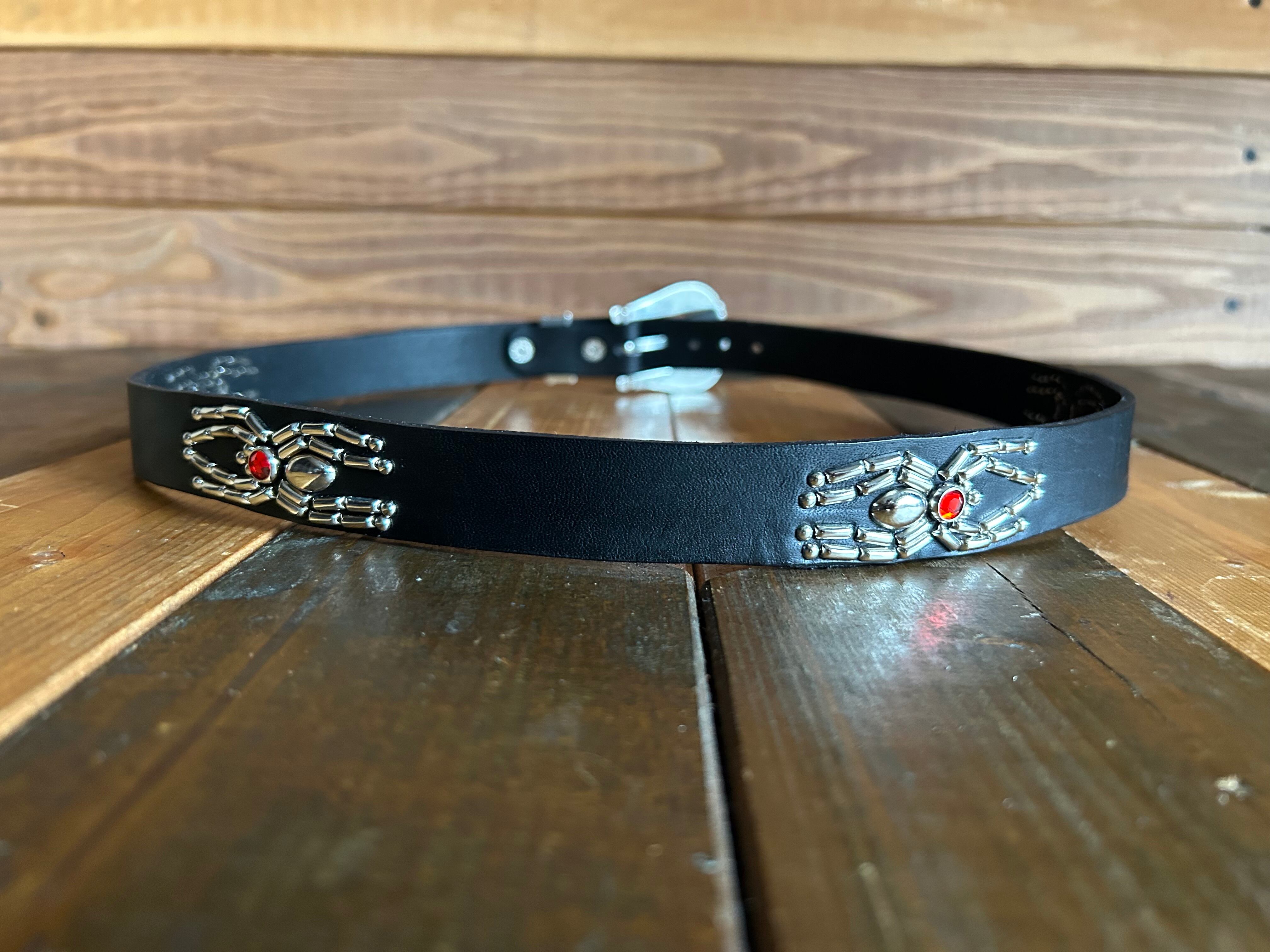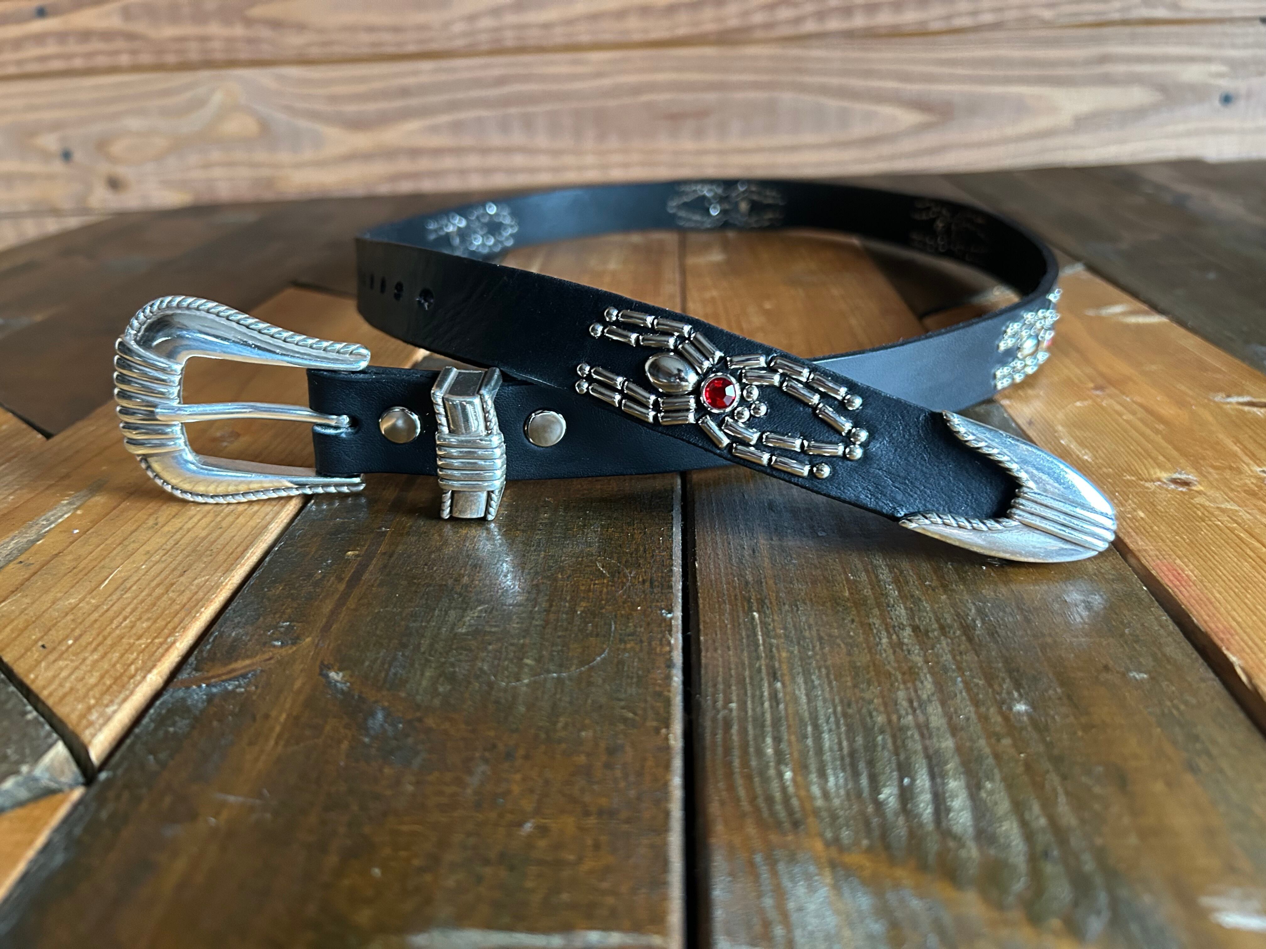 ローピングスリーピースバックルを採用し剣先とウエスト部にスパイダーデザインを施したウエスタンスタッズベルト。※ローピングスリーピースバックルには限りがありますので数量限定となります。バックルの留め具はスナップボタン式ですので取り外しが可能です。