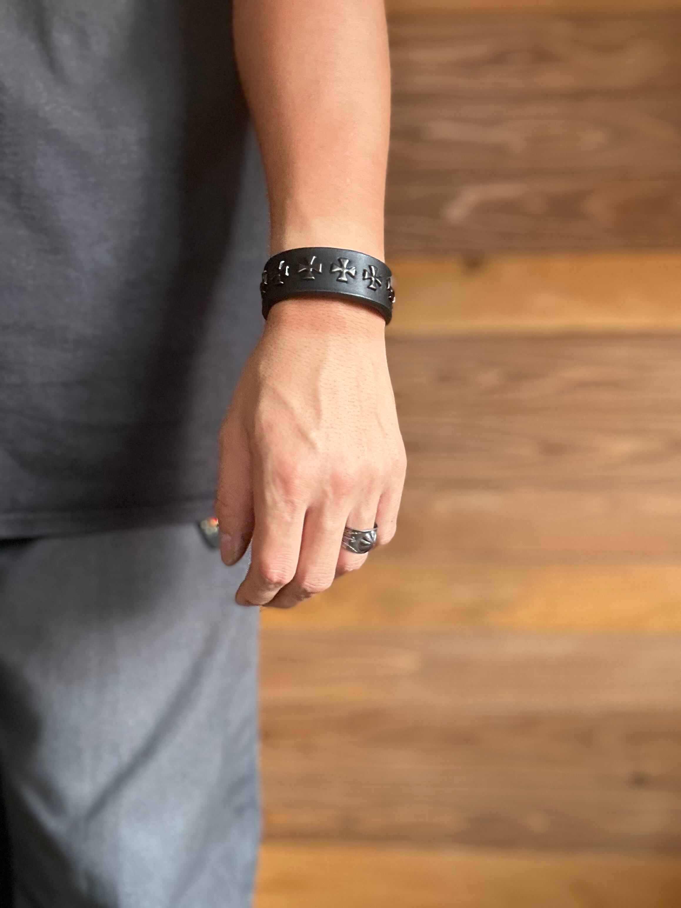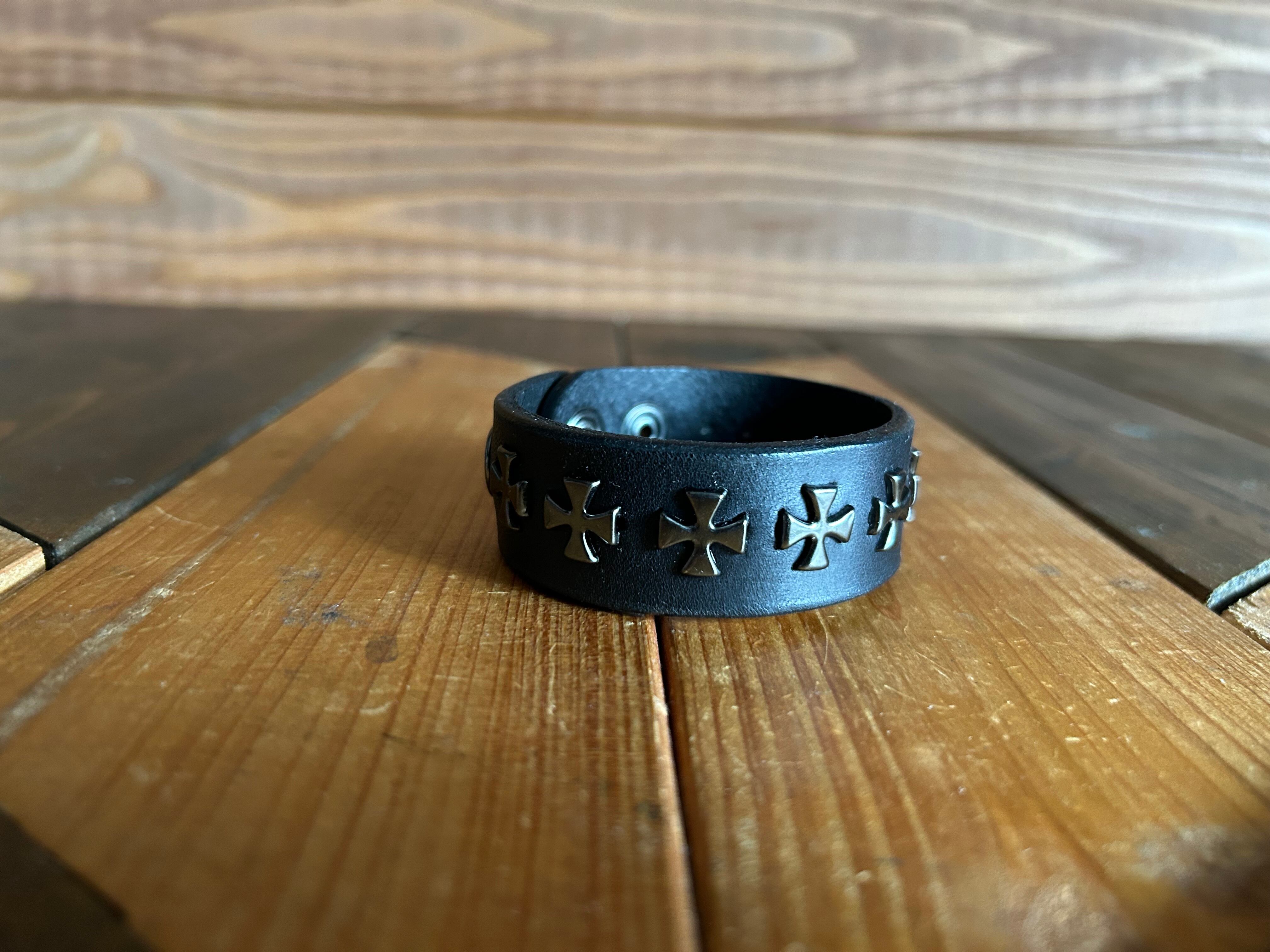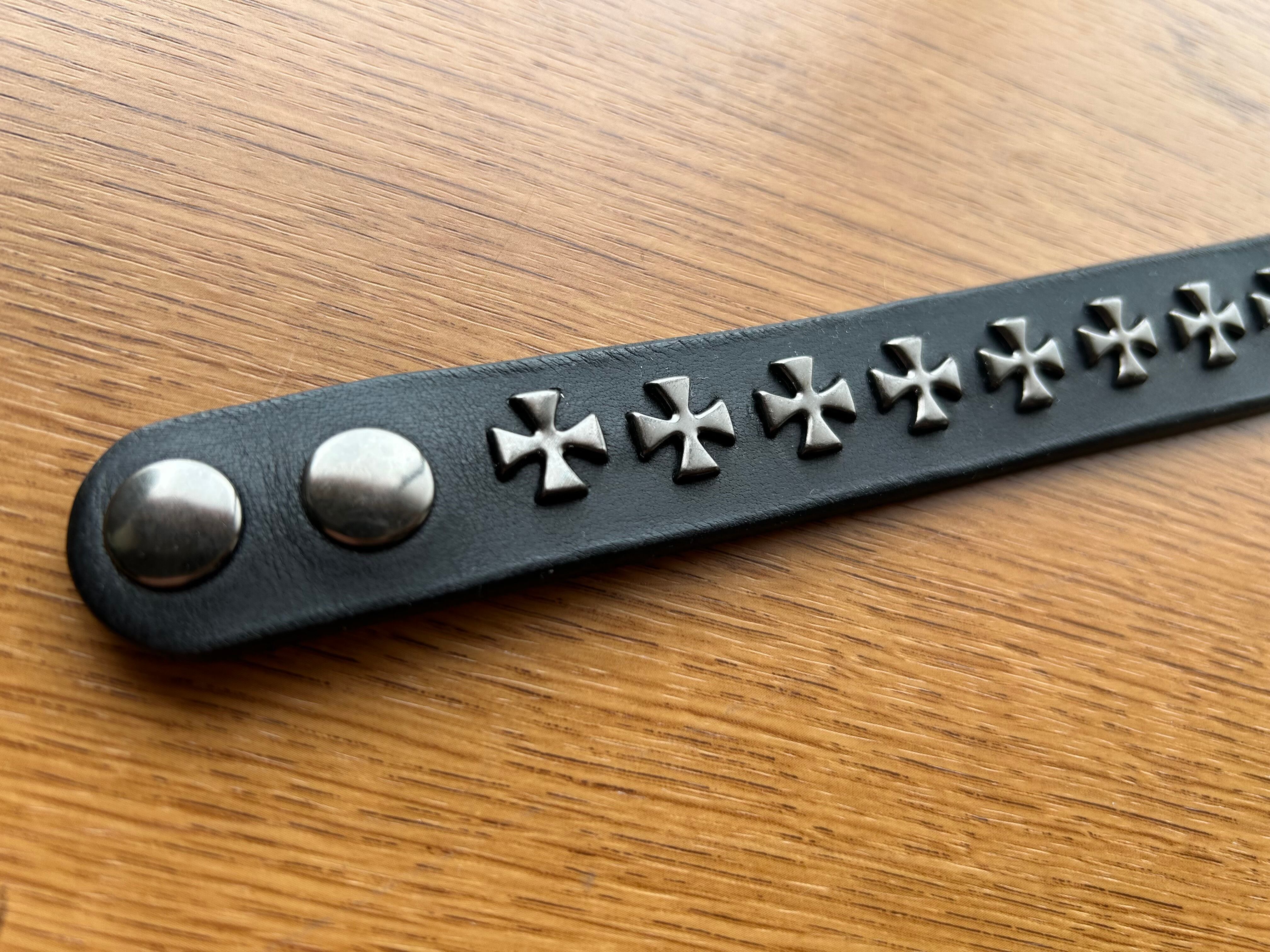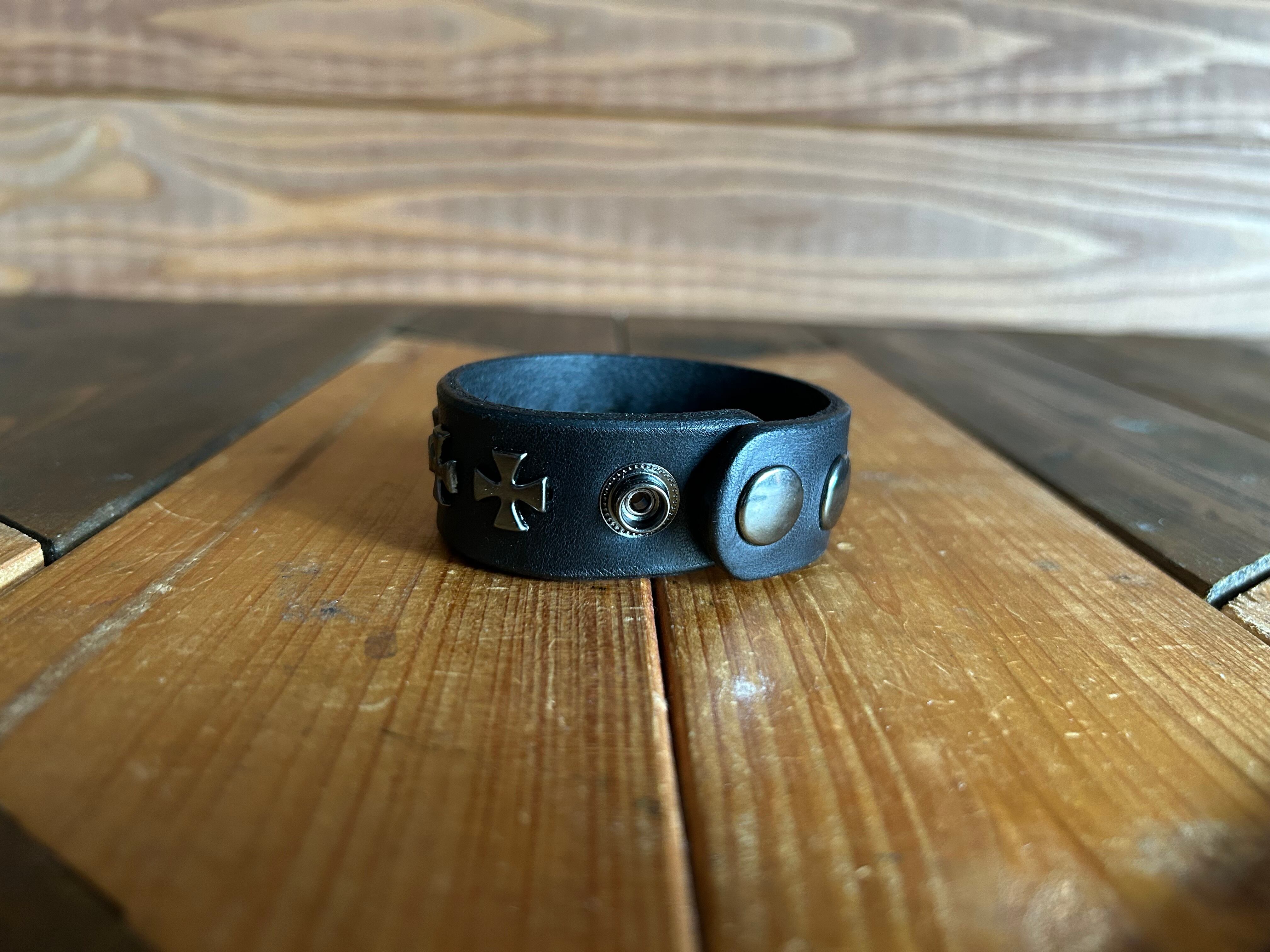 ブラックカラーのアイアンクロススタッズを9つ使用したブレスレット、スナップもブラックカラーで統一したモデル。ダブルスナップボタンによりサイズが調整できます。お問い合わせ頂ければ他のサイズもご希望のサイズでオーダー可能です(無料)