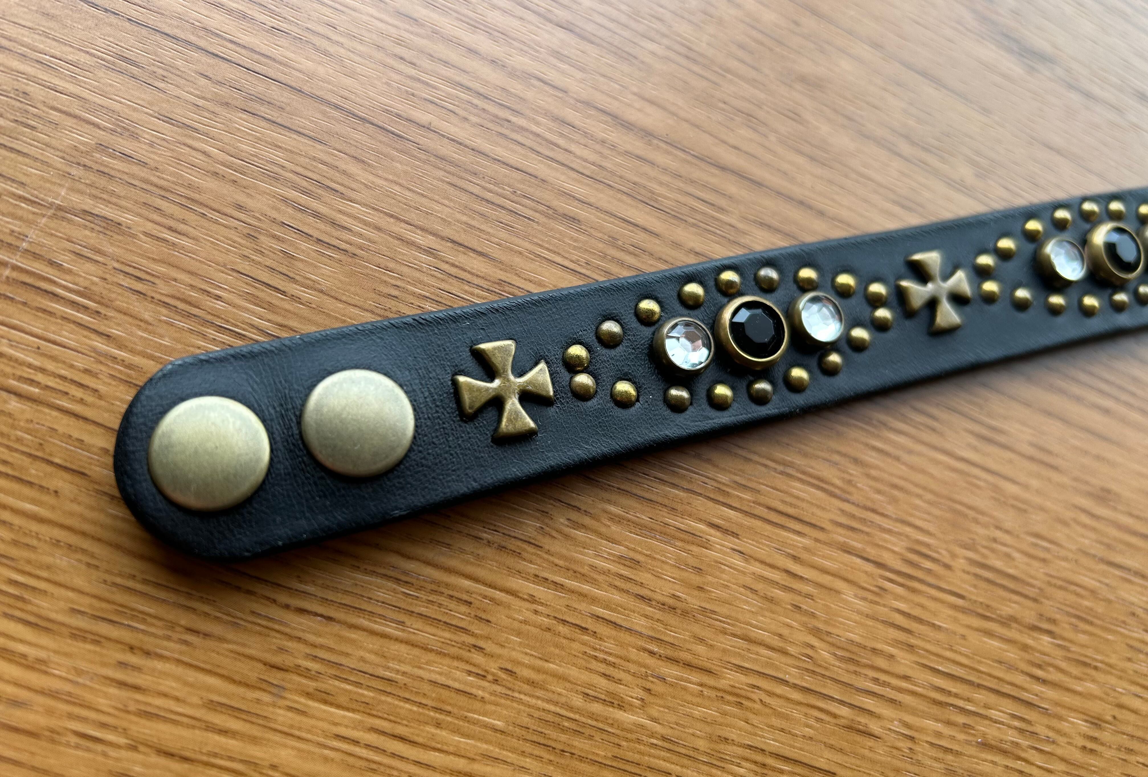 アンティークブラススタッズ、ブラックストーン、クリアストーンを使用したブレスレット、アイアンクロス、ストーン枠、金具の全てアンティークブラスを使用したモデル。ダブルスナップボタンによりサイズが調整できます。お問い合わせ頂ければ他のサイズもご希望のサイズでオーダー可能です(無料)