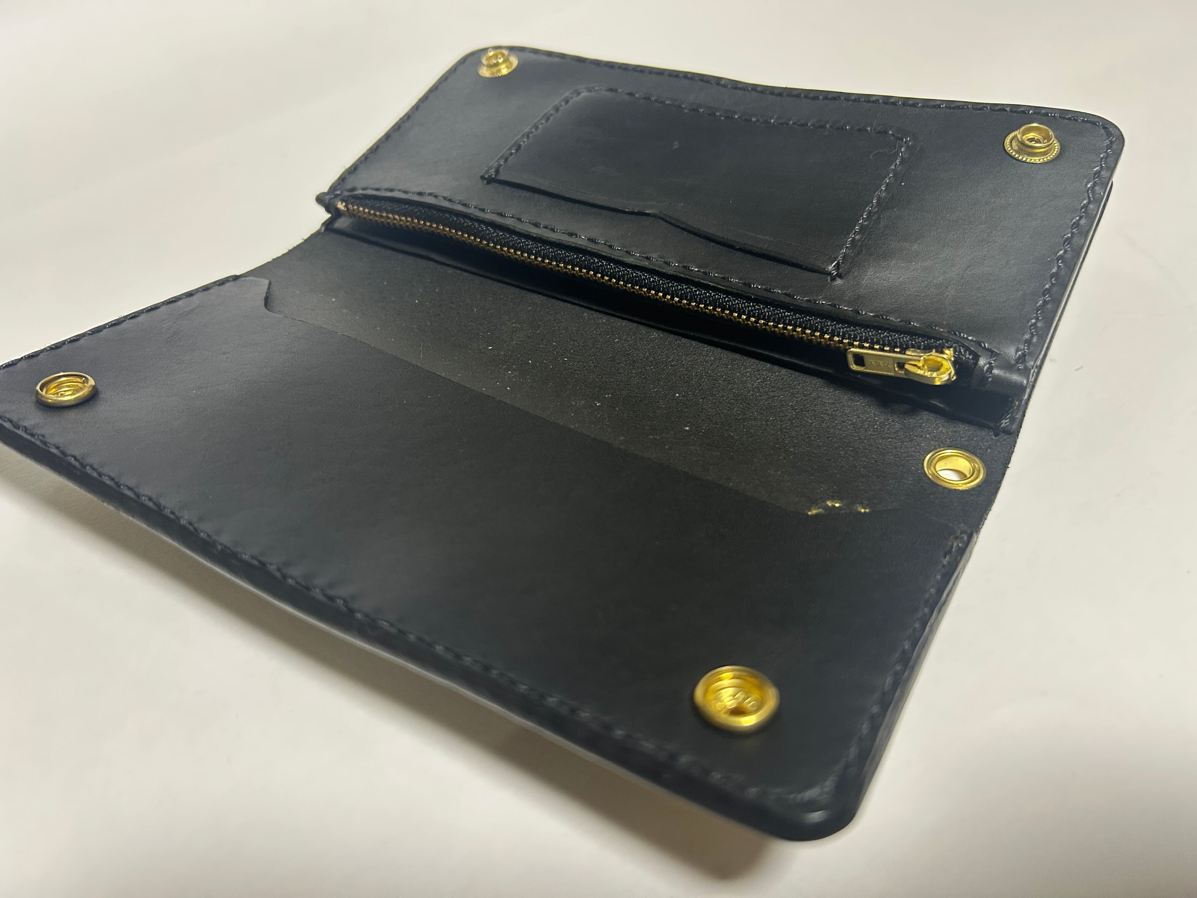 金具、スタッズ全てゴールドブラス(真鍮)を使用したロングトラッカーウォレット。