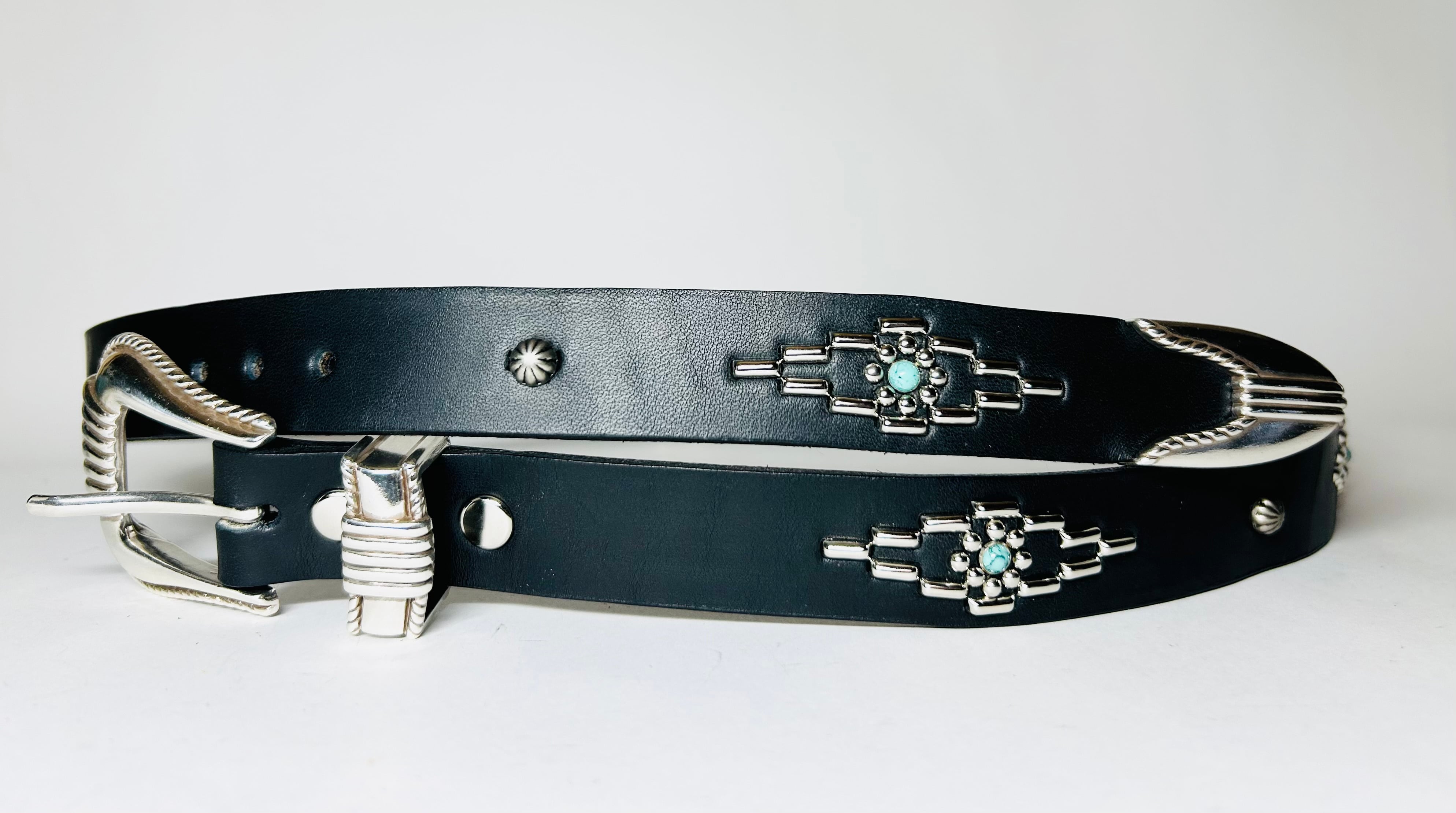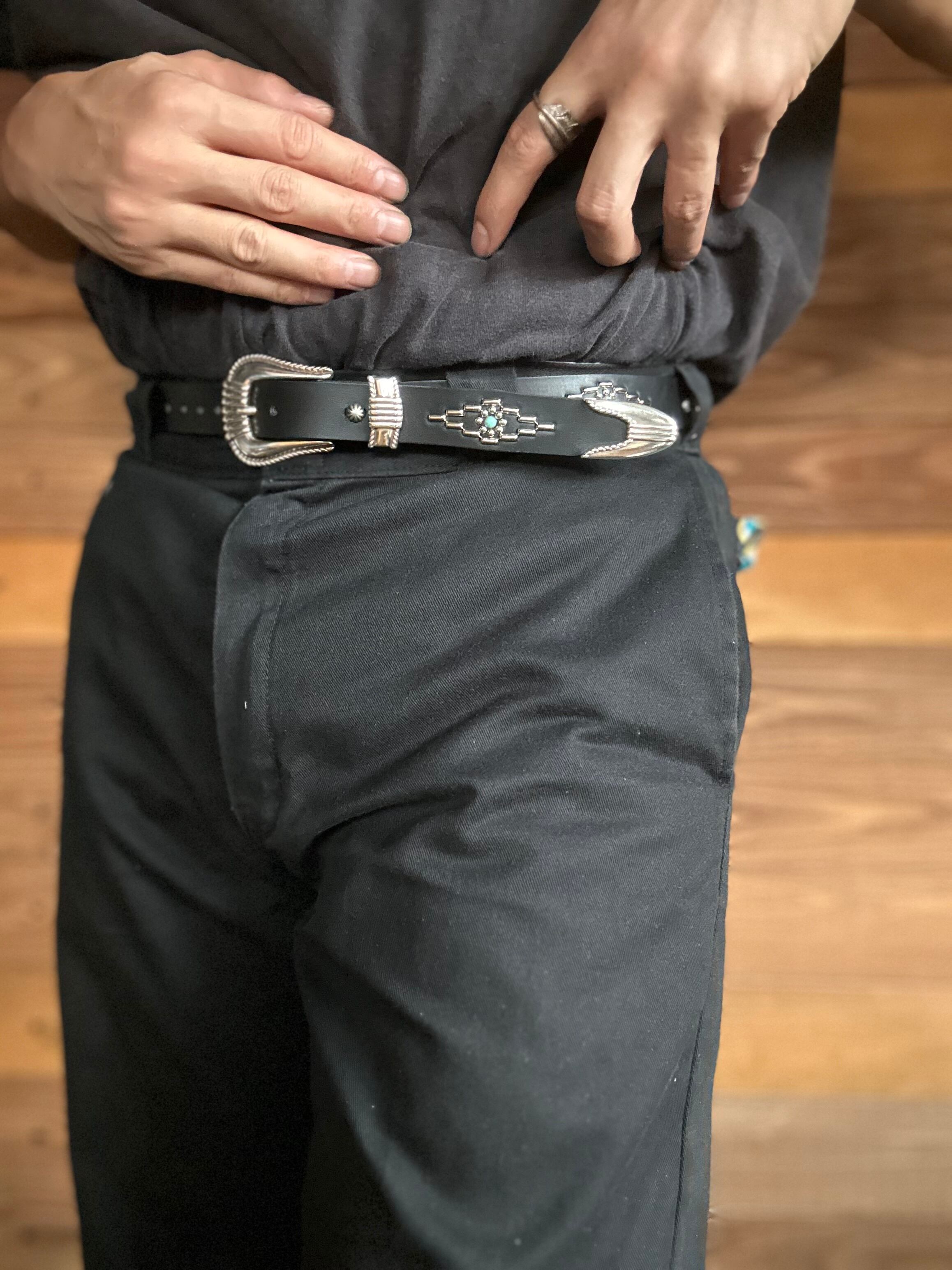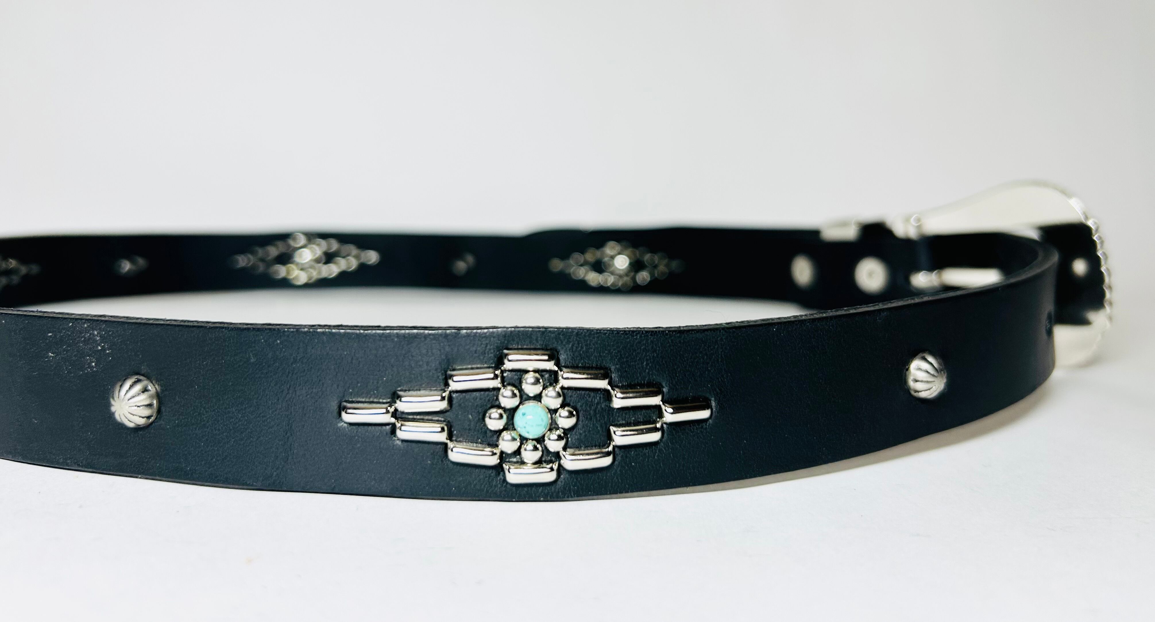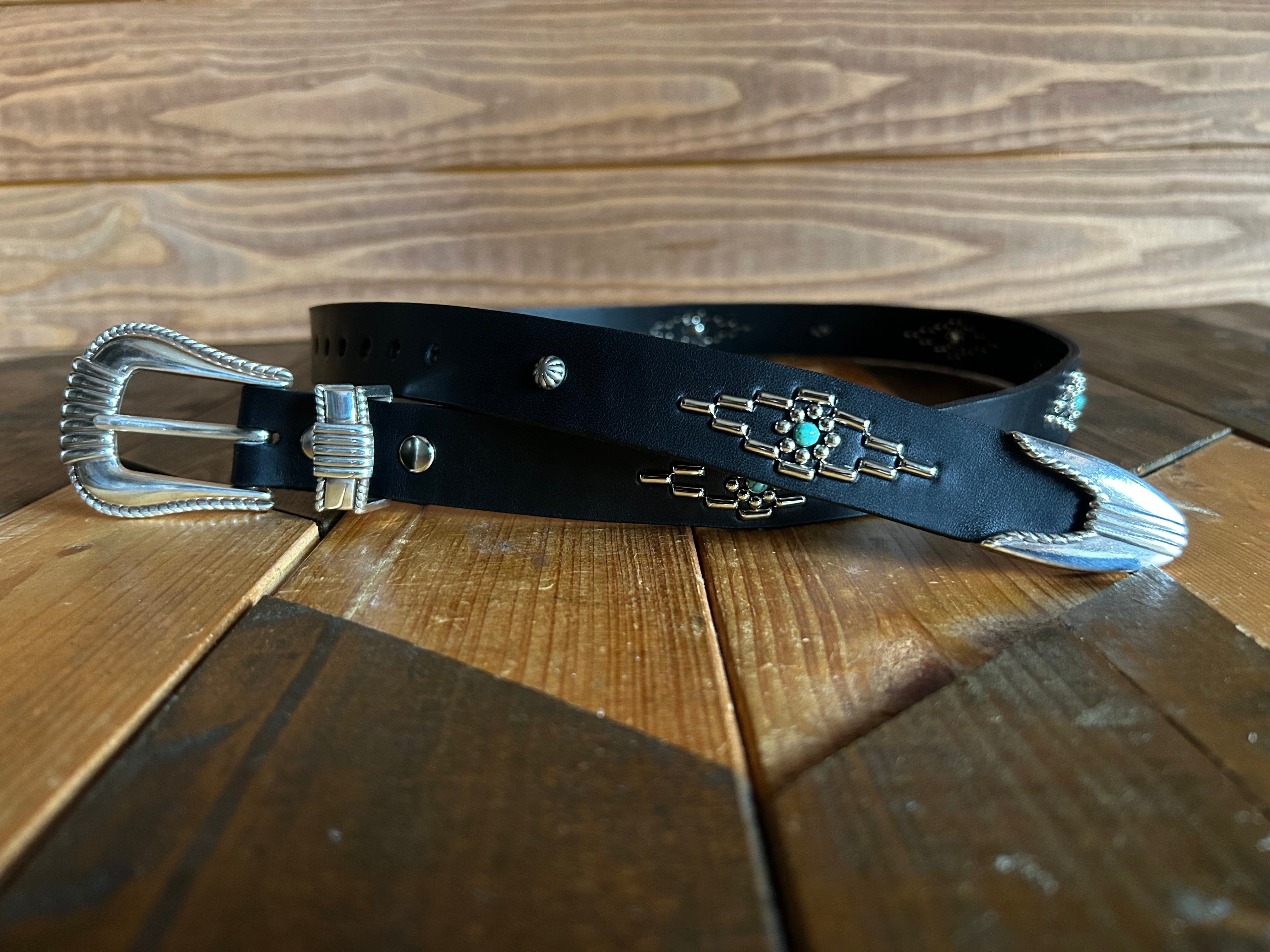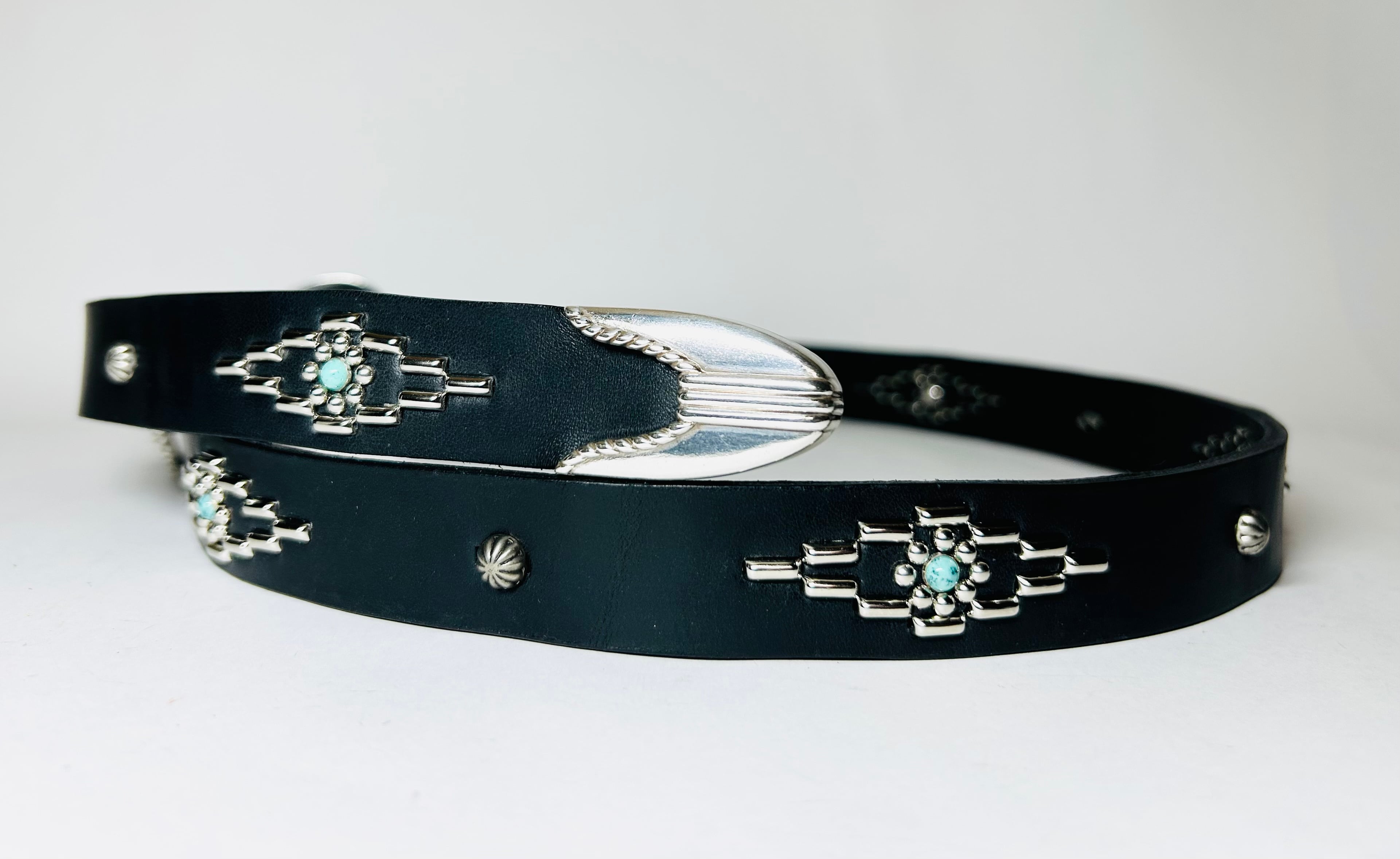 ベルト全面の360度にチマヨ模様、オルテガデザイン(グリーンターコイズ)とアポロスタッズを施したスタッズベルト。バックルの留め具はスナップボタン式ですので取り外しが可能です。