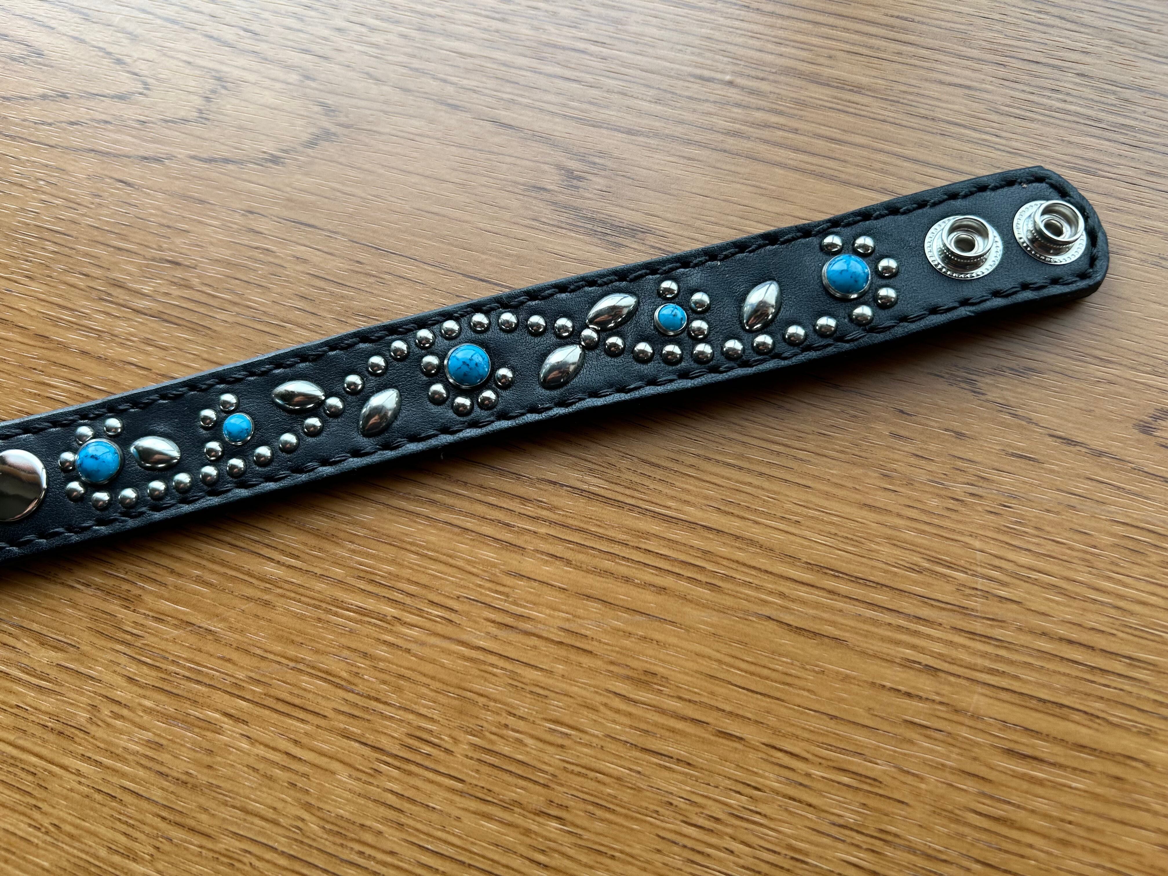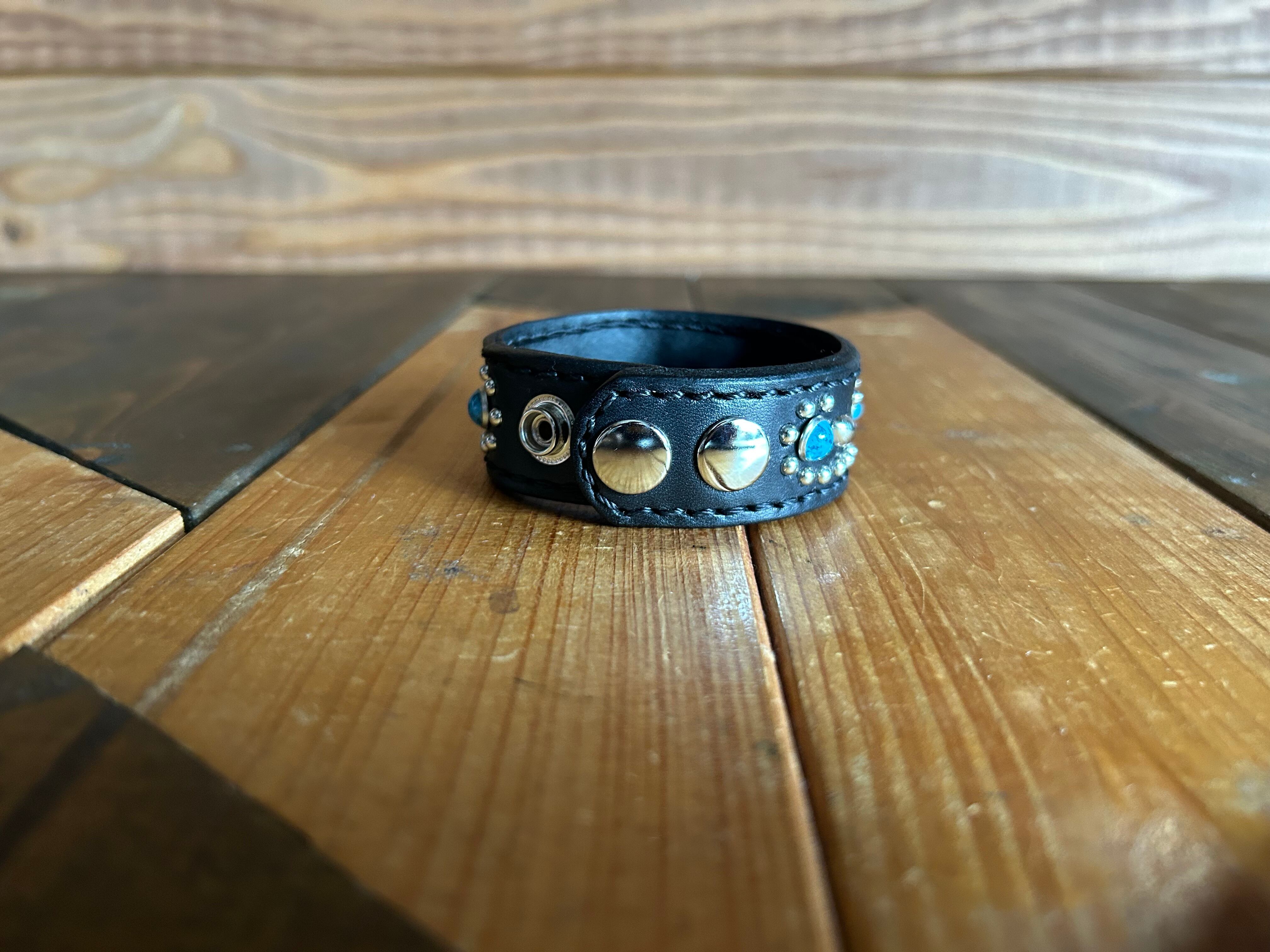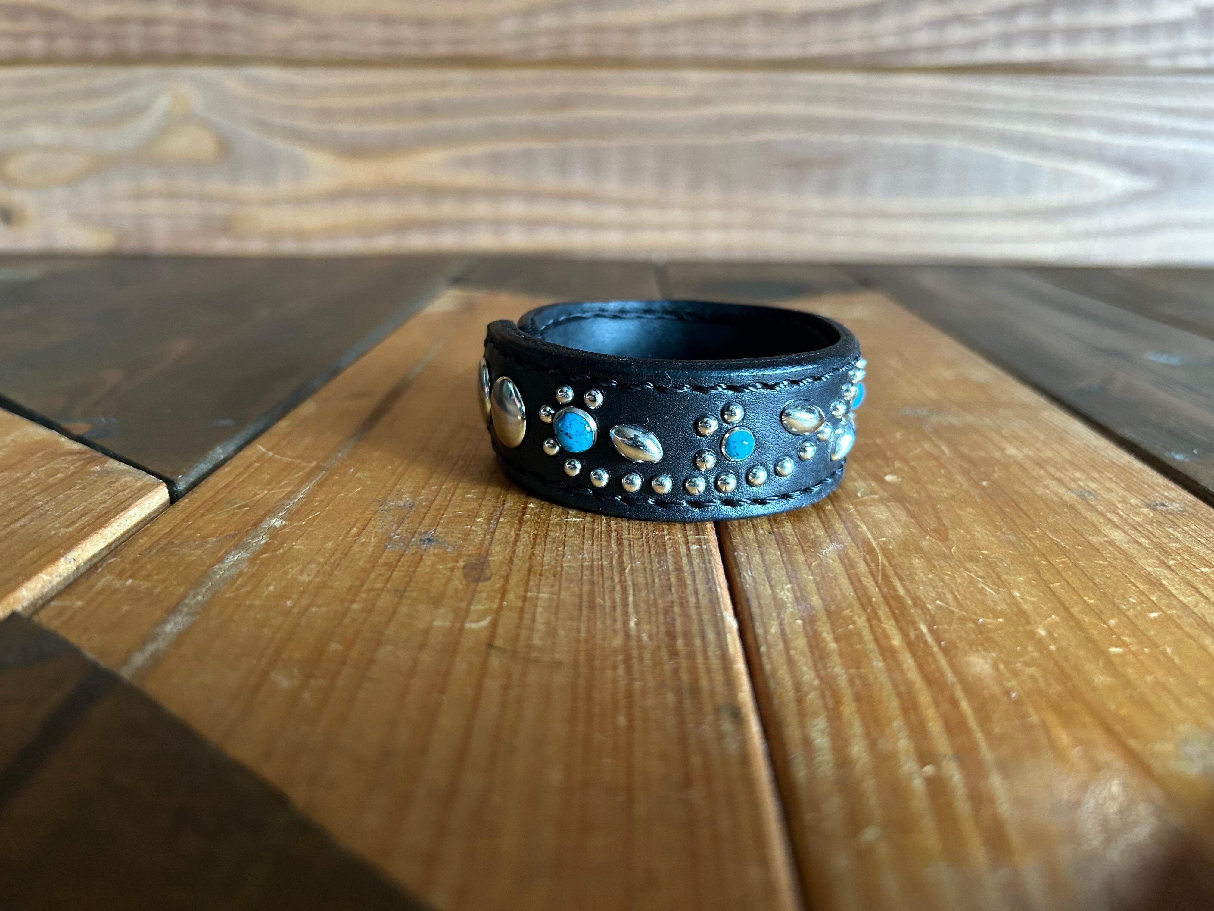 ターコイズスタッズでアラベスクをデザインしたブレスレット。内張(内側にも革)をしているので肌にスタッズが直接当たらず着ける事できます。シルバーアレルギーの方にもおすすめです。フリーサイズ、内周:約18cm 〜22cmダブルスナップボタンによりサイズが調整できます。お問い合わせ頂ければ他のサイズもご希望のサイズでオーダー可能です(無料)