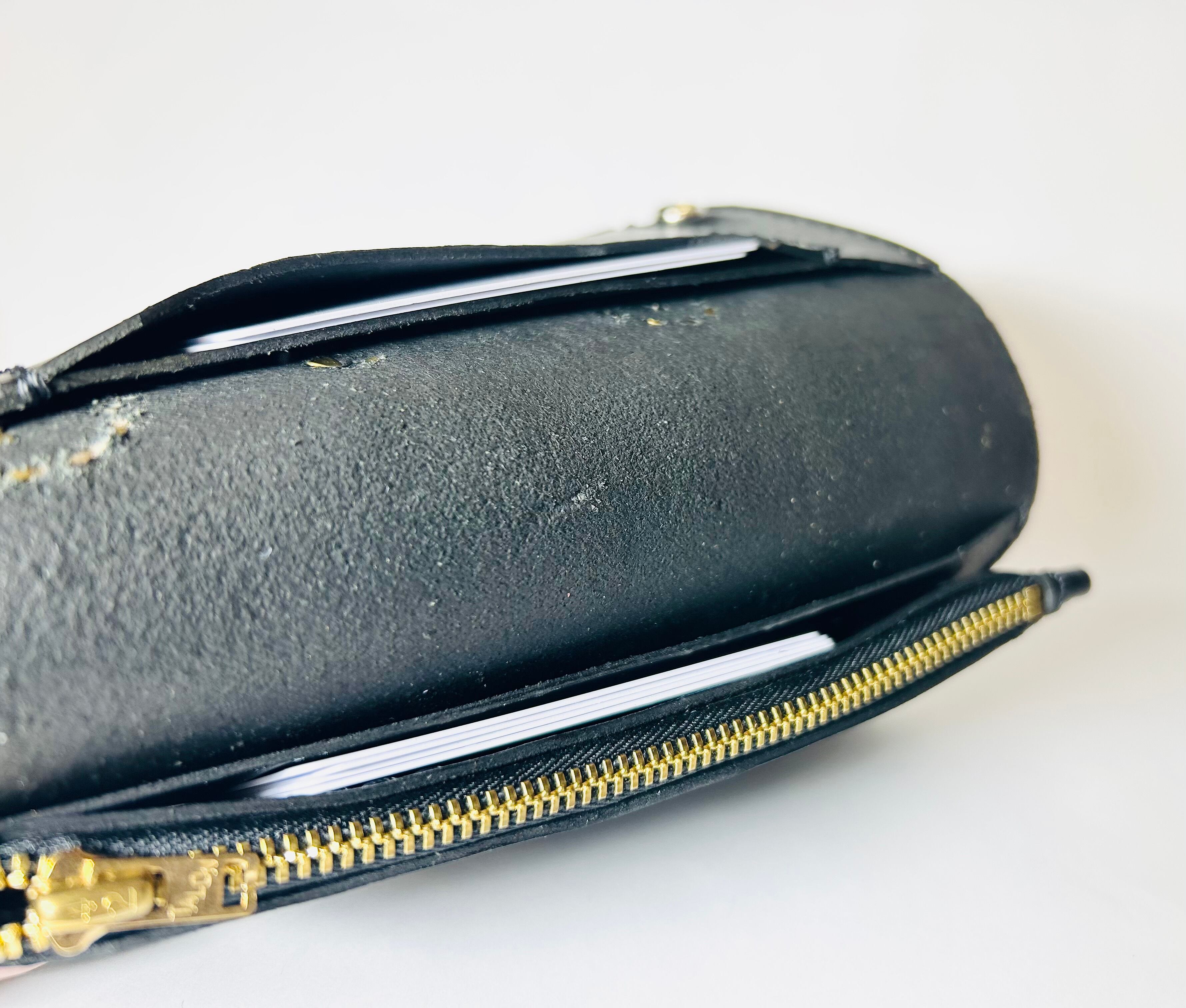 カード収納も充実していて、コインポケットの表側、フラップの裏、そして隠しカード入れの3箇所に分かれています。各所に合計2〜3枚、最大で10枚のカードを余裕を持って収めることが可能です。ジッパーには「タロンジッパー」を使用しており、1960年代アメリカのヴィンテージな風合いが魅力です。この「42Talon」は、画期的なジッパーとして名を馳せています。