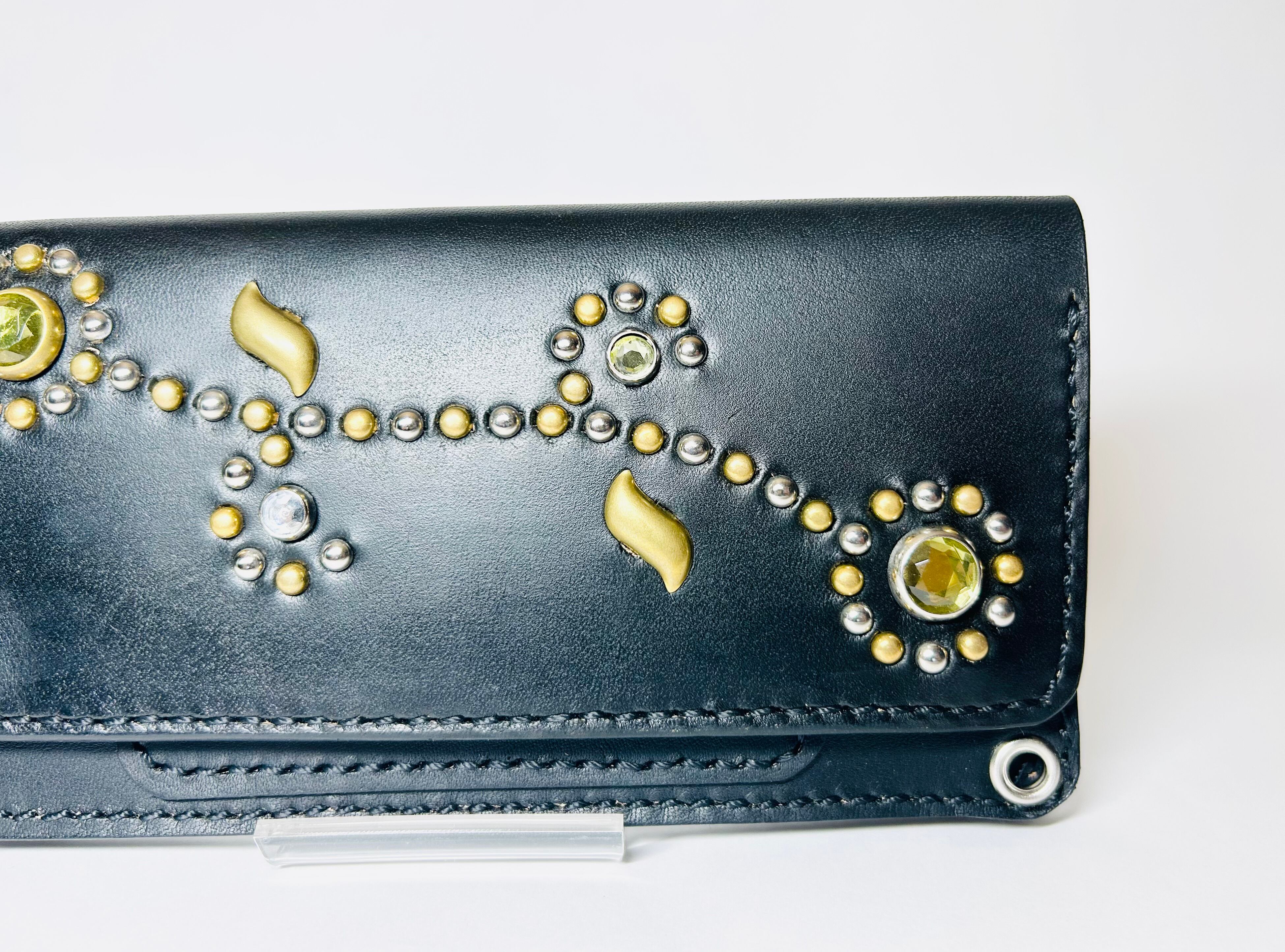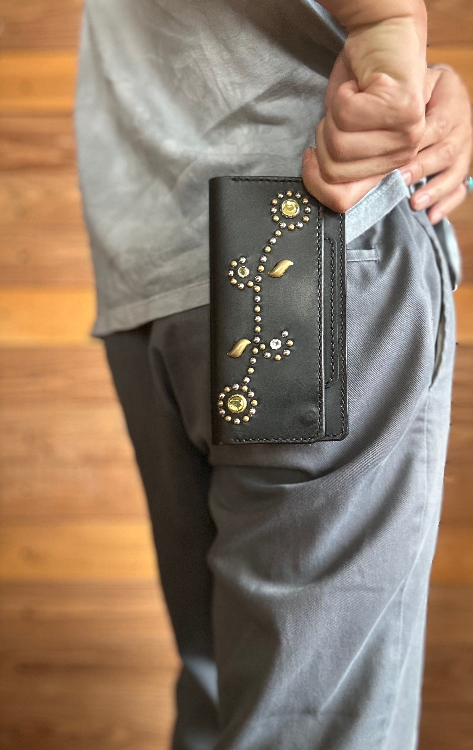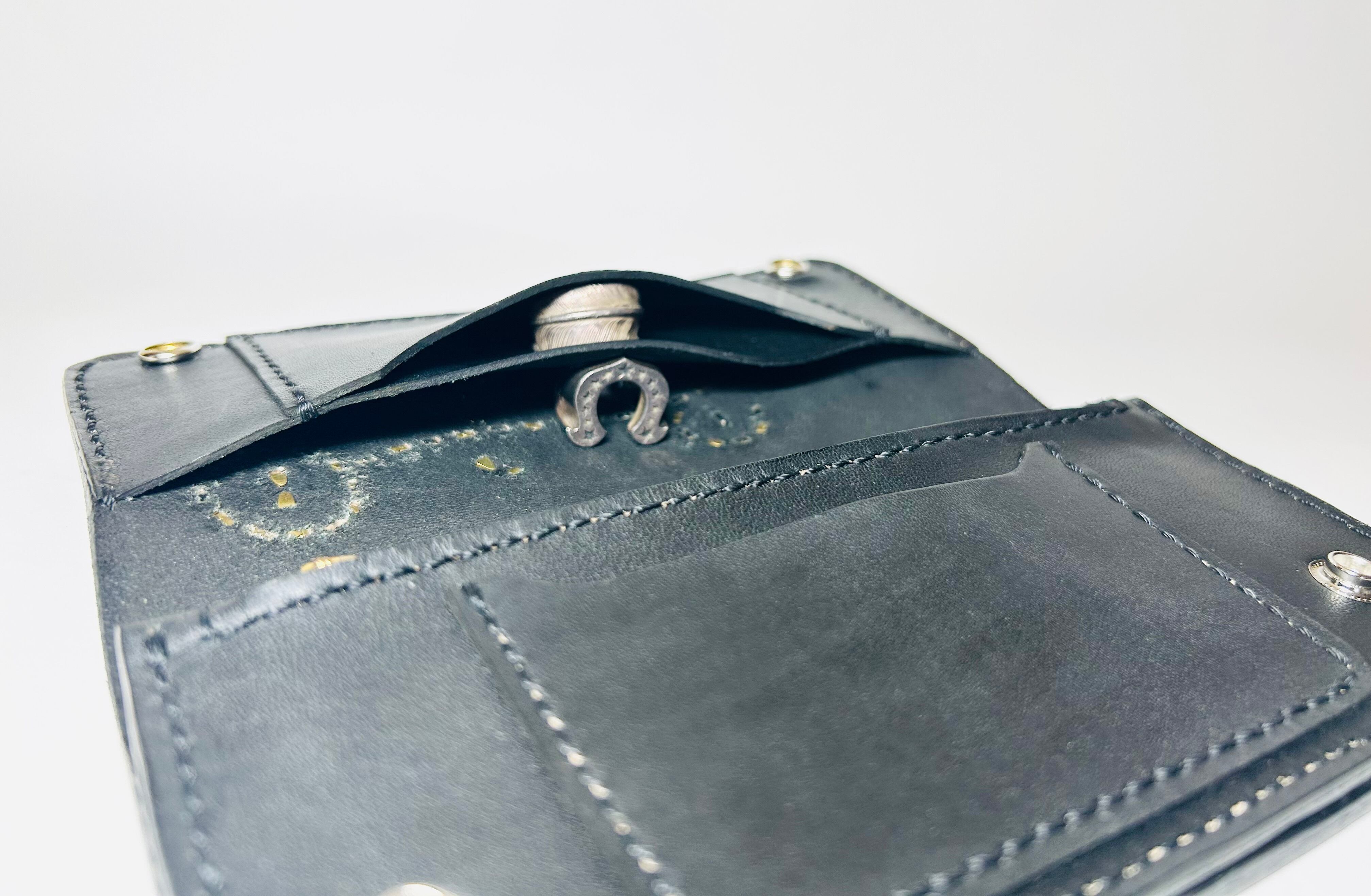 太陽と炎をイメージしたデザインのロングトラッカーウォレット。横幅19cmで、1万円札も畳まずに収納できます。ショートフラップのデザインは、ウォレットチェーンを通す穴が見える扱いやすい仕上がり。バックポケットに収納した際には、財布の頭がポケットから覗くため、視覚的なアクセントを加えます。