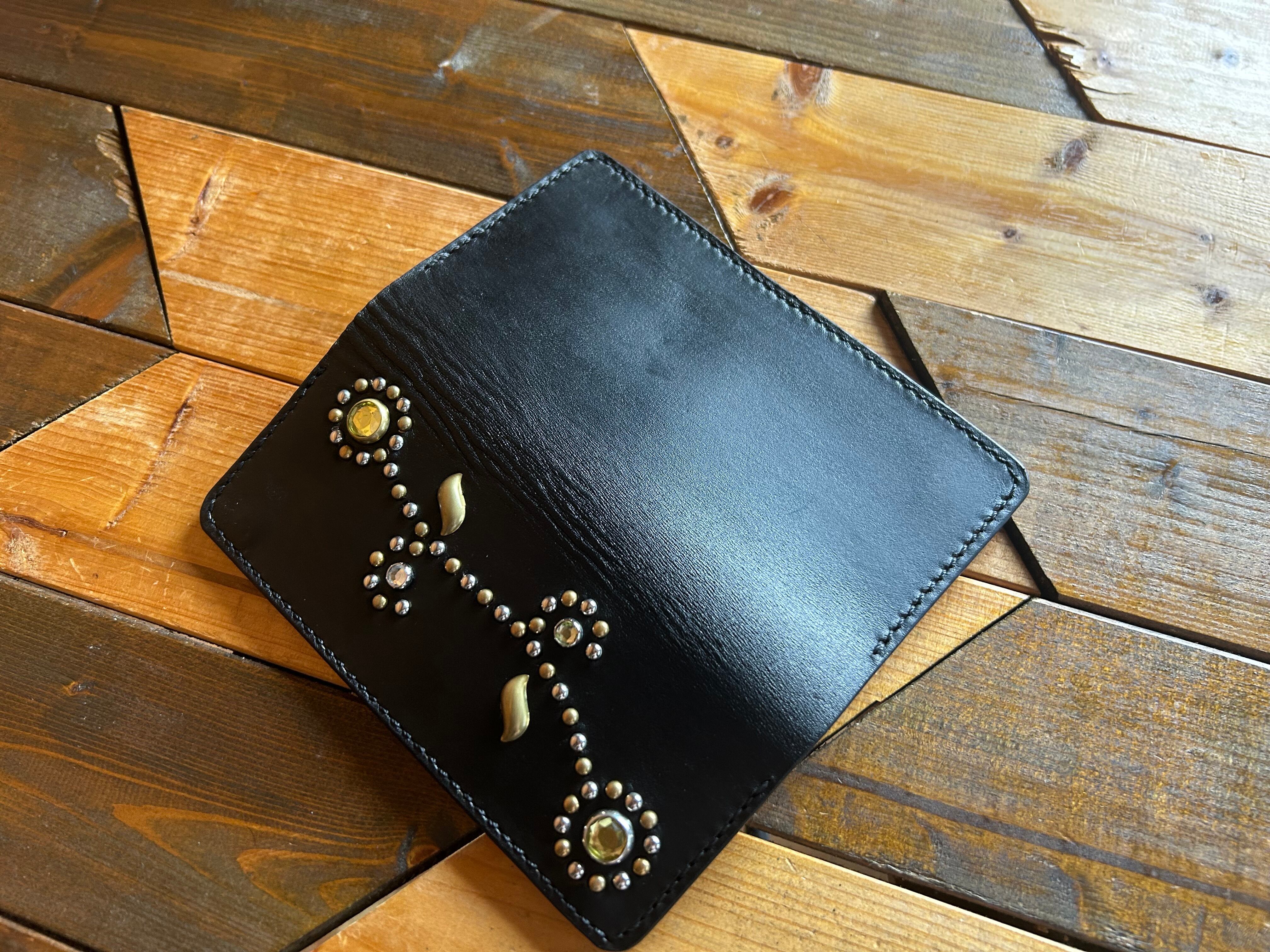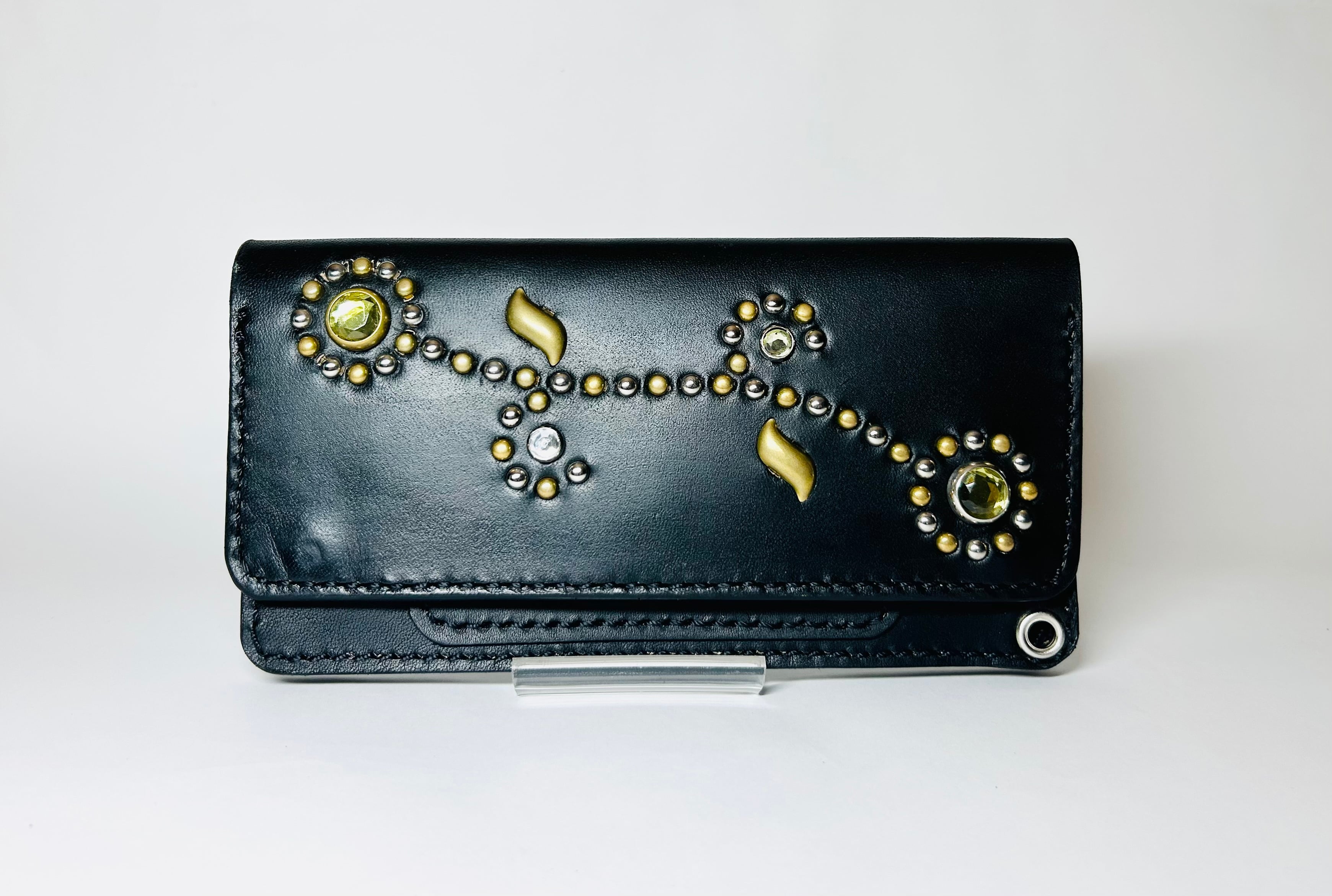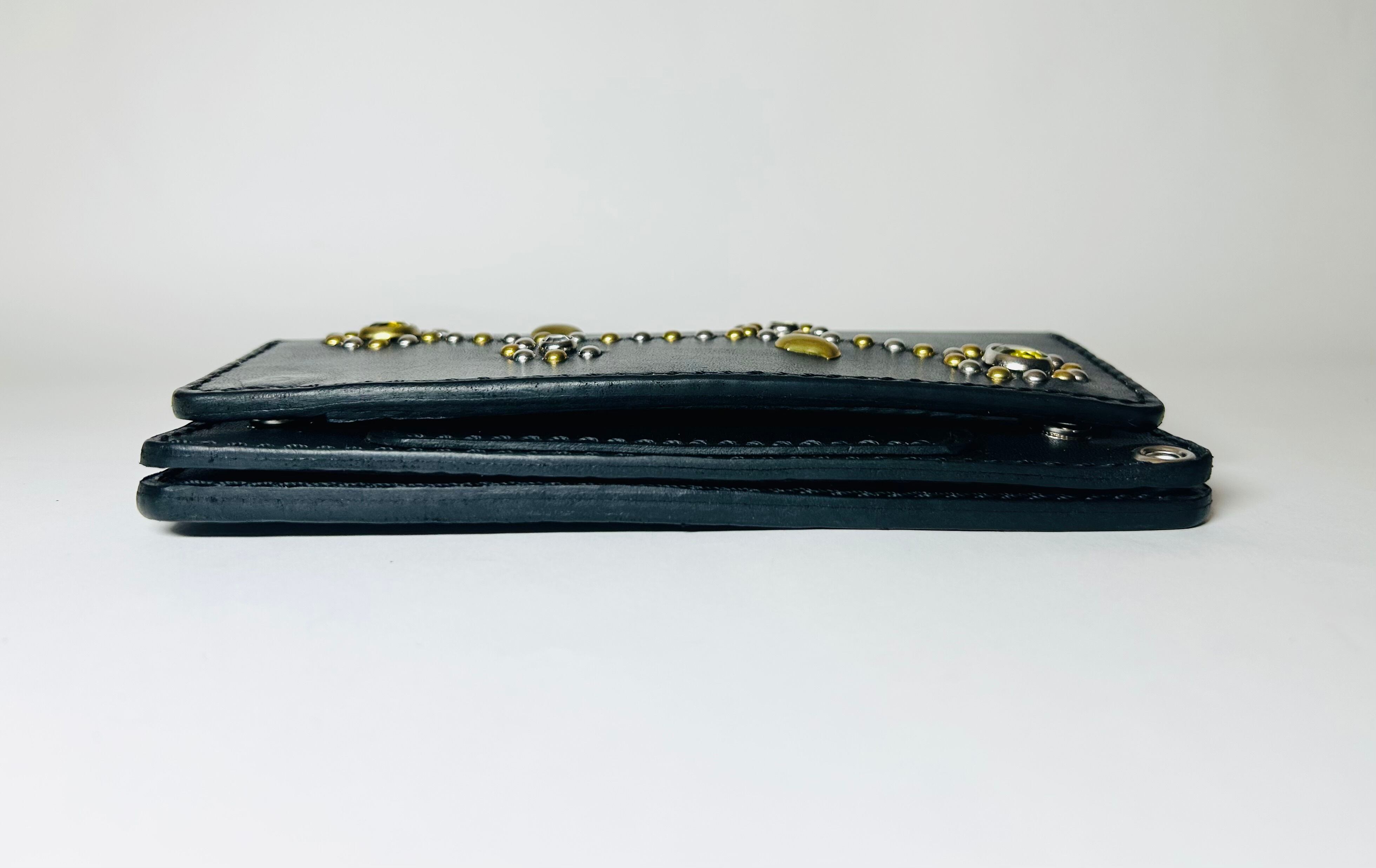 太陽と炎をイメージしたデザインのロングトラッカーウォレット。横幅19cmで、1万円札も畳まずに収納できます。ショートフラップのデザインは、ウォレットチェーンを通す穴が見える扱いやすい仕上がり。バックポケットに収納した際には、財布の頭がポケットから覗くため、視覚的なアクセントを加えます。
