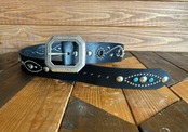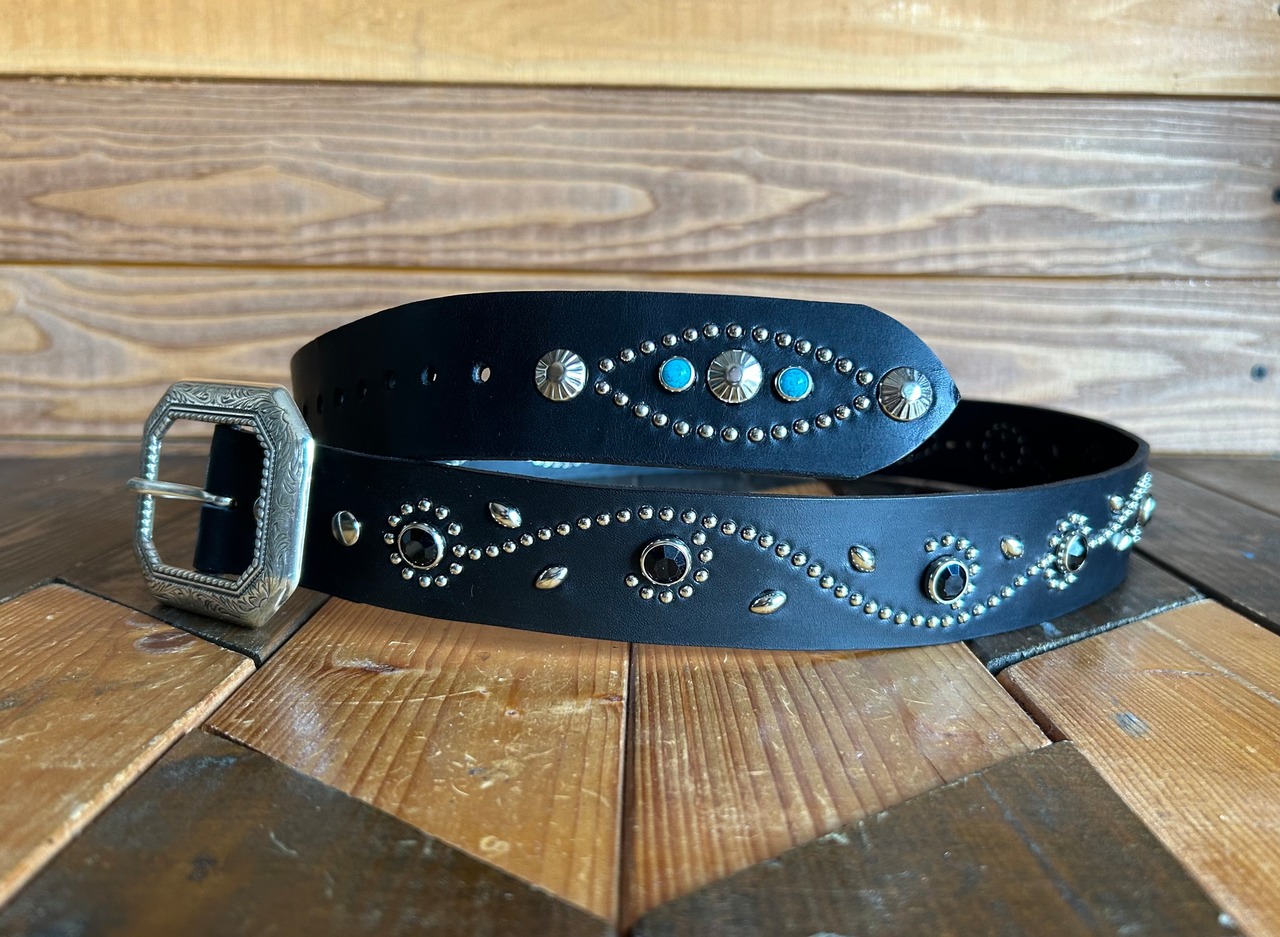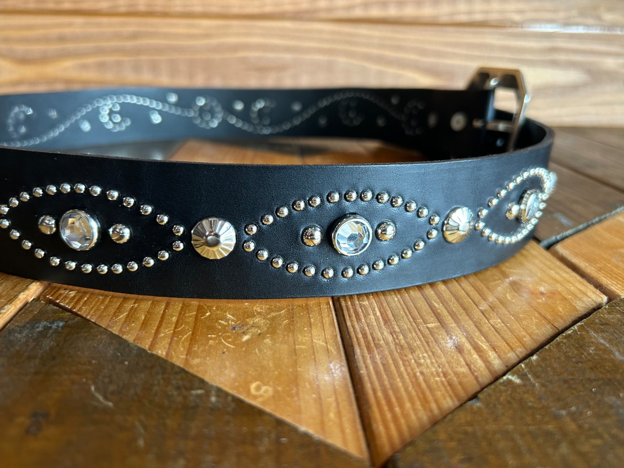 ベルト全面の360度にスタッズを施したベルトはフラワーとバタフライの2種類のデザインをベルトの中央で切り替えたアシンメトリーデザイン。
