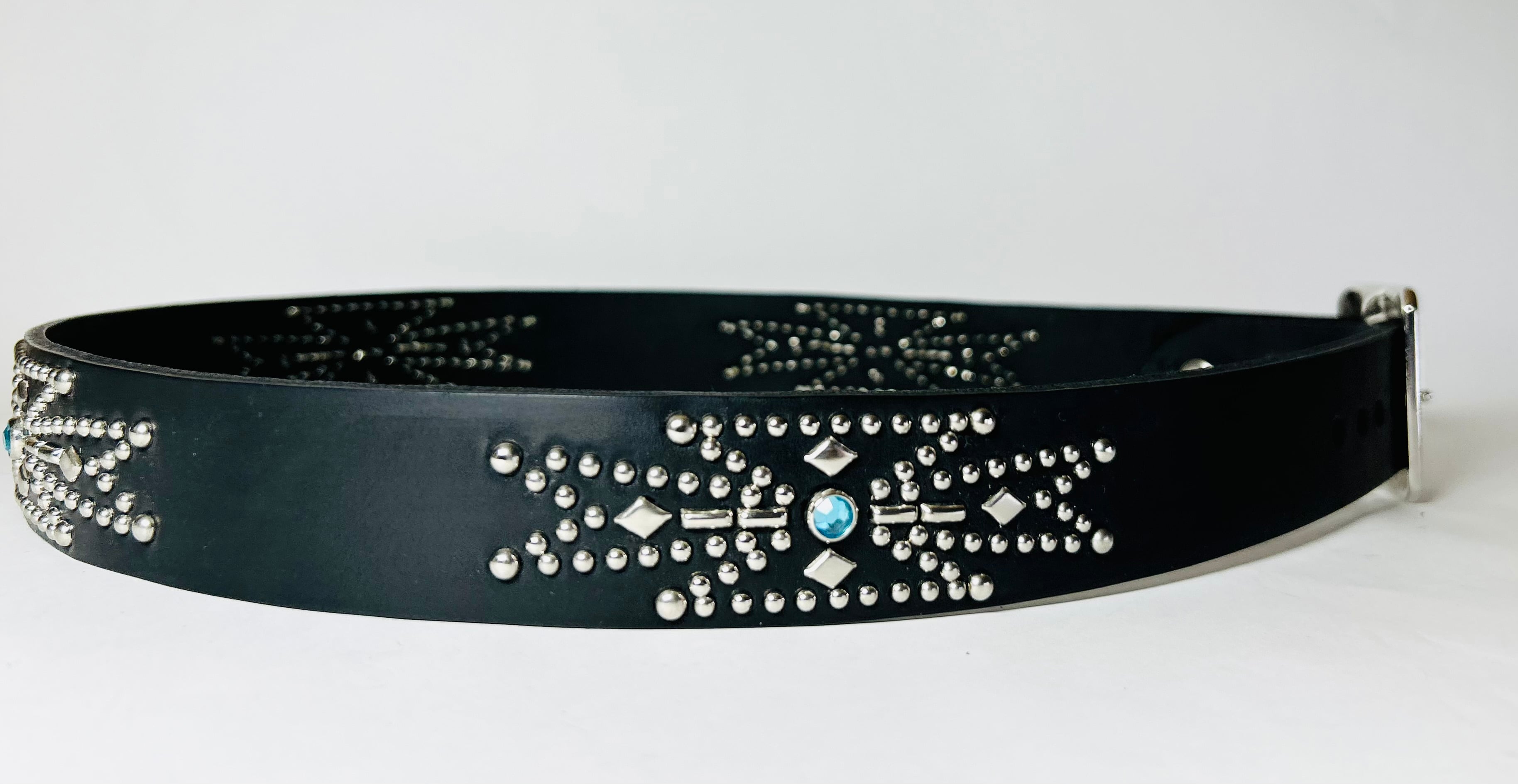 5つのオルテガ柄をベルトウエスト部と剣先に施したモデル。バックルの留め具がスナップボタン式ですのでバックルの取り外しや付け替えが簡単行えます。