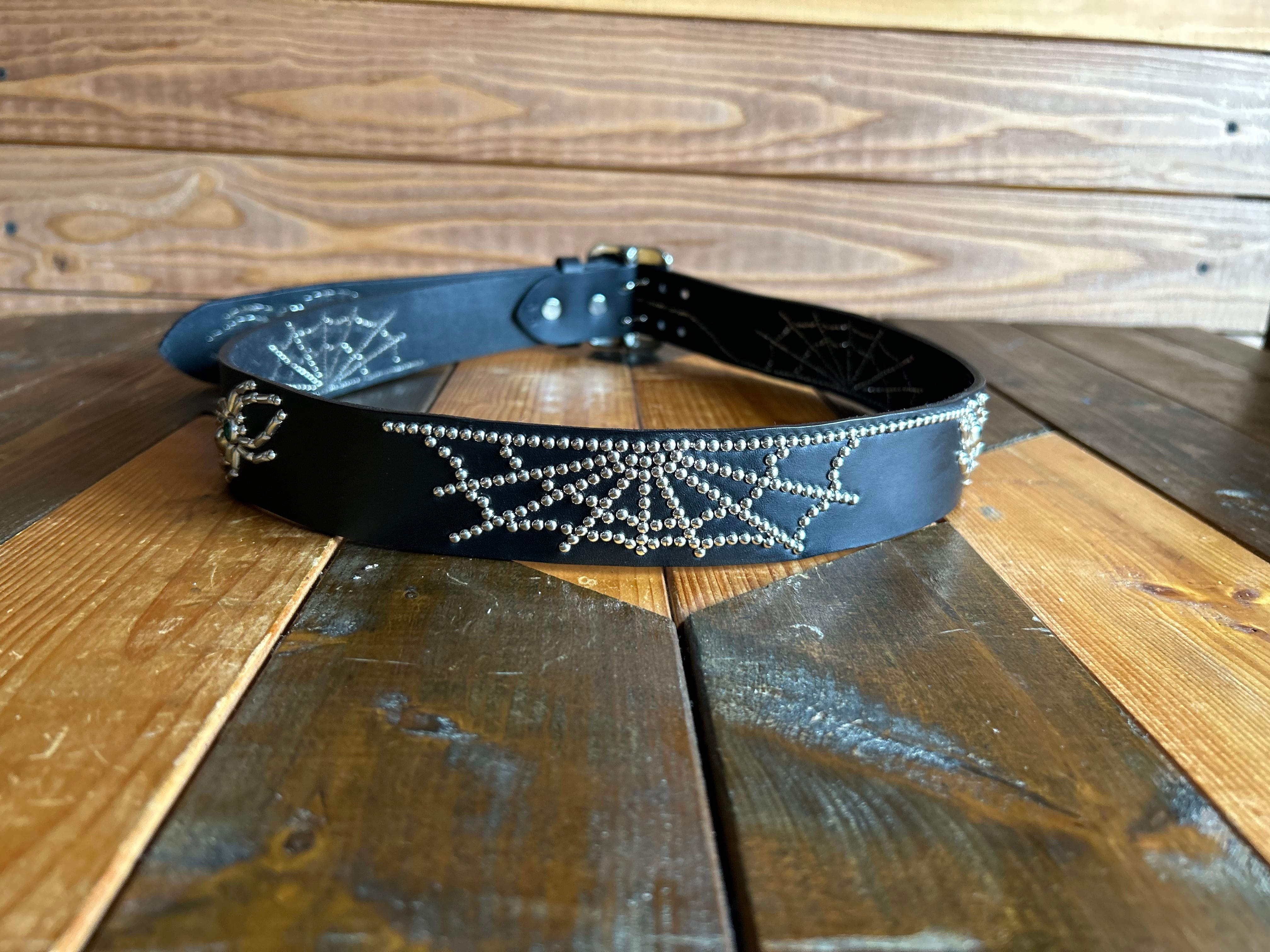 3匹の蜘蛛がそれぞれの巣を作っているデザインのスタッズベルト。剣先には幸運の象徴であるスカルスパイダーがおり二匹が後を追います。バックルはダブルピン使用で留め具がスナップボタン式ですのでバックルの取り外しや付け替えが簡単行えます。