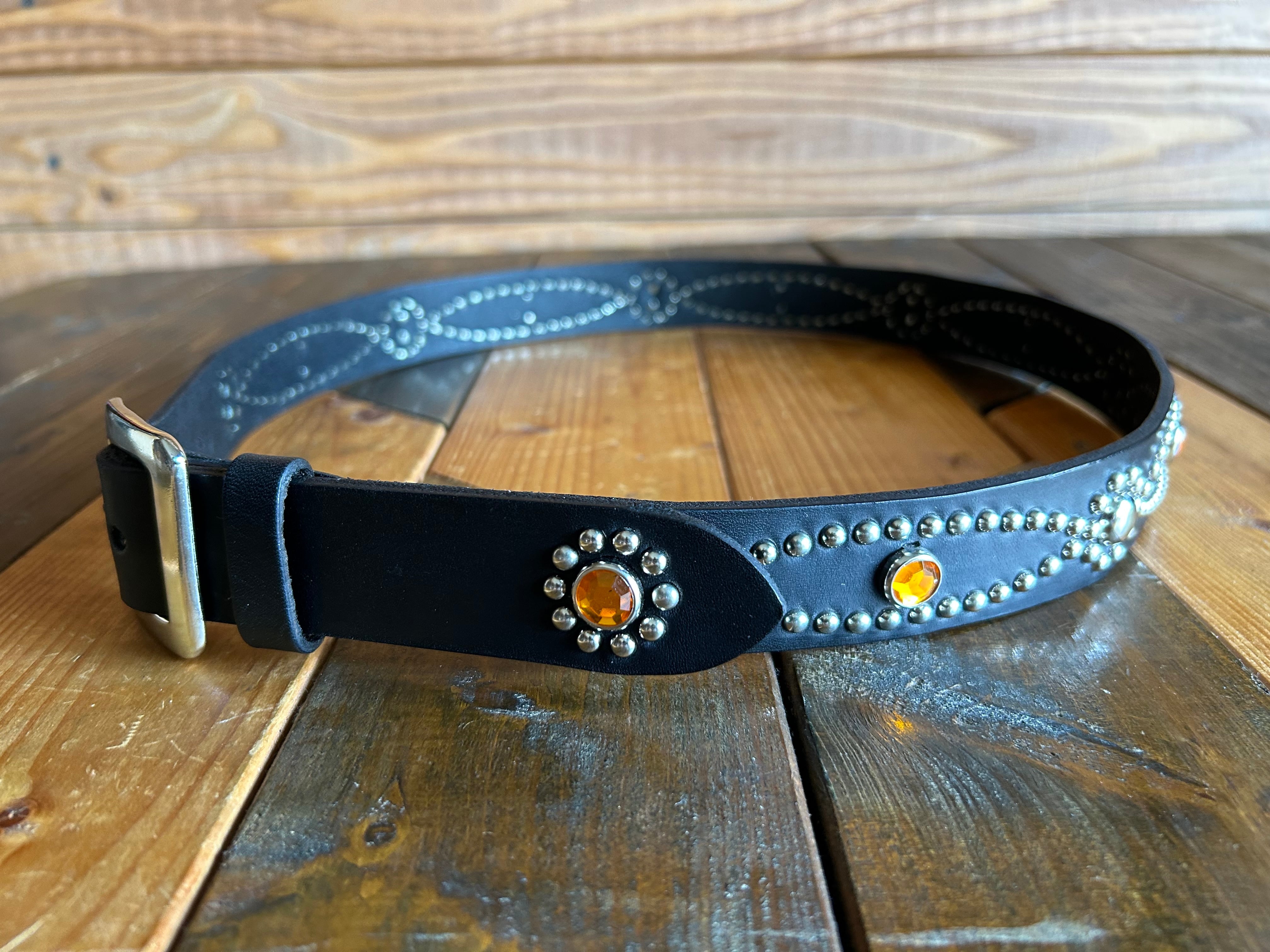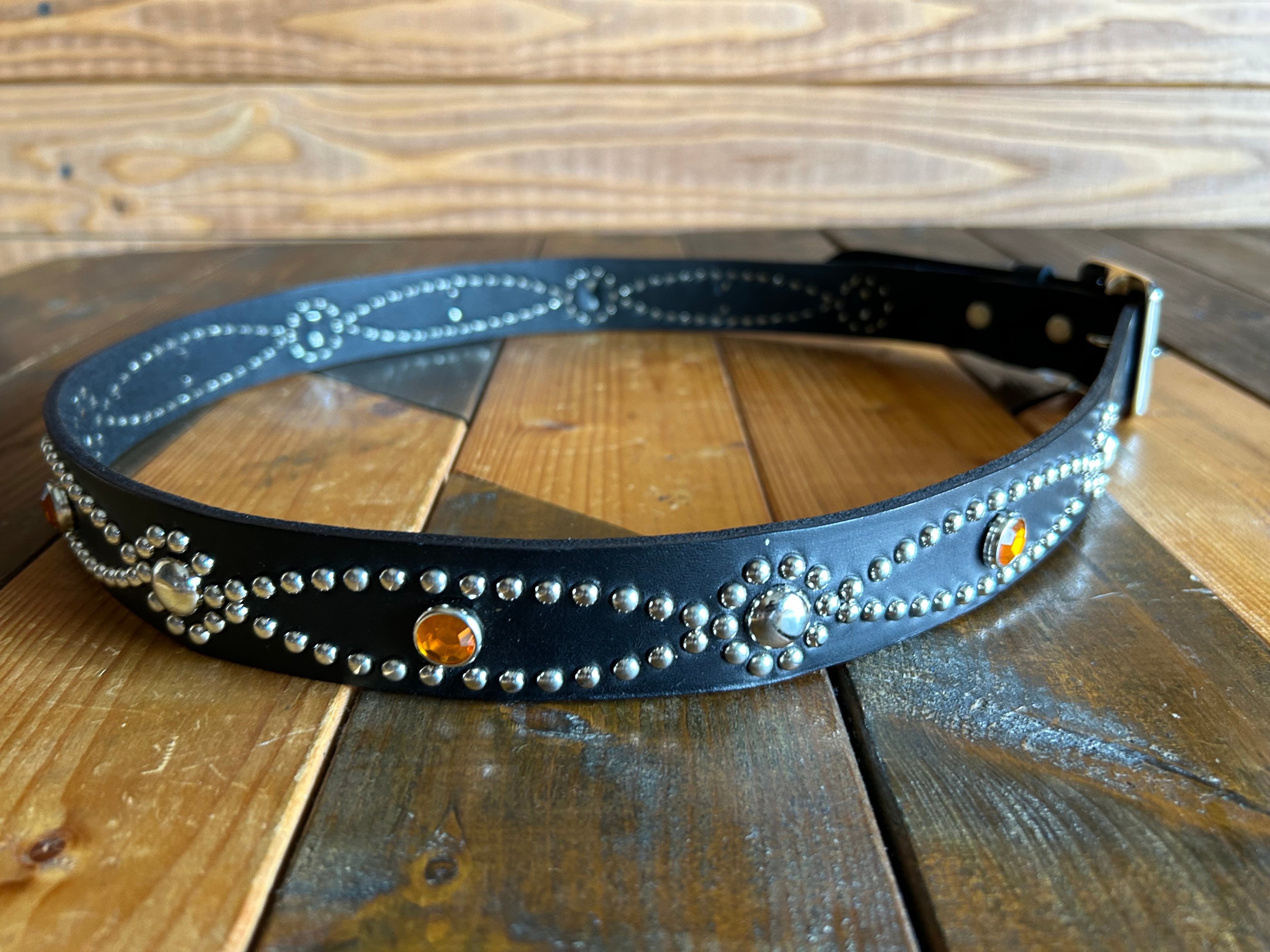 幸運が連なる願いを込めたデザインのチェーンスタッズが特徴的なベルト、バックルの留め具がスナップボタン式ですのでバックルの取り外しや付け替えが簡単行えます。