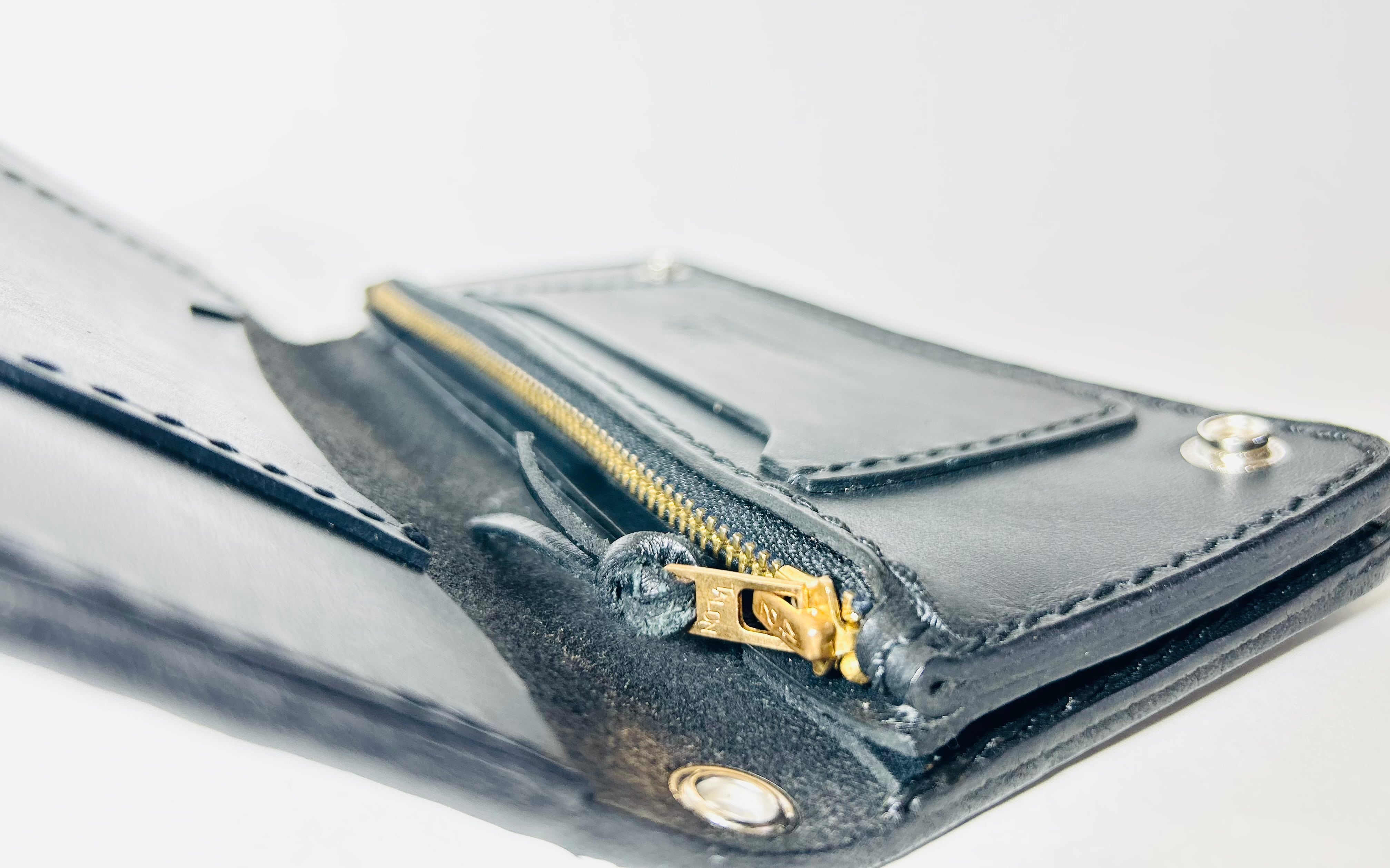病を治すと伝えられてきた伝統的なオルテガ柄が特徴的な財布は1万円札も畳まずに収納できる横幅19cmのロングトラッカーウォレットです。バックポケットに収納した際には、財布の頭がポケットから覗くため、視覚的なアクセントを加えます。内部は3層構造になっています(画像16)カード収納も充実しており場所はコインポケットの表側、フラップの裏、そして隠しカード入れの3箇所に分かれています。各所に合計4.5枚、最大で15枚ほどのカードを余裕を持って収めることが可能です。ジッパーには「タロンジッパー」を使用しており、1960年代アメリカのヴィンテージ使用な風合いが魅力です。この「42Talon」は、当時画期的なジッパーとして名を馳せた物でした。ロングトラッカーウォレットTALONは質感や機能性を兼ね備えた財布です。