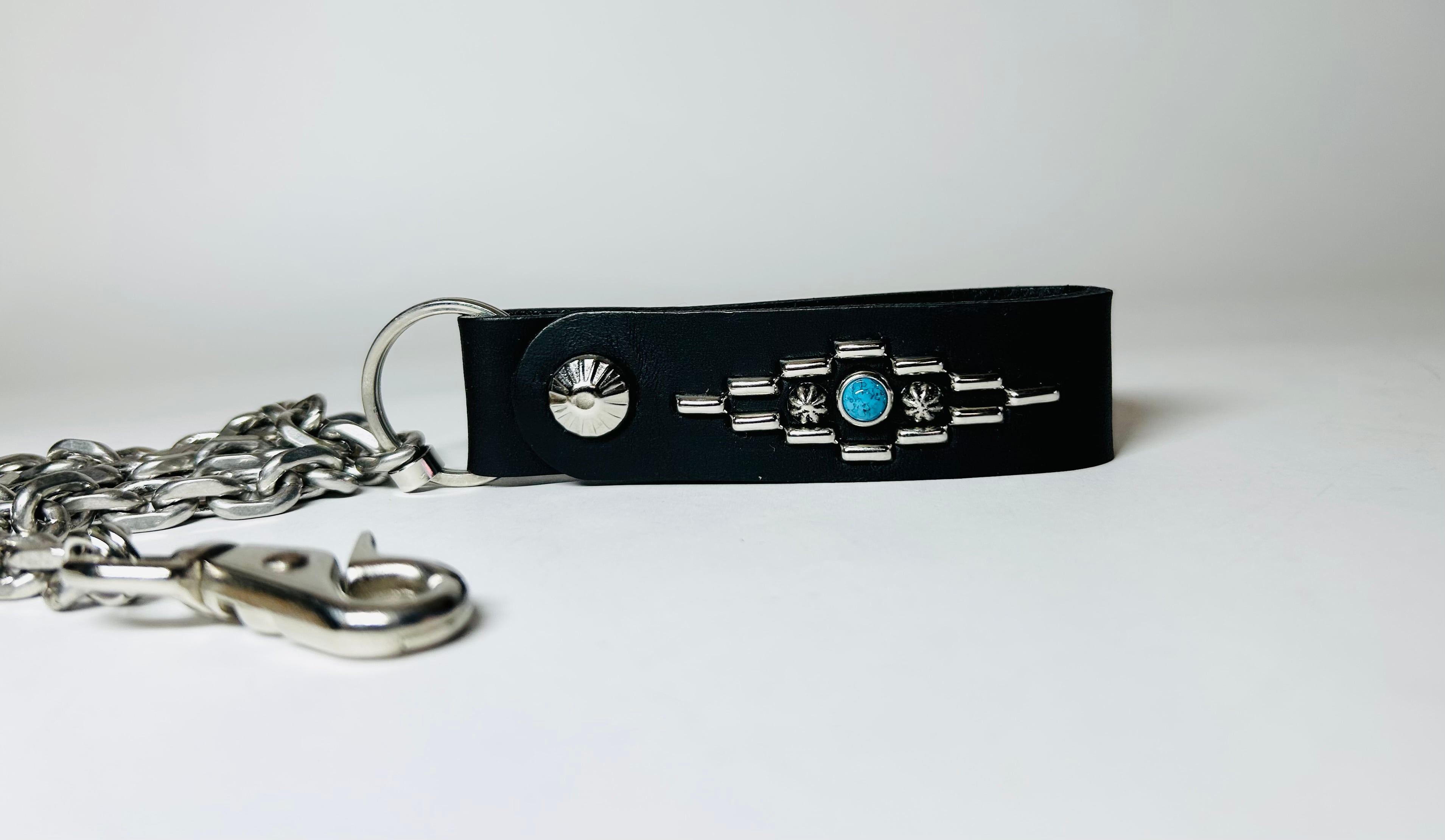 革ストラップ部分にオルテガデザインを施したあずぎ型チェーンのウォレットチェーン。チェーンは燻し銀のような色味で表面に使い込んだ金属のような加工を施したヴィンテージ感のある風合いを出したチェーンです【ステンレス素材】