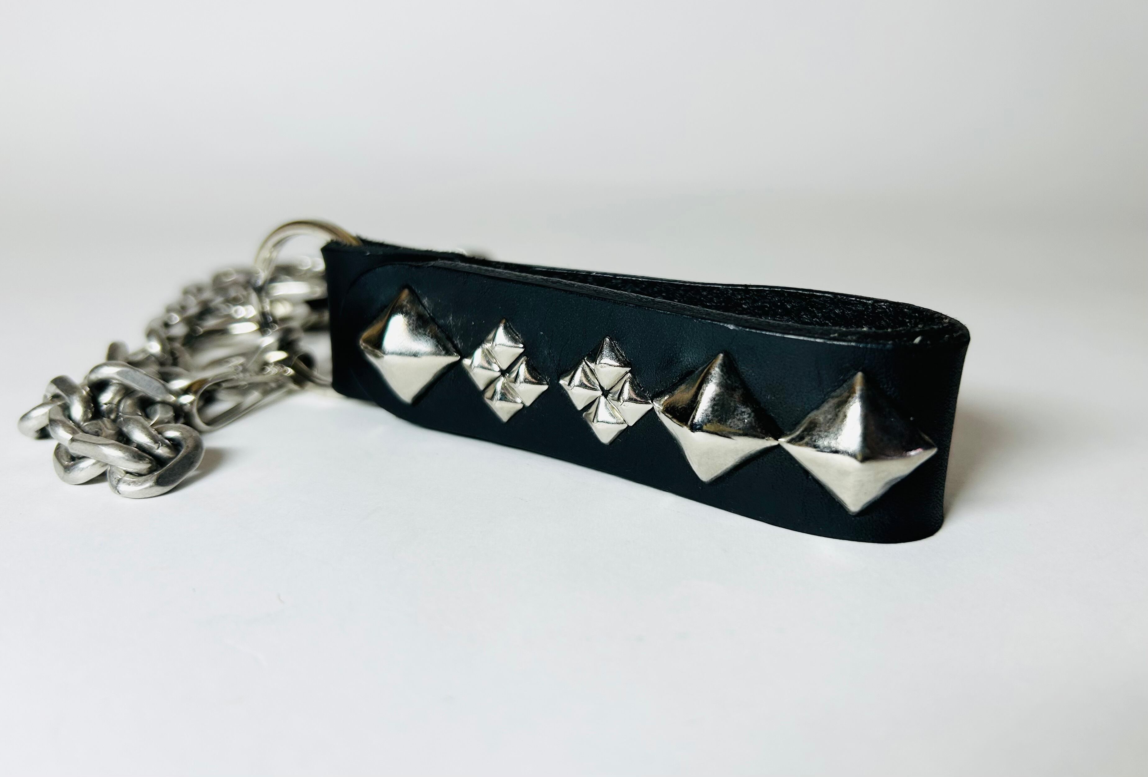 革ストラップ部分にダイヤモンドピラミッドスタッズを施したあずぎ型チェーンのウォレットチェーン。チェーンは燻し銀のような色味で表面に使い込んだ金属のような加工を施したヴィンテージ感のある風合いを出したチェーンです【ステンレス素材】