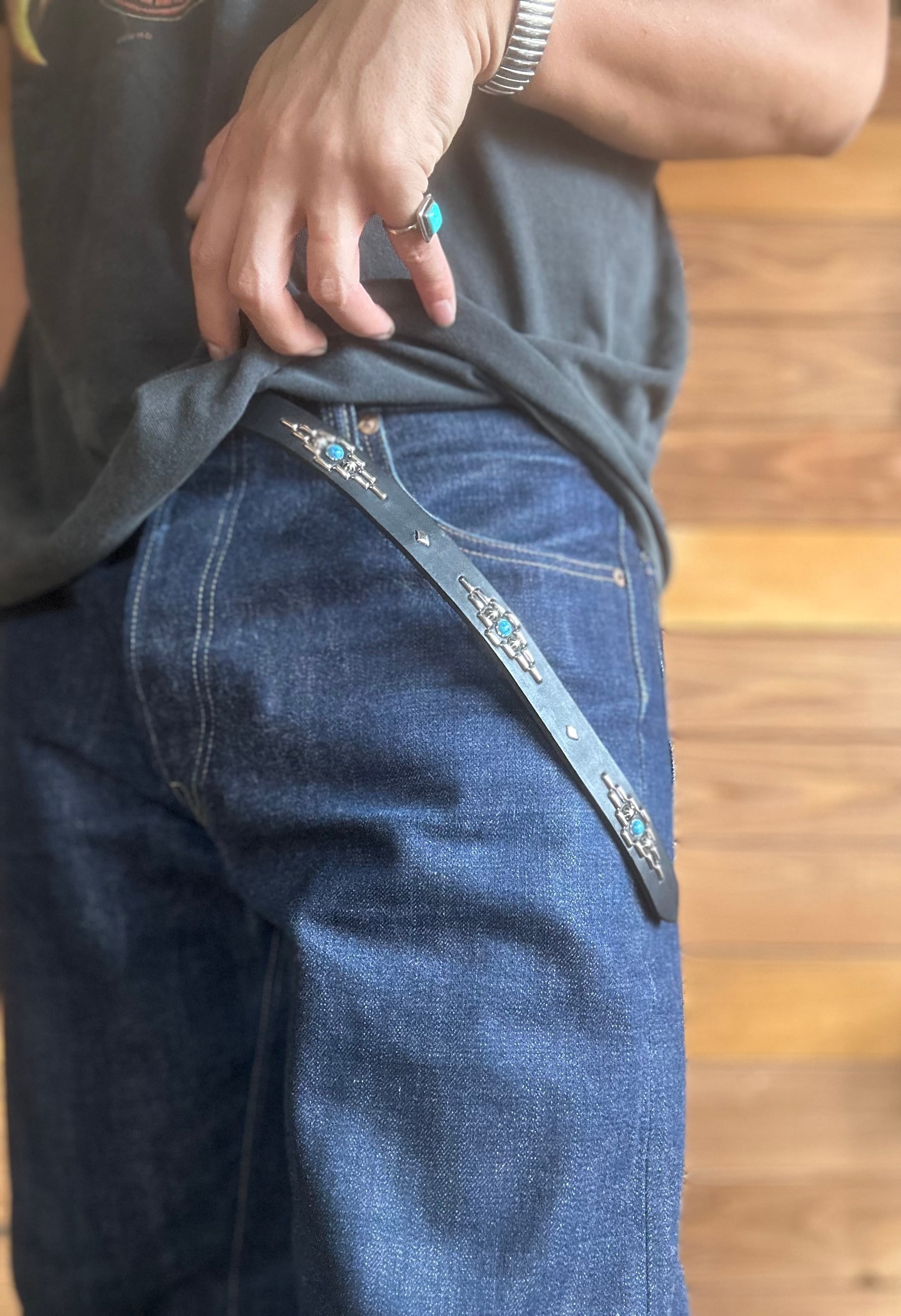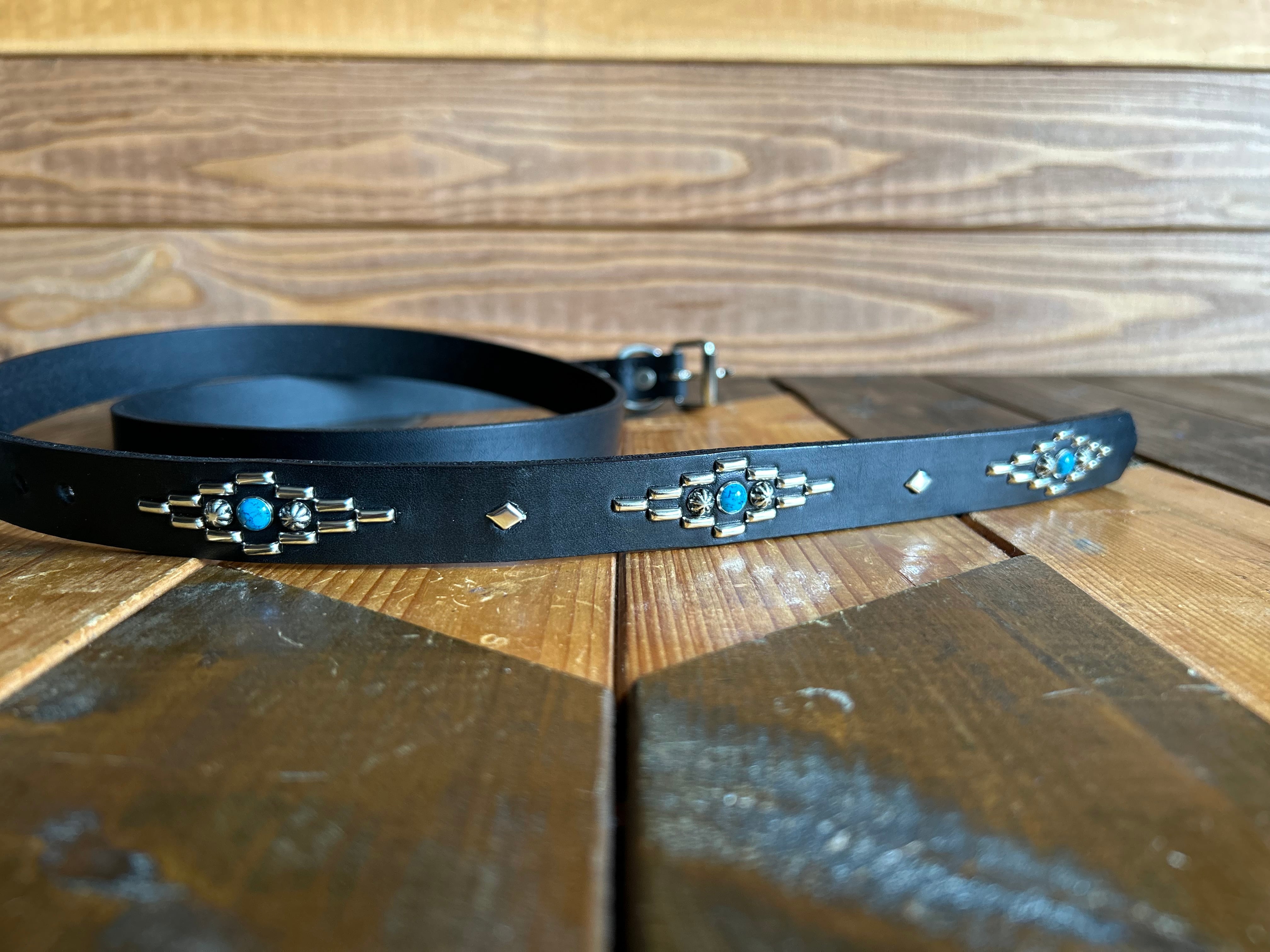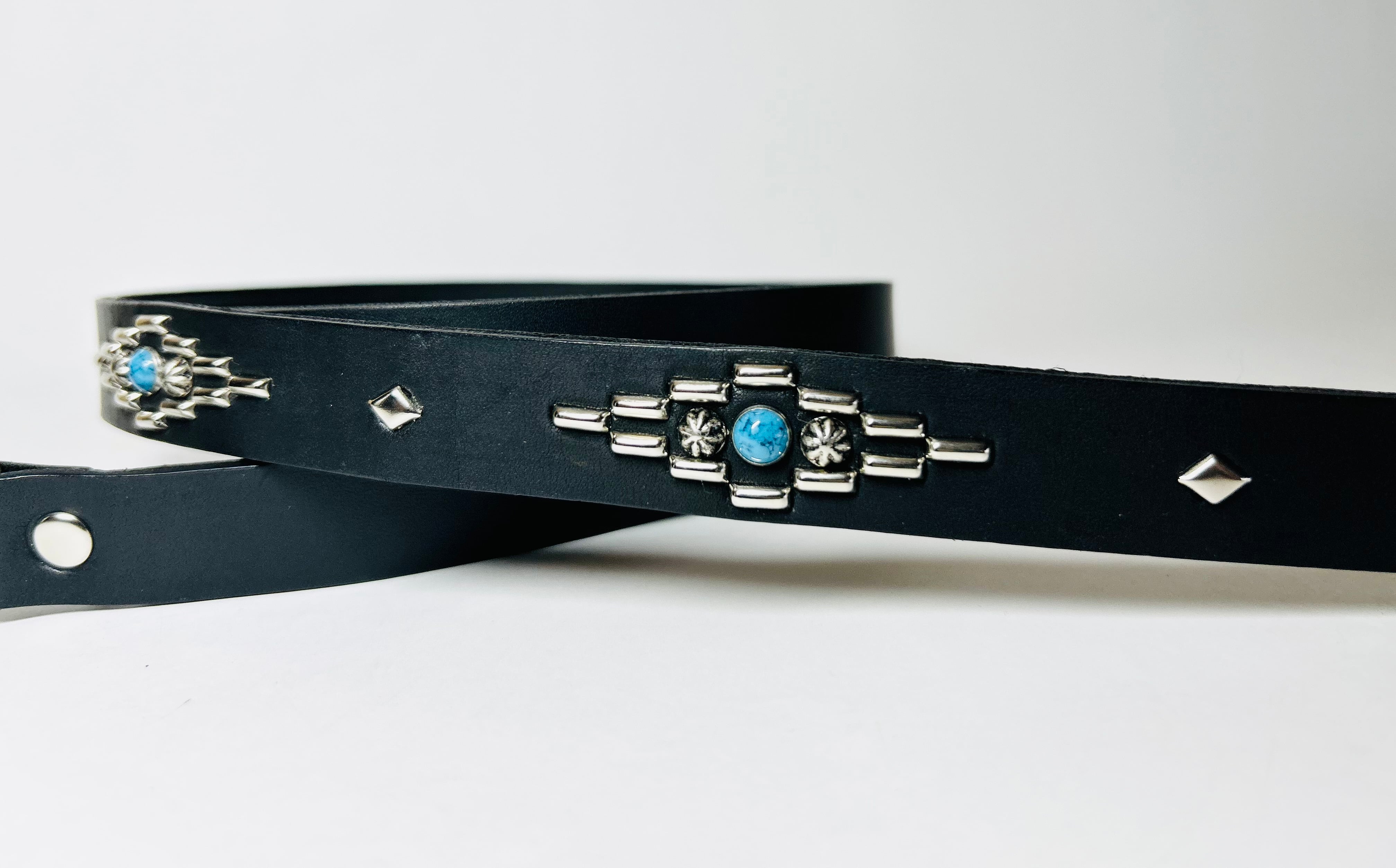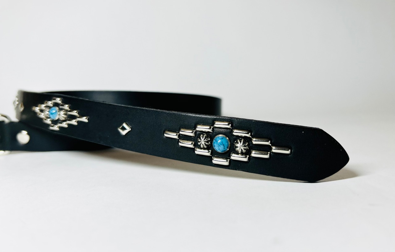 剣先にオルテガデザインを施した剣先30cmのナローベルトです。バックルの留め具がスナップボタン式ですのでバックルを取り外しできます。