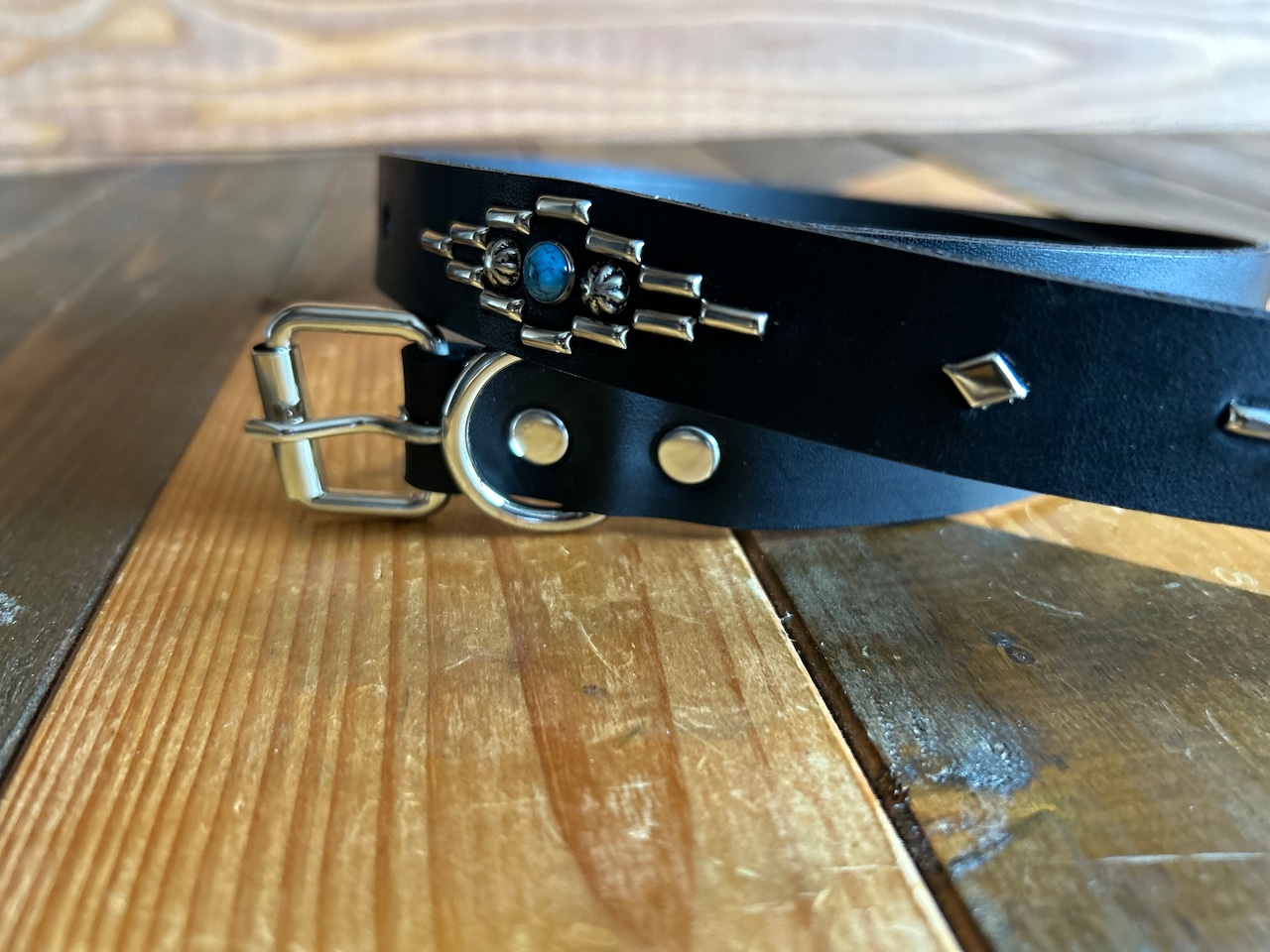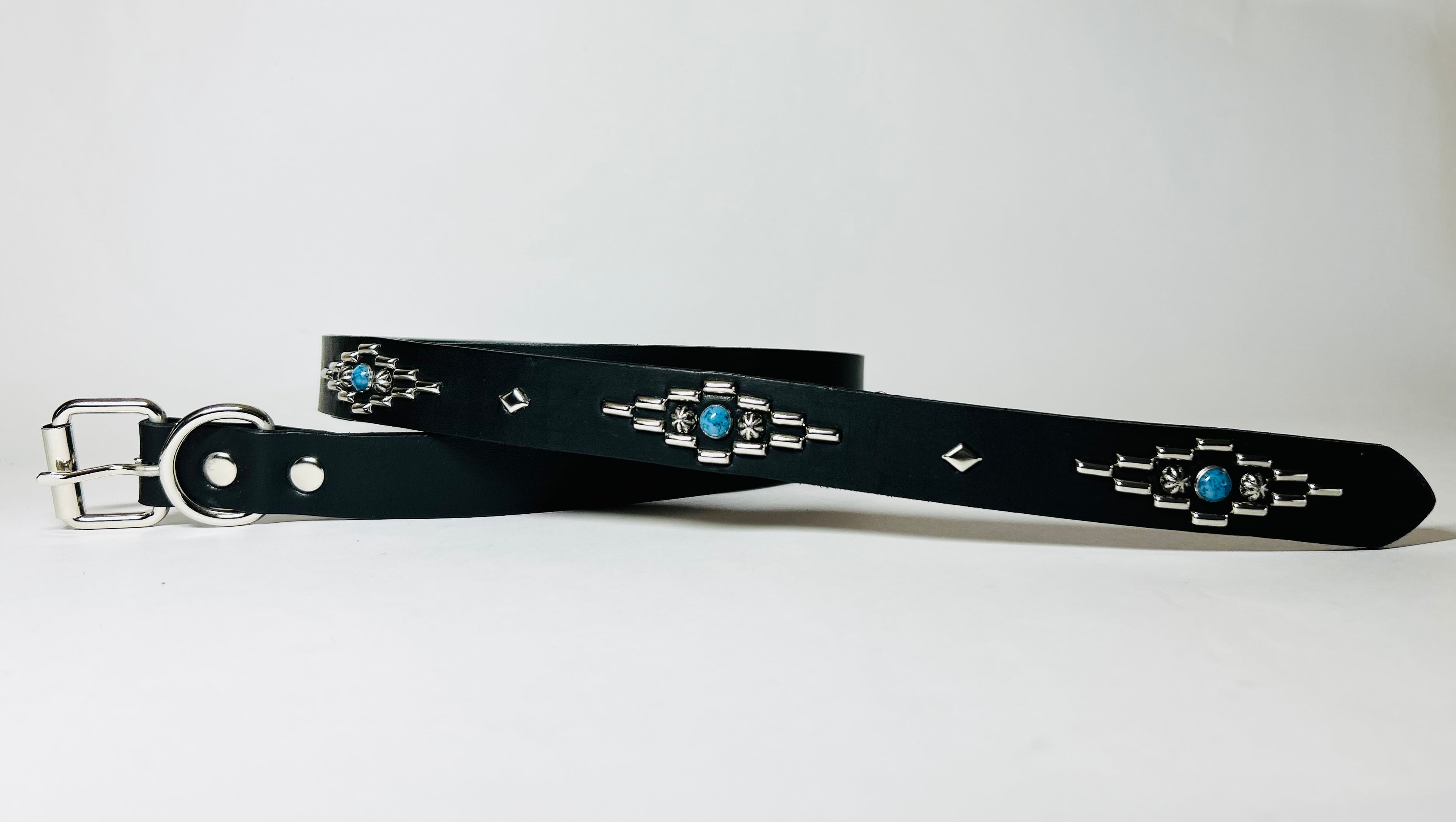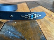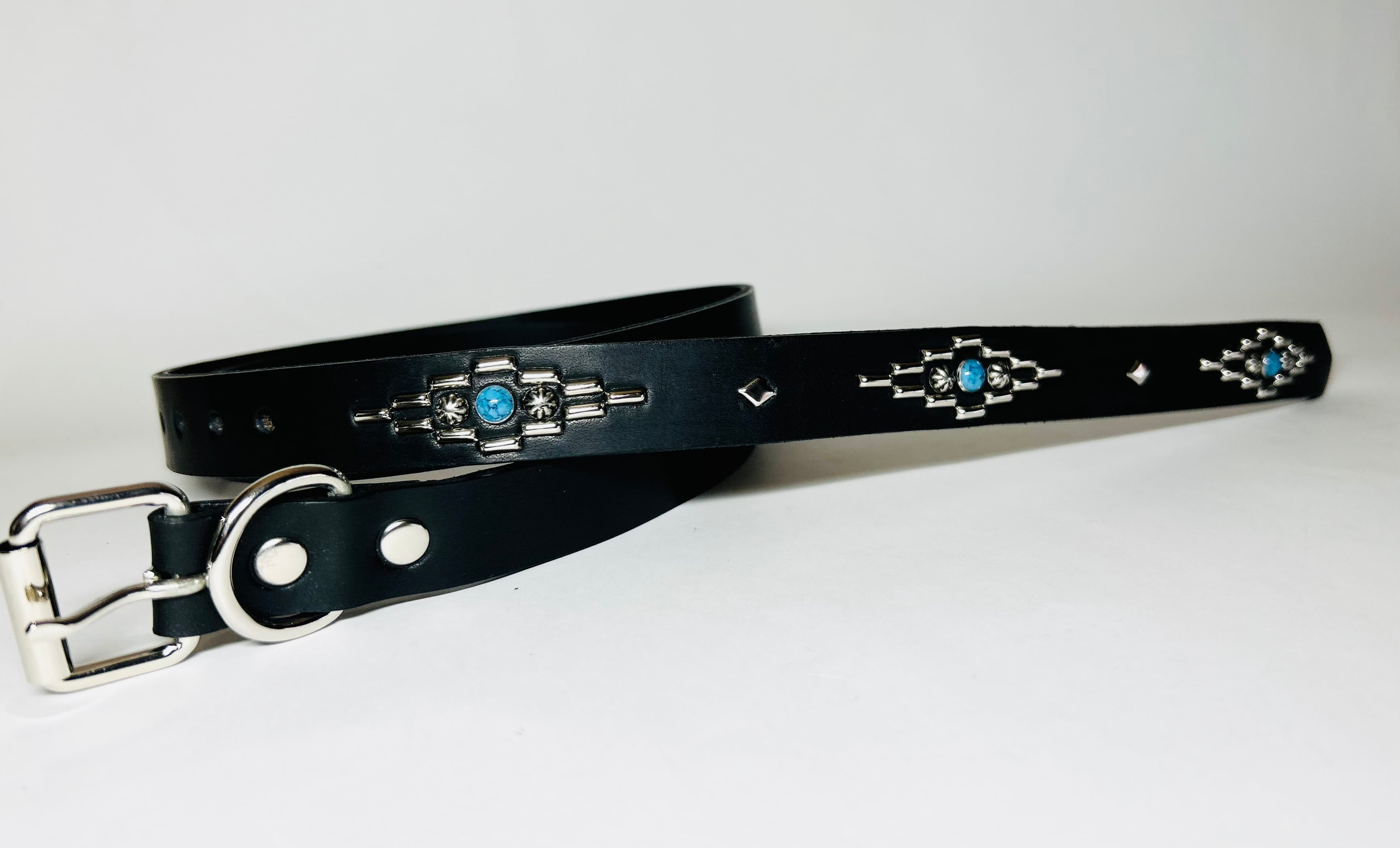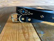 剣先にオルテガデザインを施した剣先30cmのナローベルトです。バックルの留め具がスナップボタン式ですのでバックルを取り外しできます。