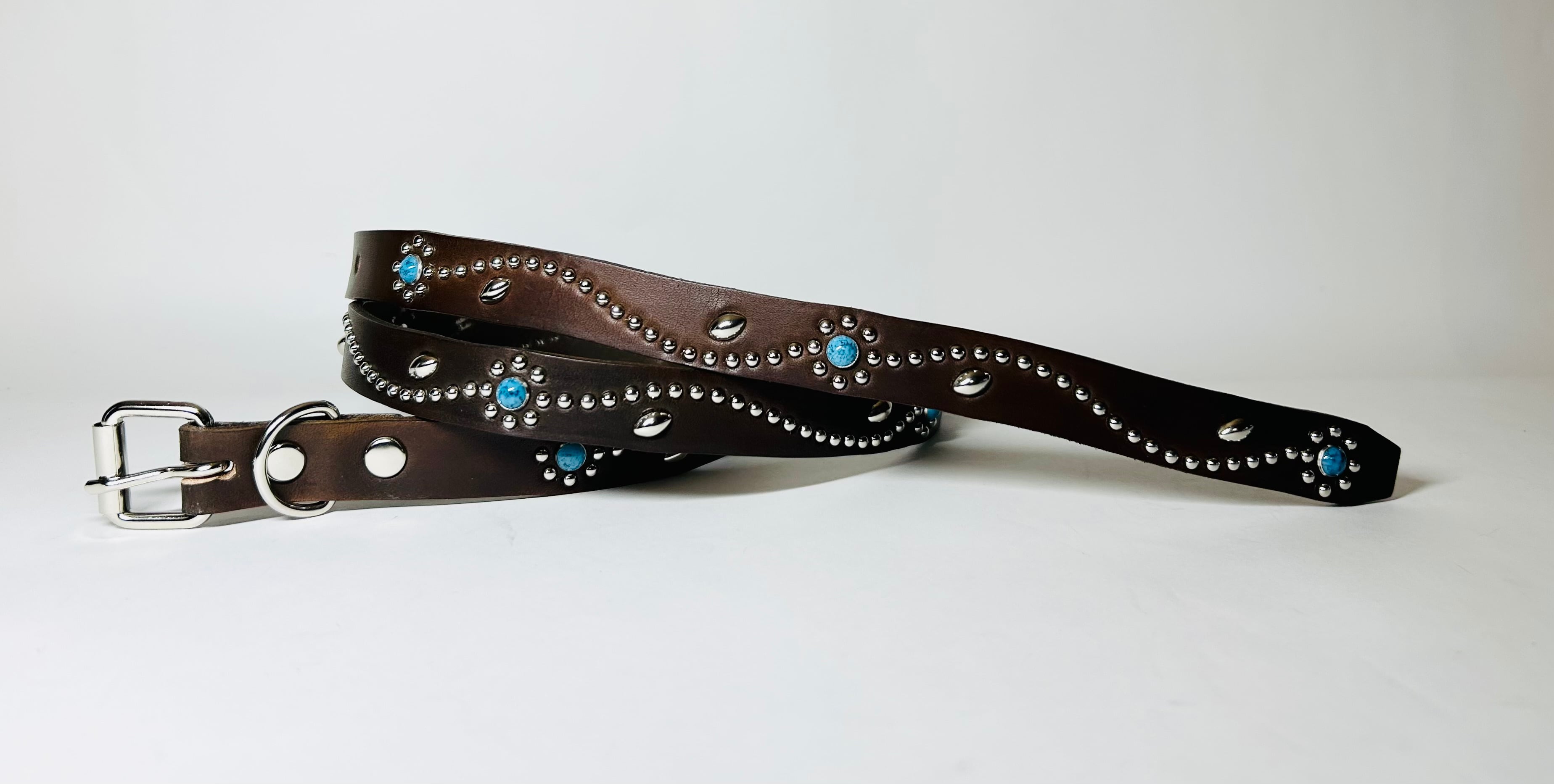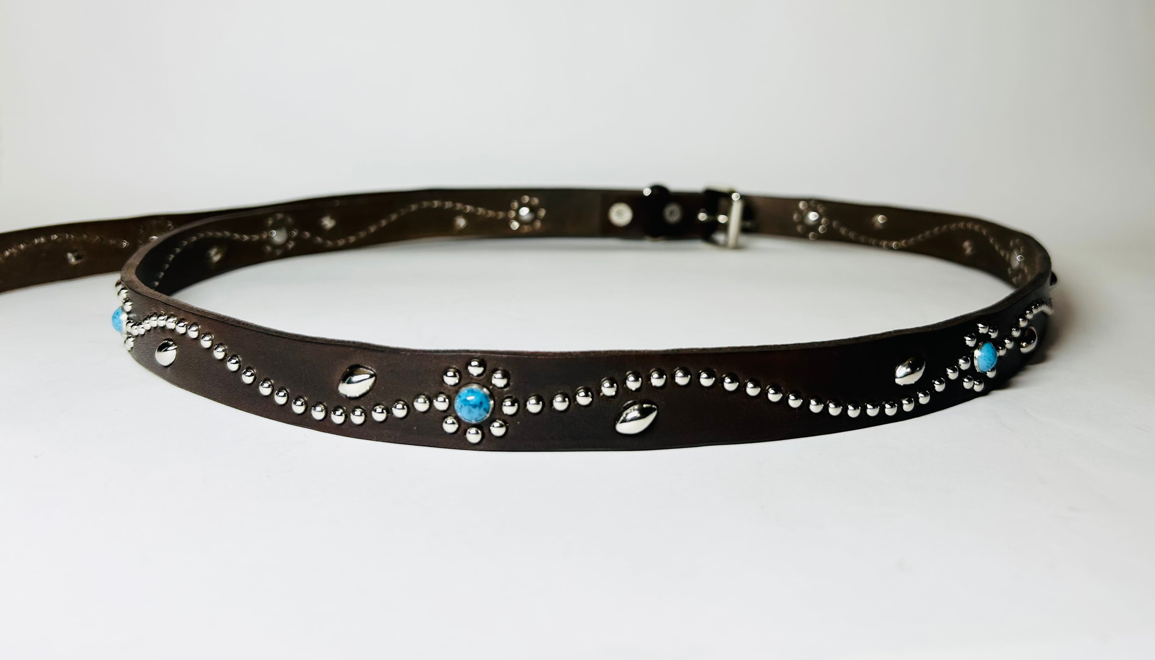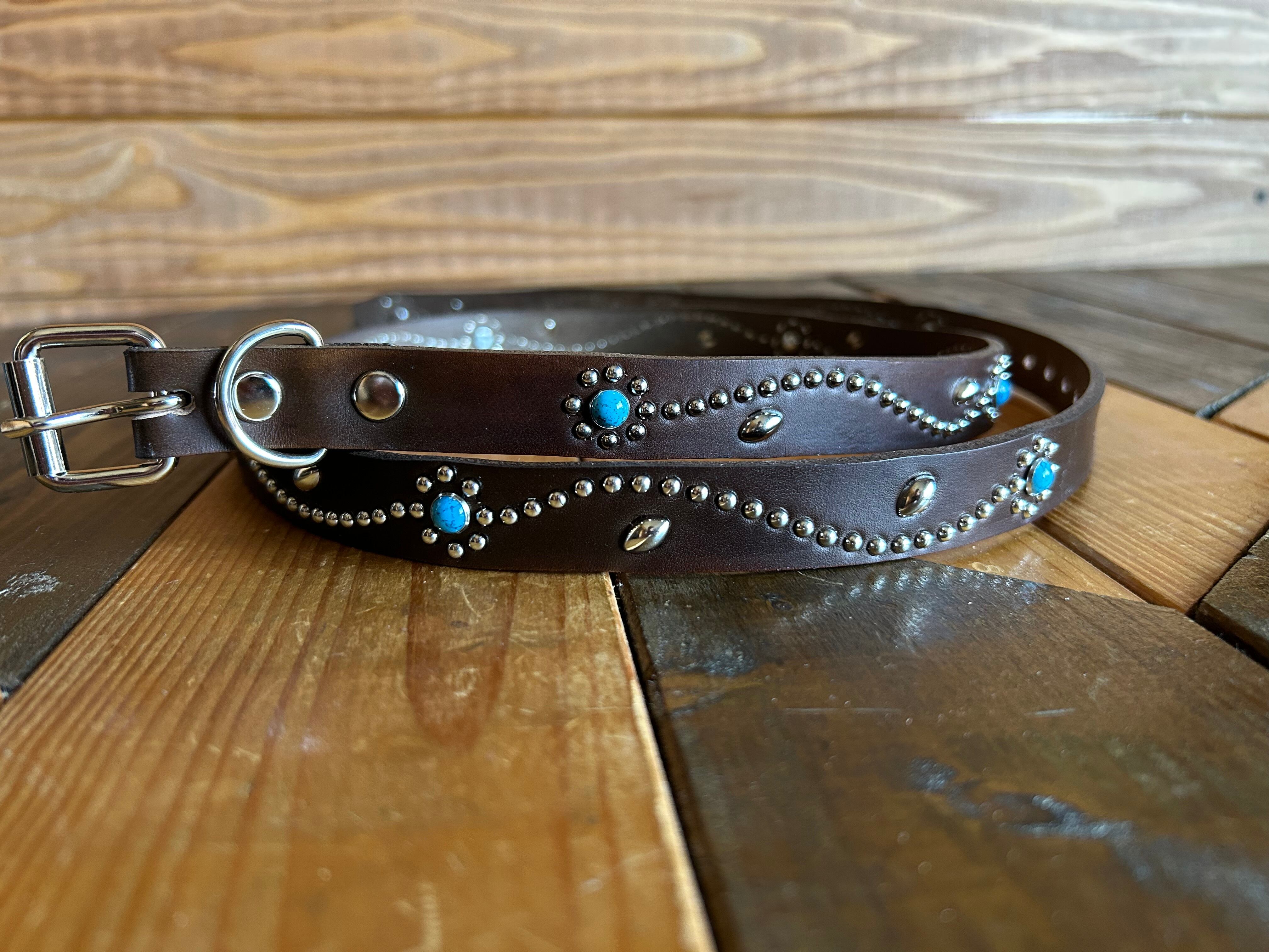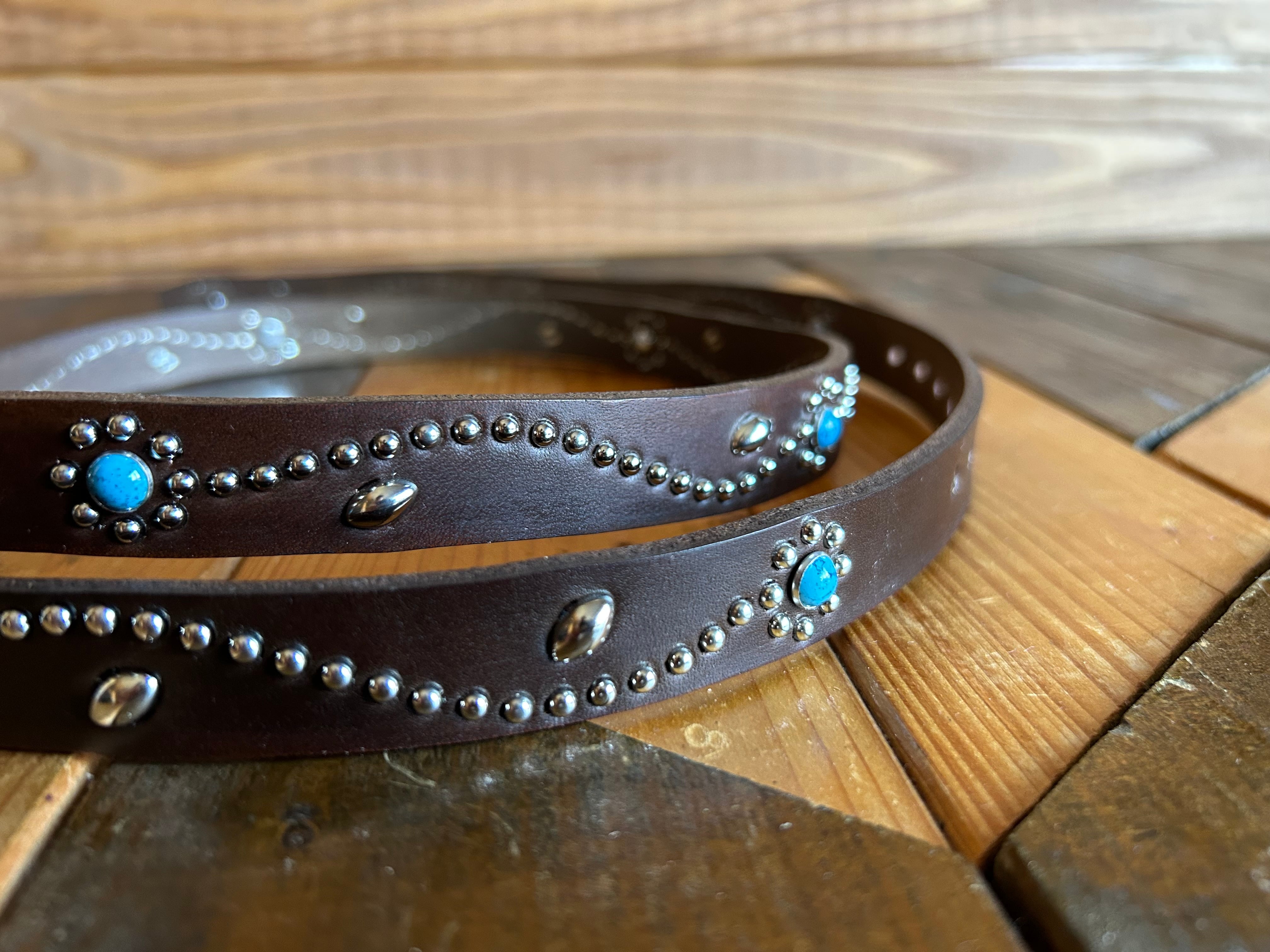 ベルト全体の360度にフラワーパターンスタッズを施したナローベルト。ターコイズカラースタッズを使用。【レザーカラーダークブラウン】※バックルの留め具がスナップボタン式ですのでバックルの取り外しができます。