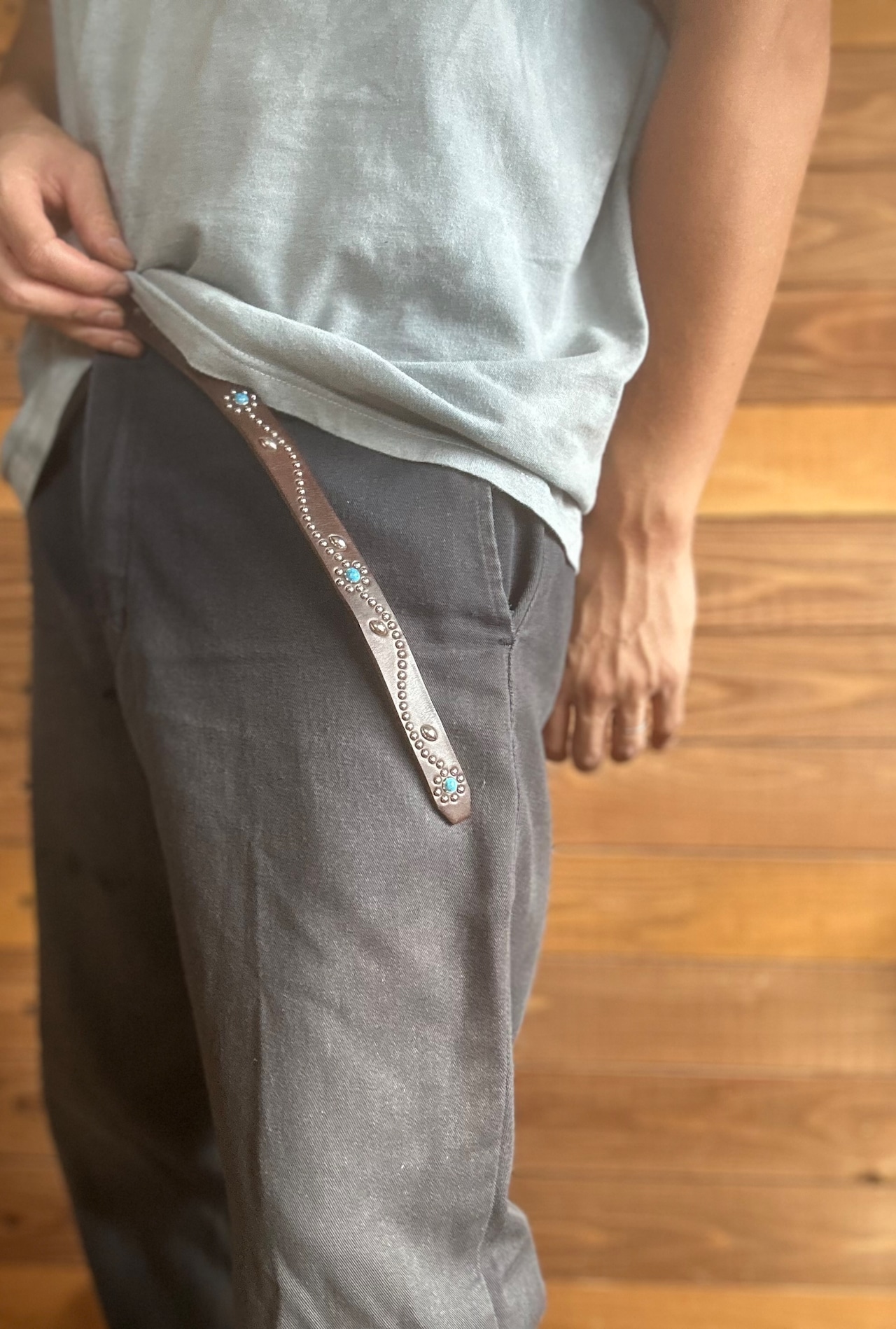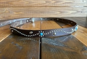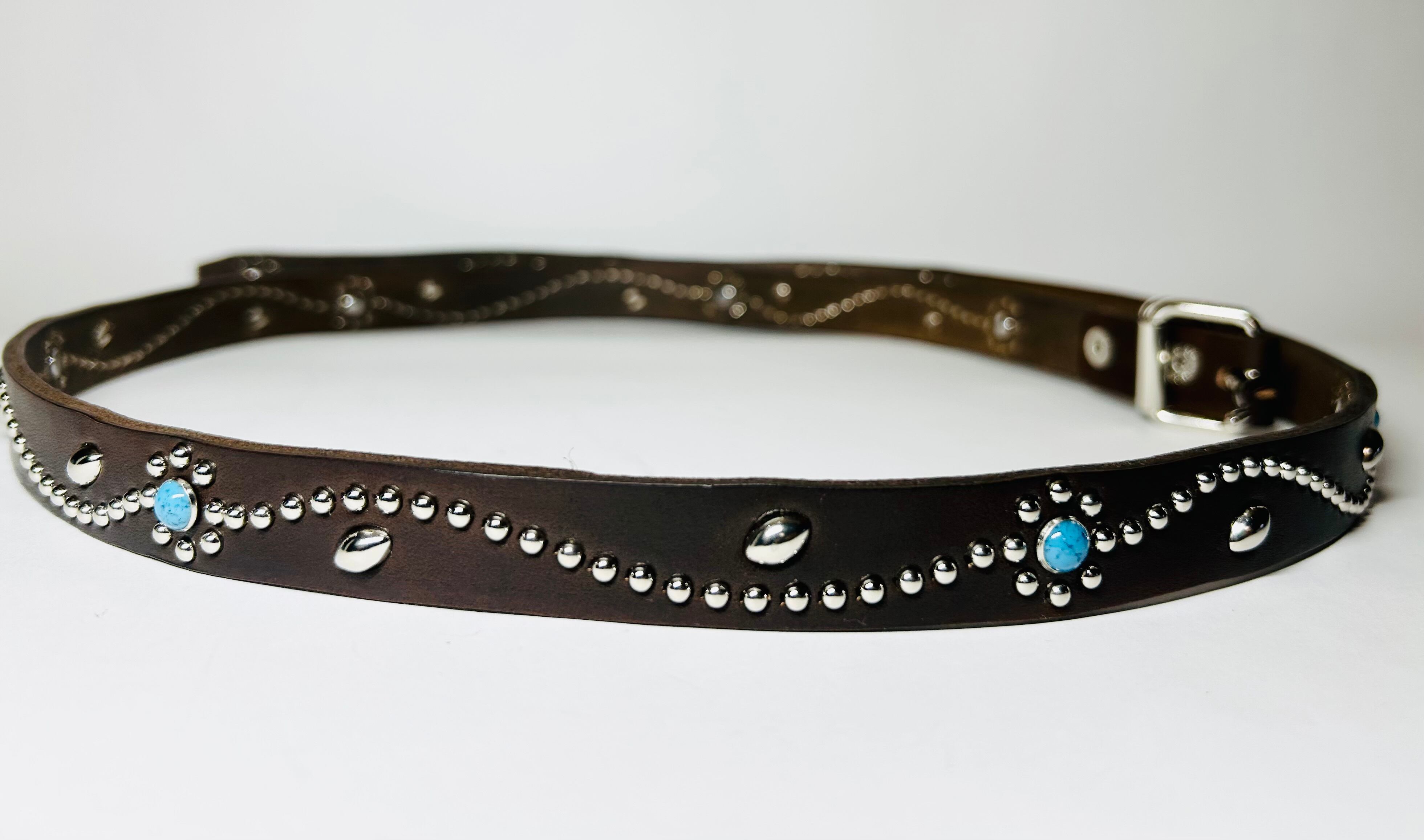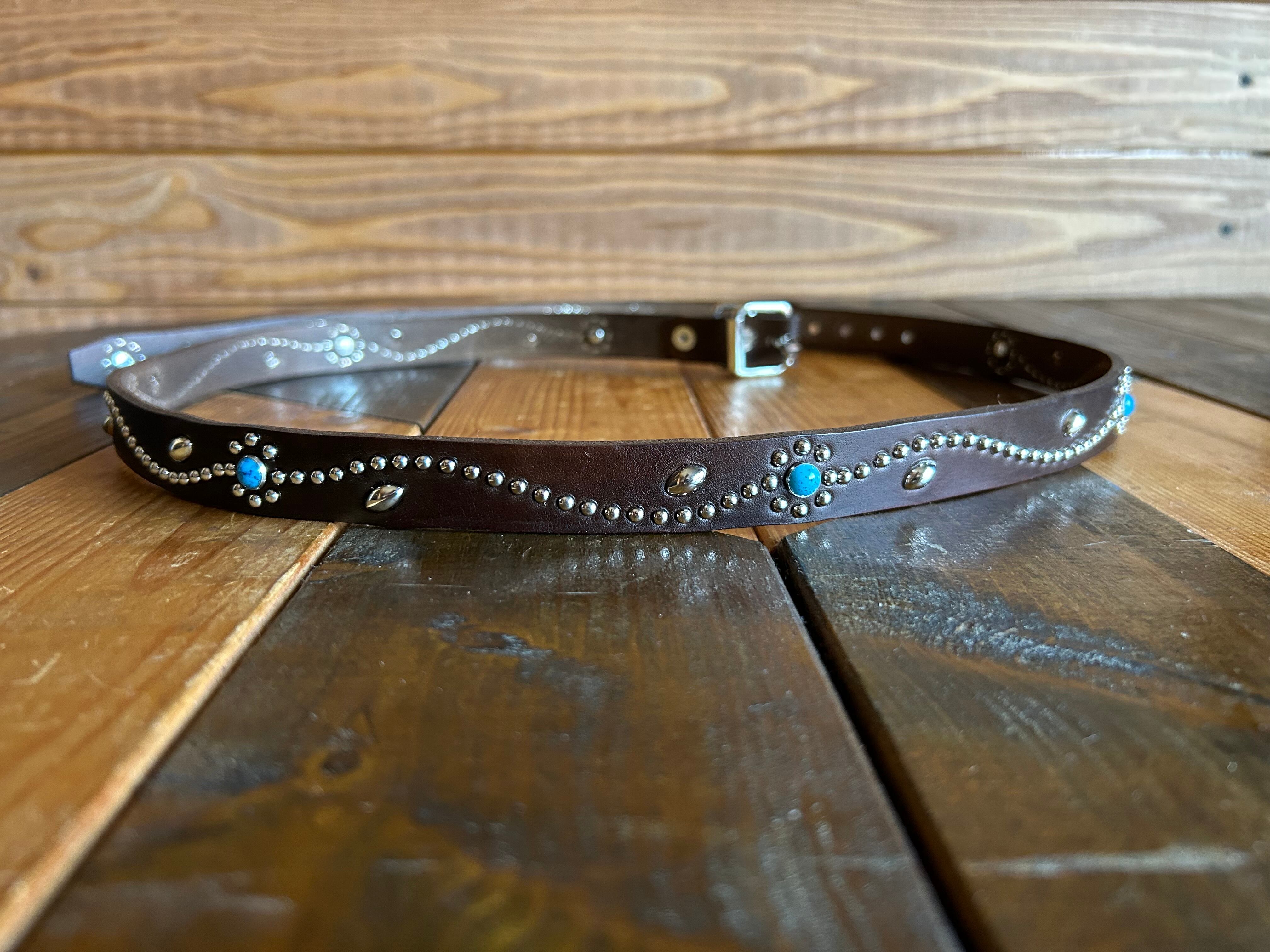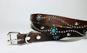 ベルト全体の360度にフラワーパターンスタッズを施したナローベルト。ターコイズカラースタッズを使用。【レザーカラーダークブラウン】※バックルの留め具がスナップボタン式ですのでバックルの取り外しができます。