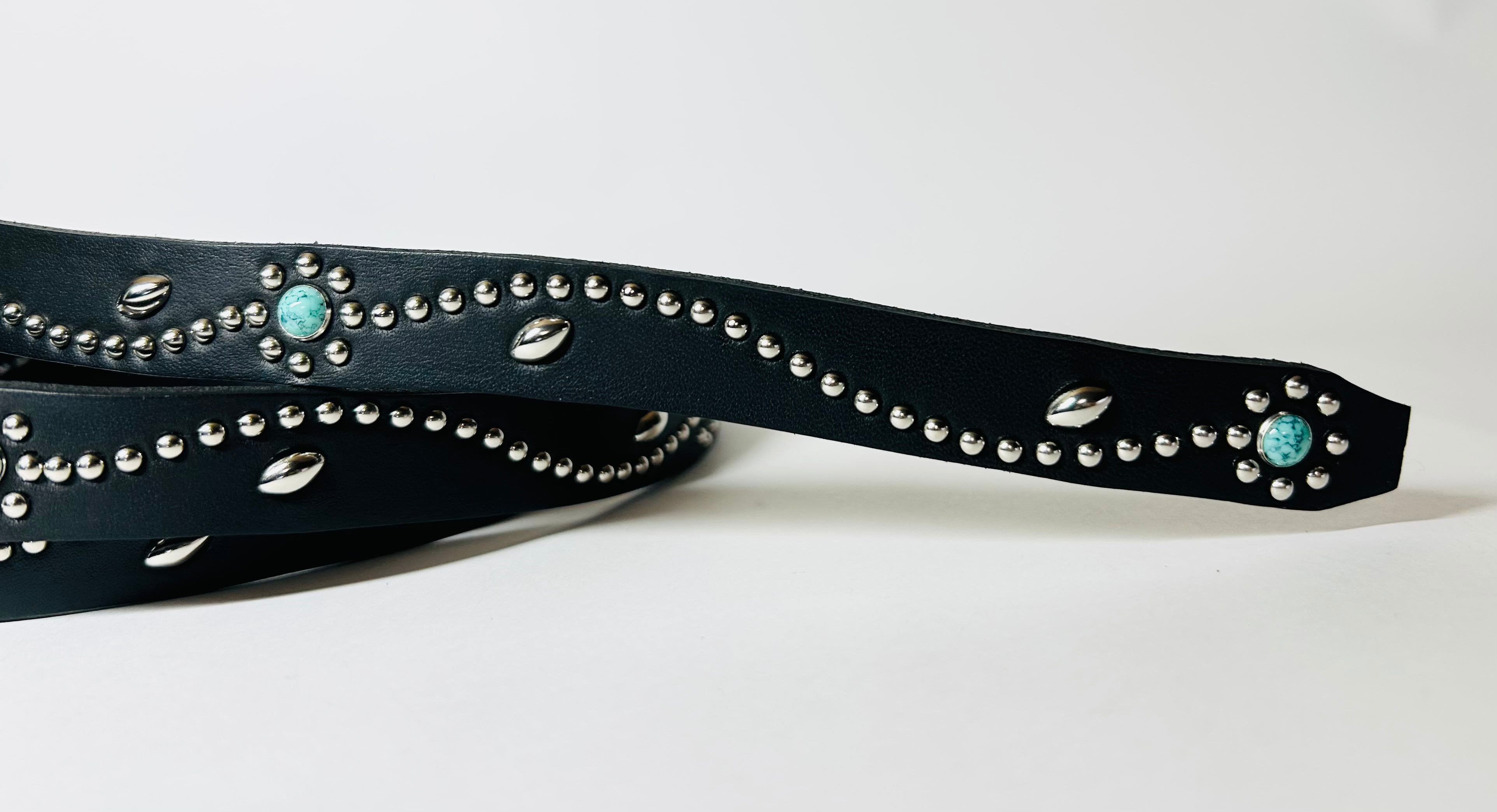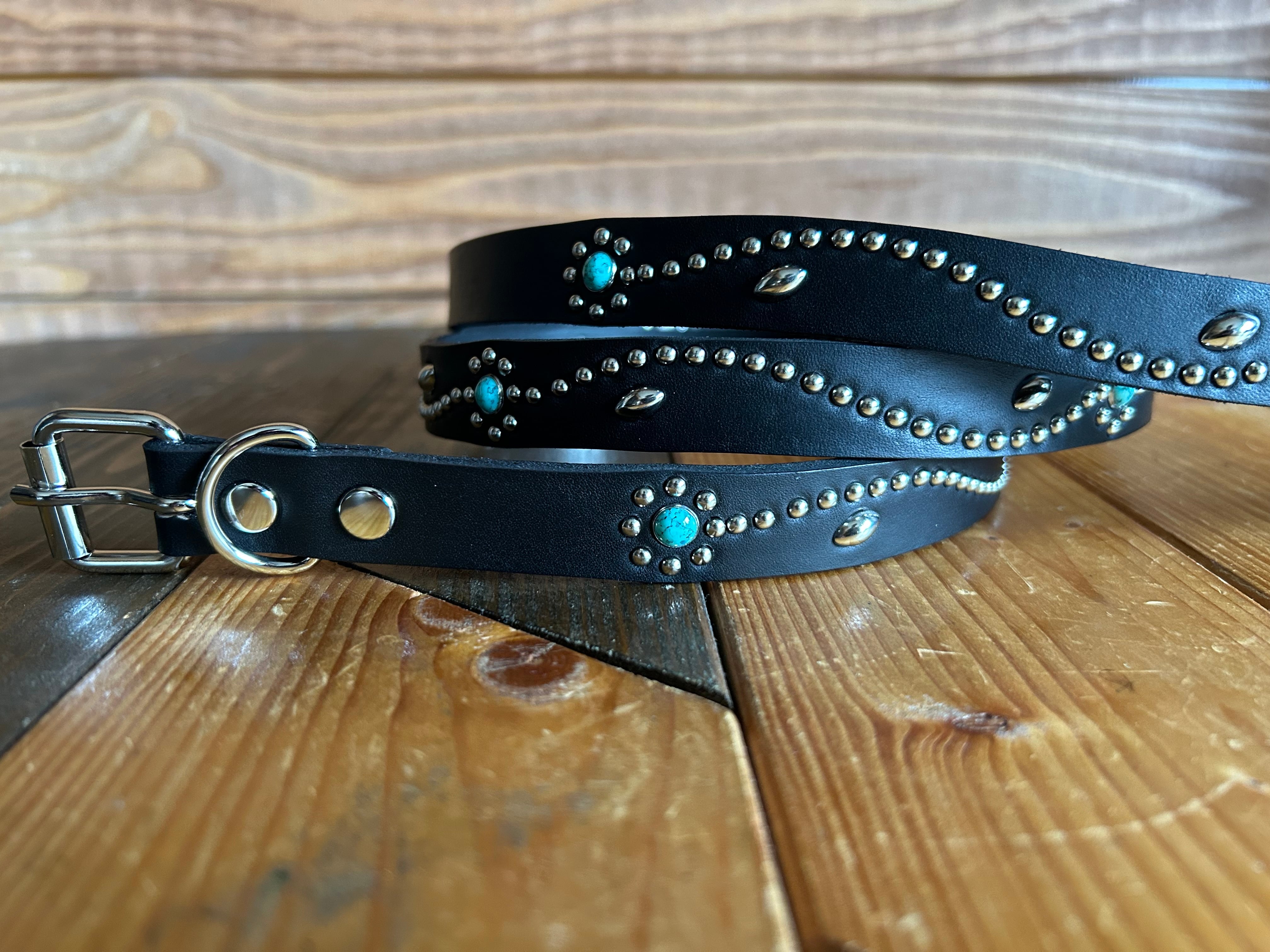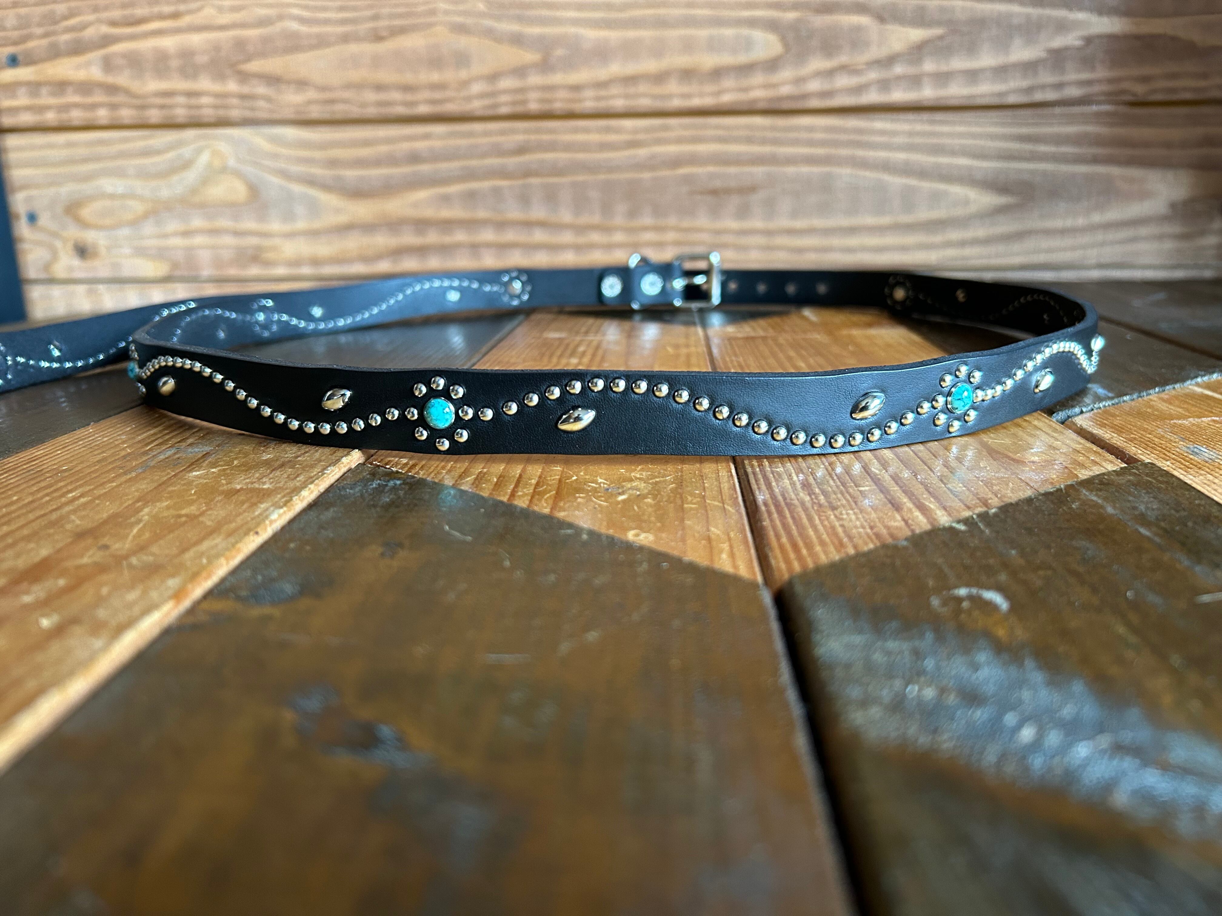 ベルト全体の360度にフラワーパターンスタッズを施したナローベルト。グリーンターコイズカラースタッズを使用。※バックルの留め具がスナップボタン式ですのでバックルの取り外しができます。
