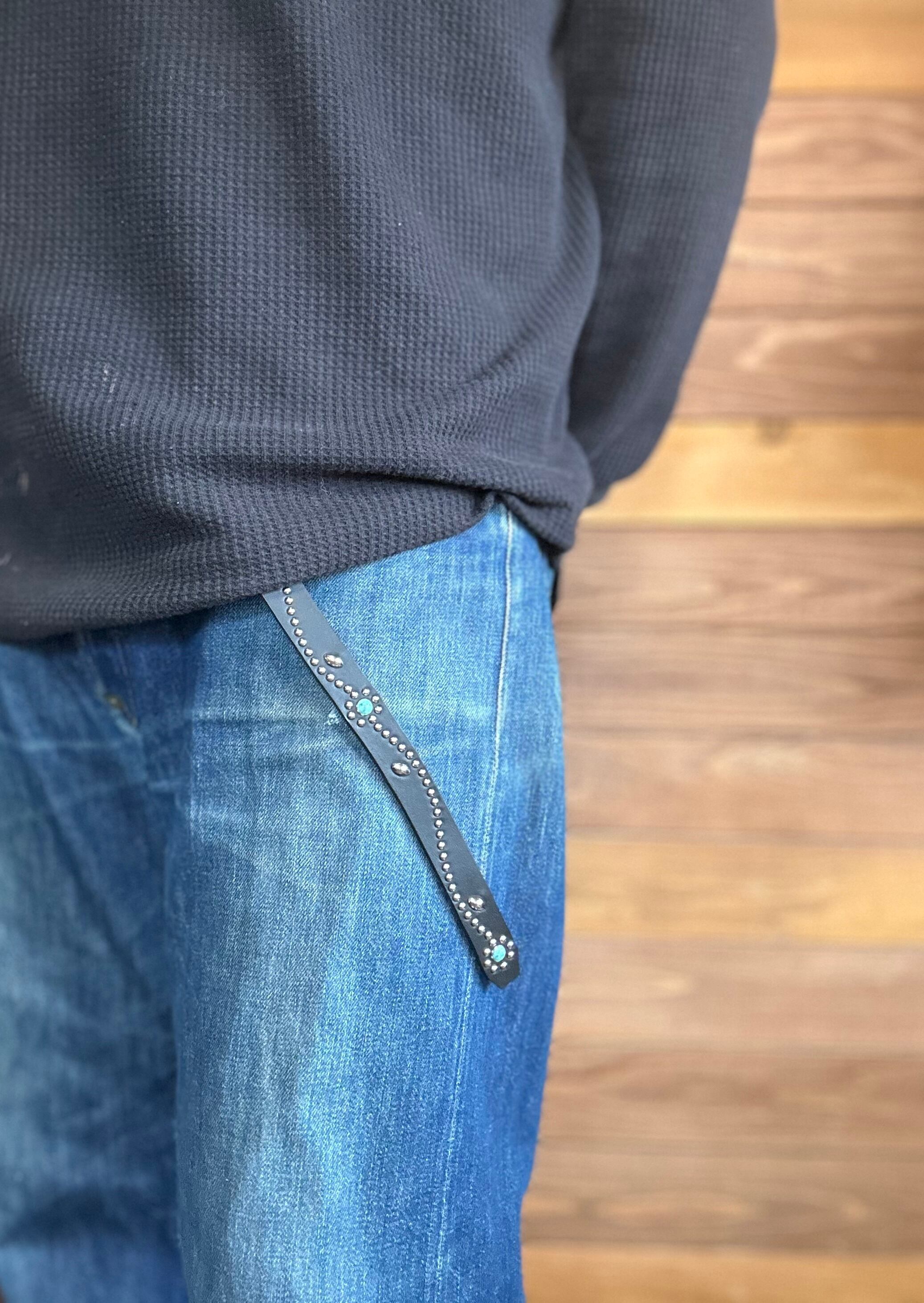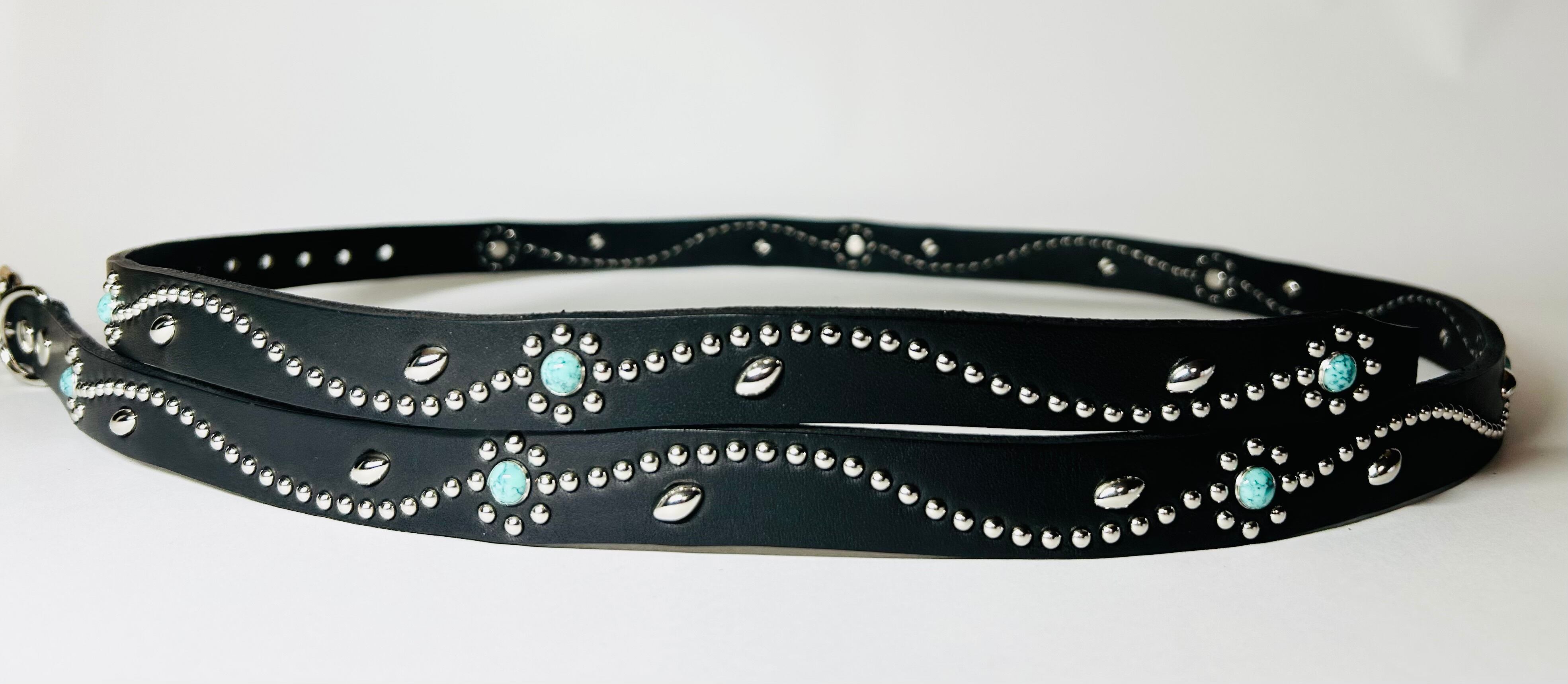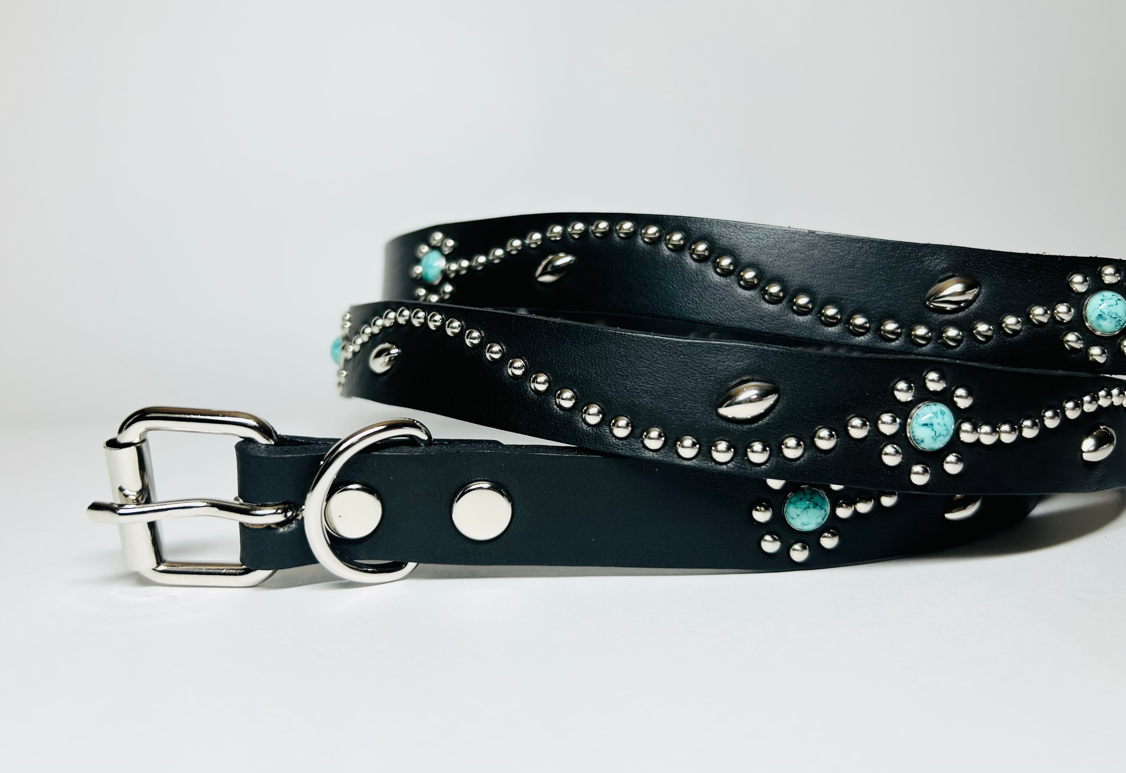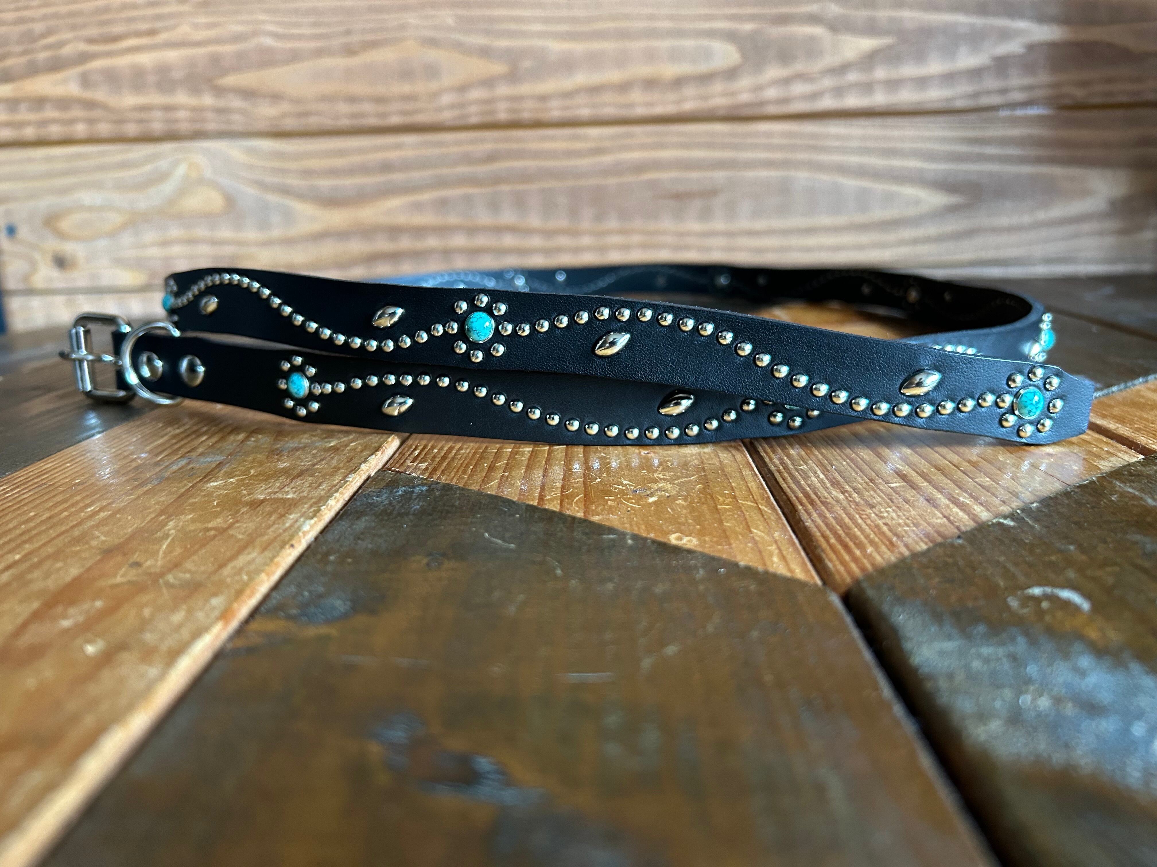 ベルト全体の360度にフラワーパターンスタッズを施したナローベルト。グリーンターコイズカラースタッズを使用。※バックルの留め具がスナップボタン式ですのでバックルの取り外しができます。