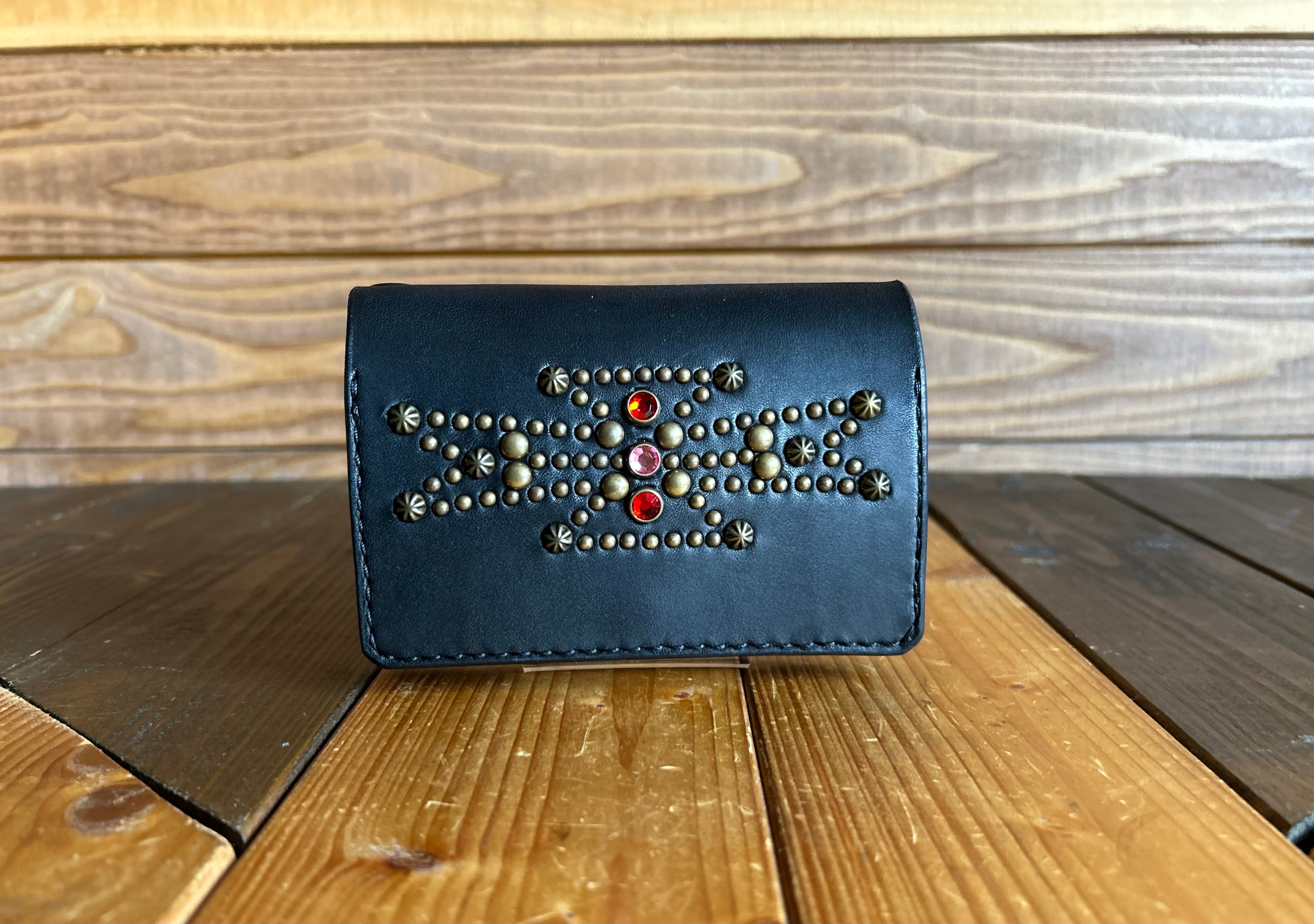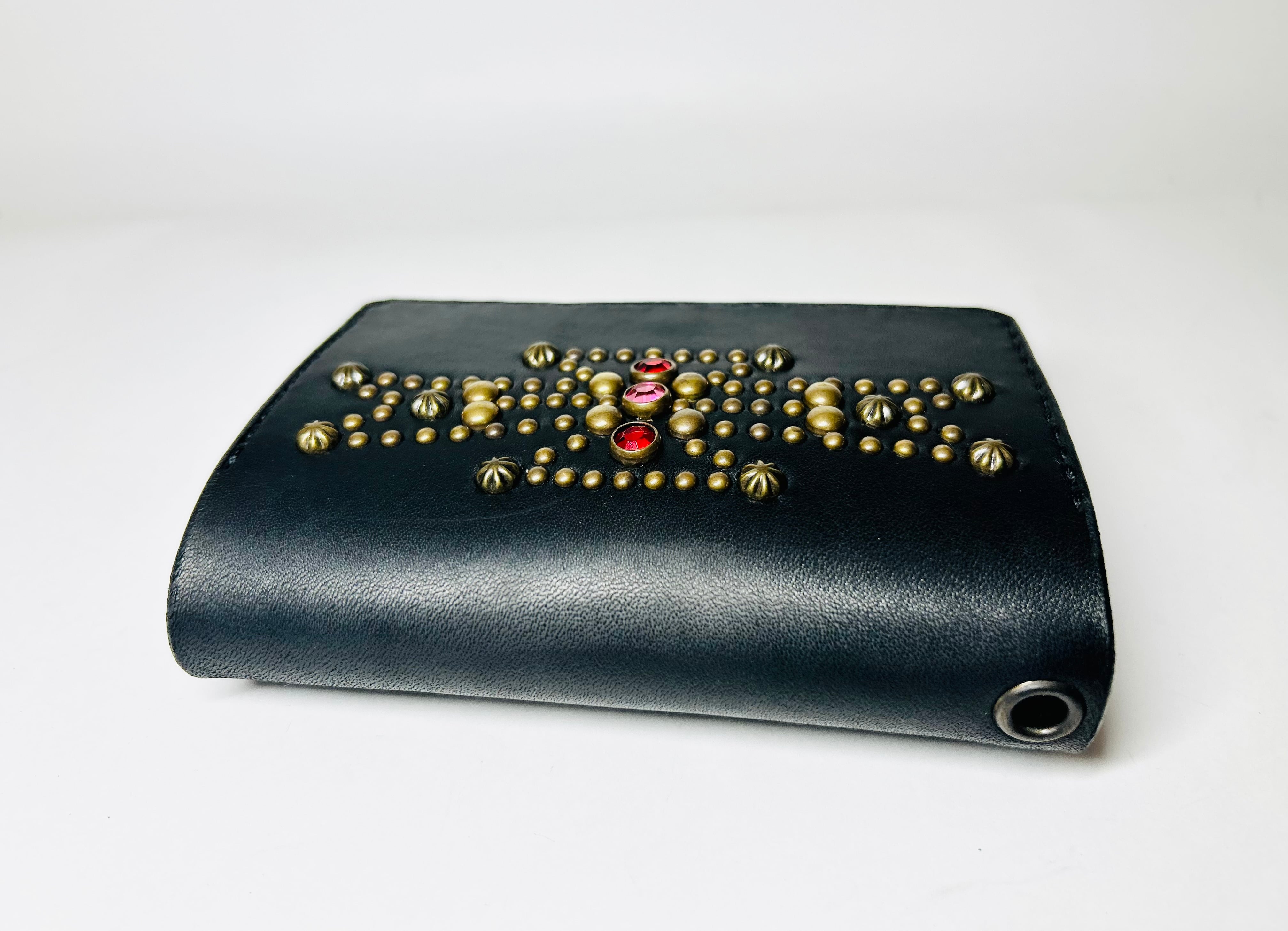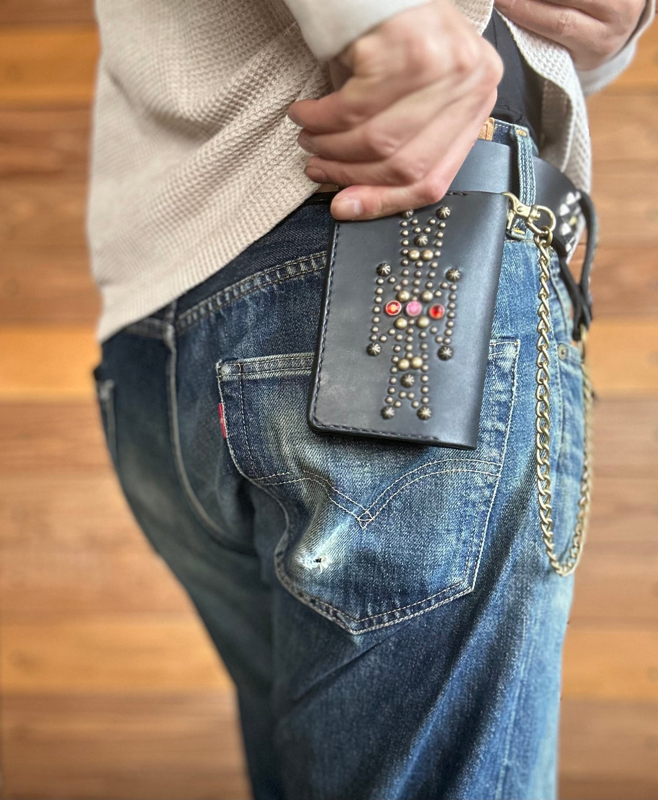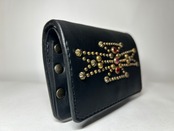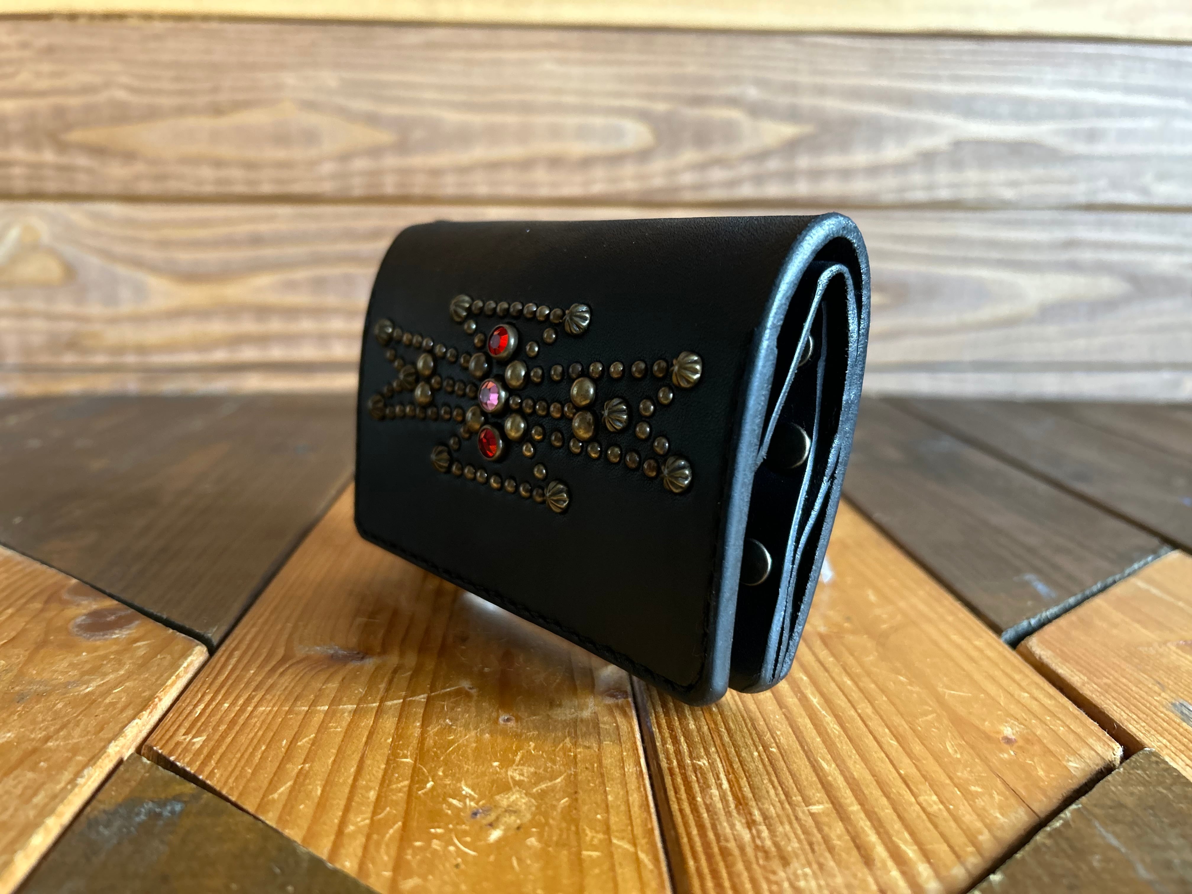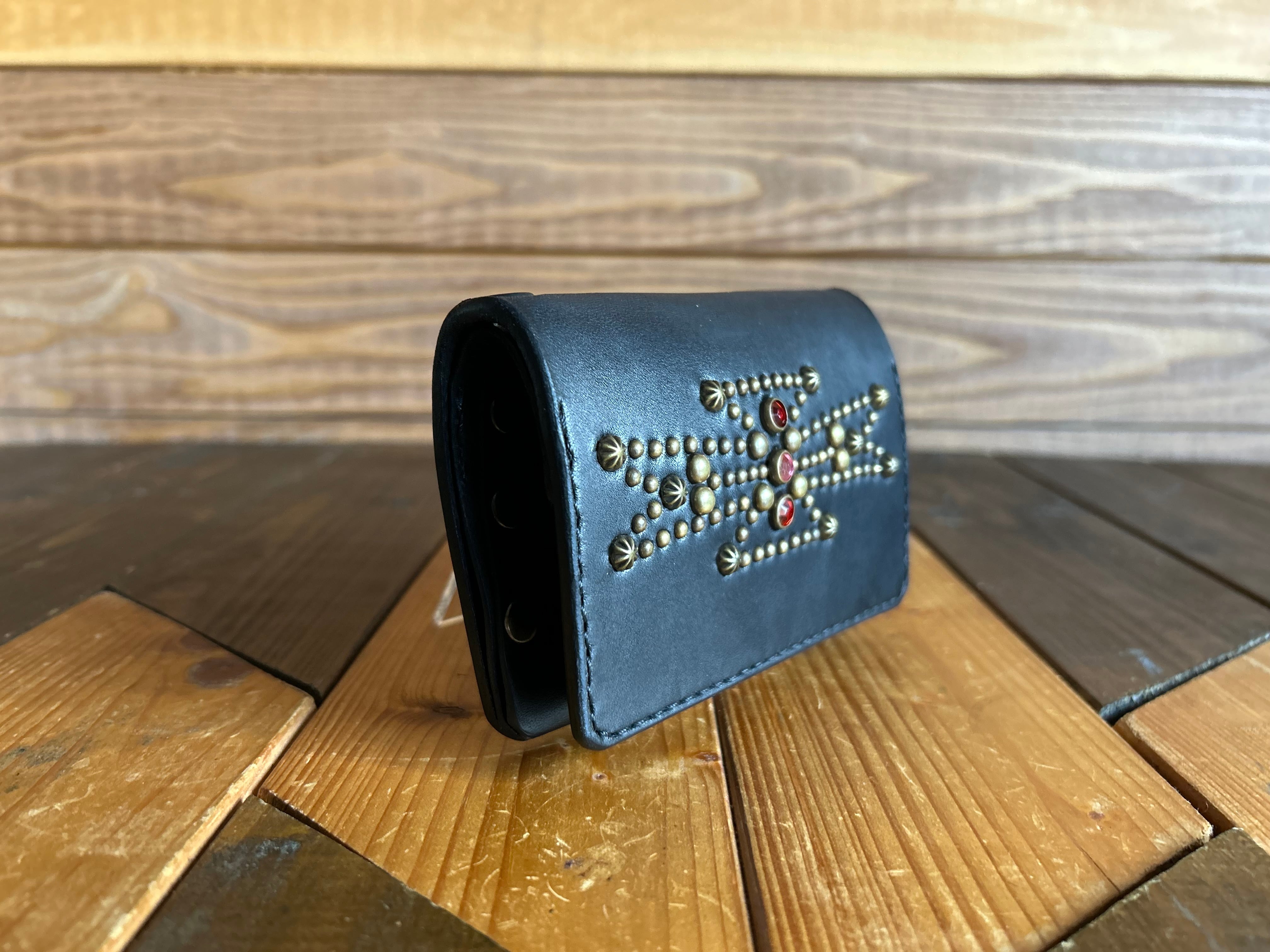サドルレザー【牛レザー】を使用したトラッカーウォレット。コインケースが一体となったウォレットは多数コインが入り、お札は折り畳んだ状態で10枚以上、カード類は7枚以上と見た目以上に収納が可能です。またバックポケット、フロントポケットに入る使い勝手のよいサイズ感となります。アメリカのニューメキシコ州北部にあるチマヨ村のオルテガ一族に伝えられてき柄をアンティークブラススタッズで表しています。【サイズ】閉じた状態で、縦9約センチ 横約13センチ