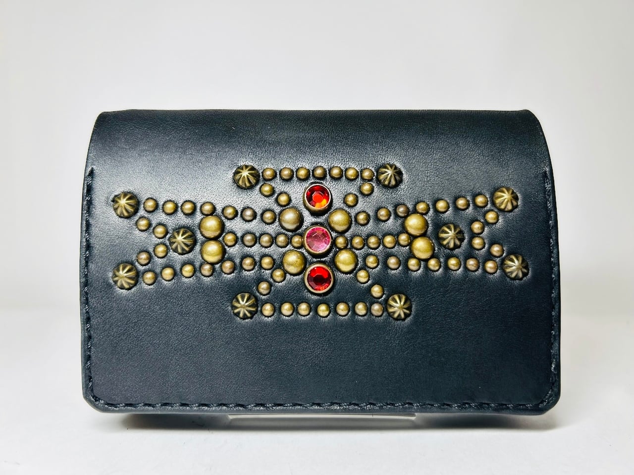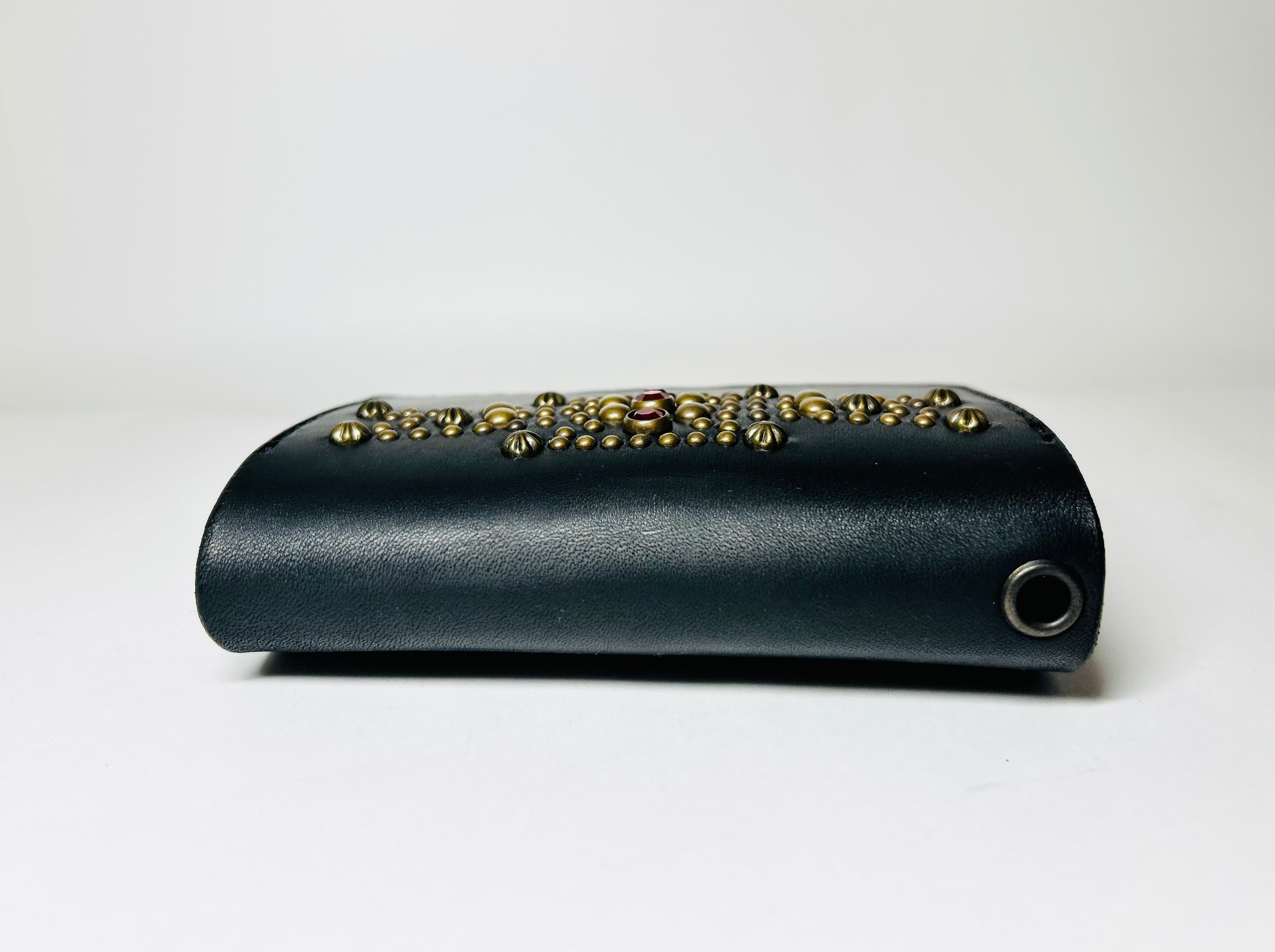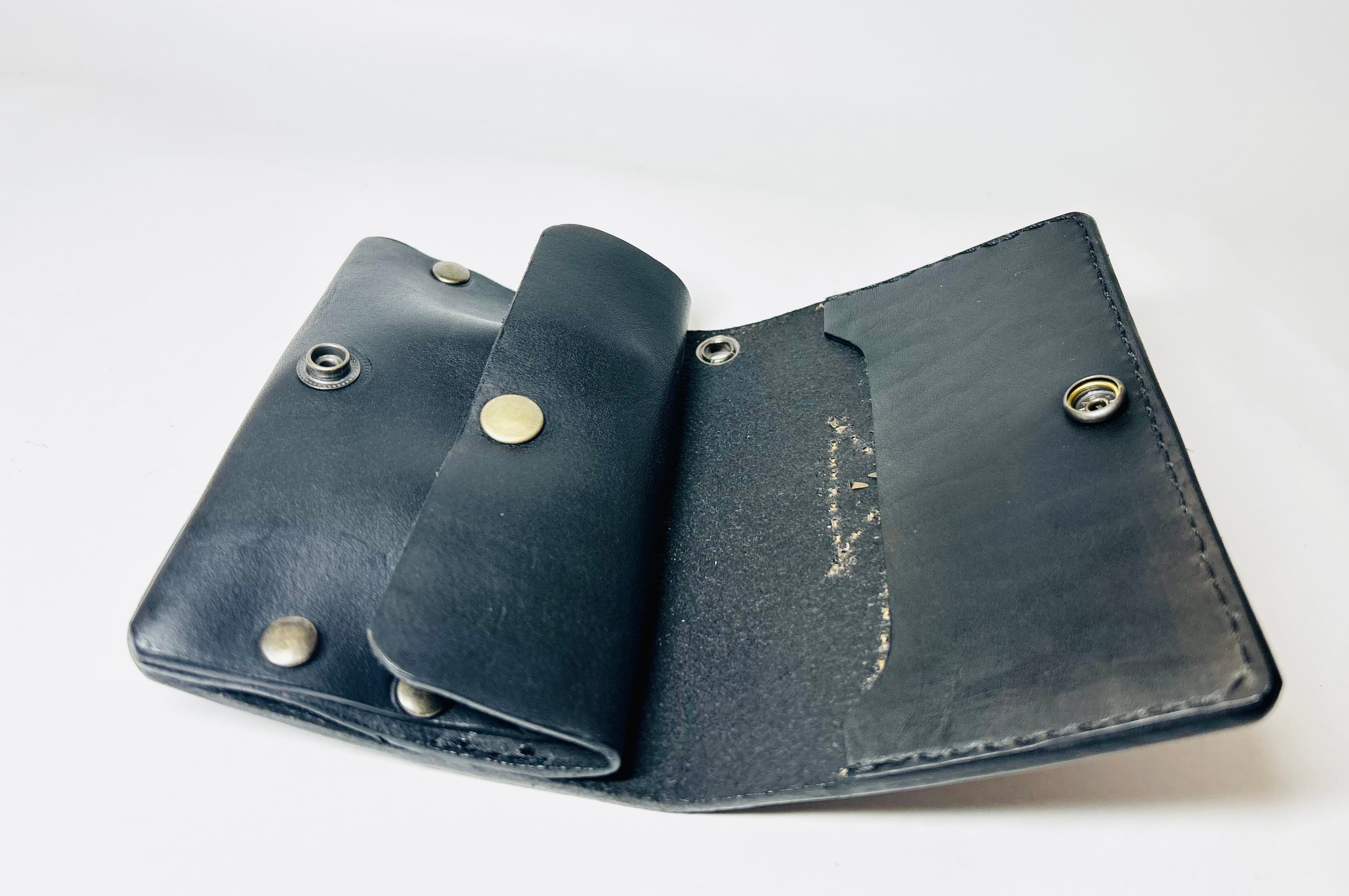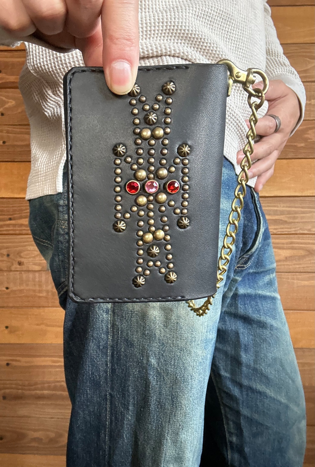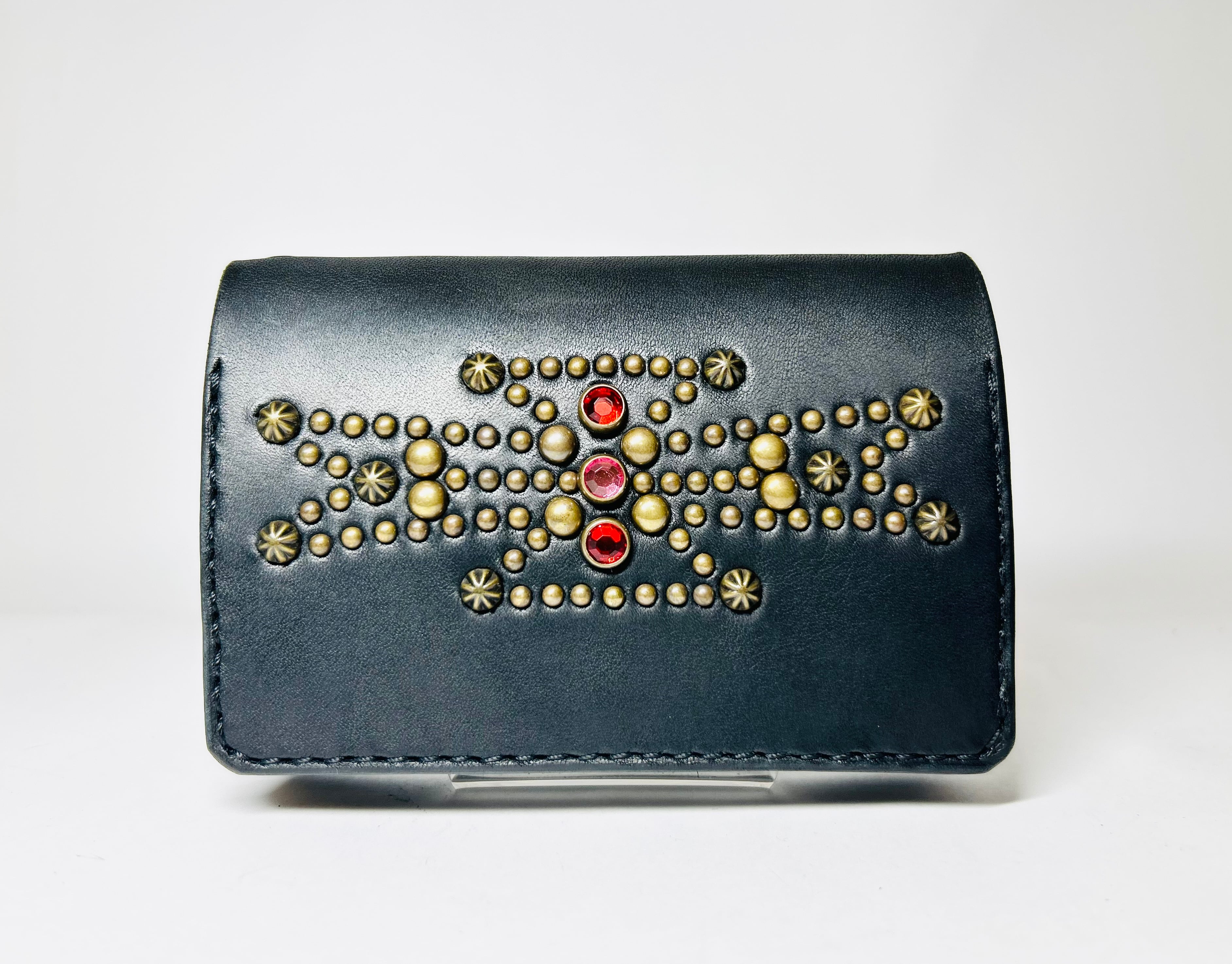 サドルレザー【牛レザー】を使用したトラッカーウォレット。コインケースが一体となったウォレットは多数コインが入り、お札は折り畳んだ状態で10枚以上、カード類は7枚以上と見た目以上に収納が可能です。またバックポケット、フロントポケットに入る使い勝手のよいサイズ感となります。アメリカのニューメキシコ州北部にあるチマヨ村のオルテガ一族に伝えられてき柄をアンティークブラススタッズで表しています。【サイズ】閉じた状態で、縦9約センチ 横約13センチ