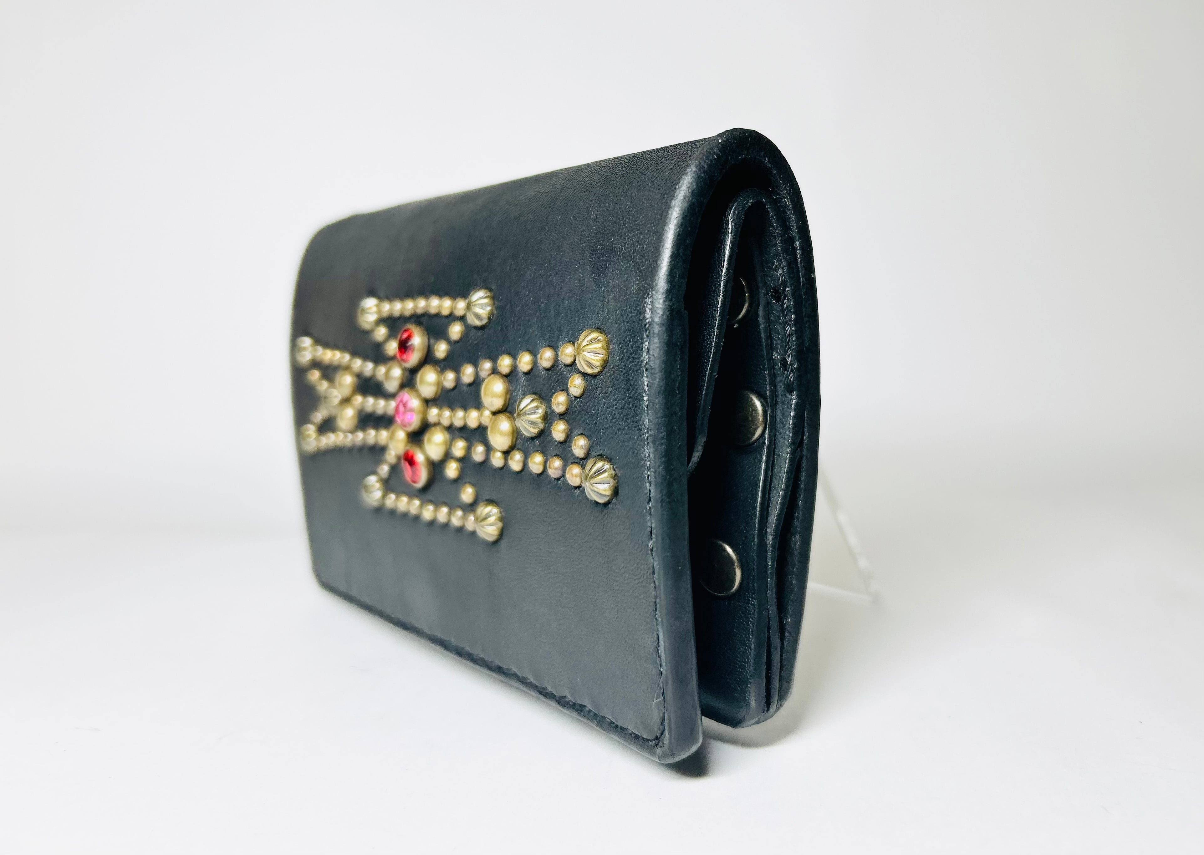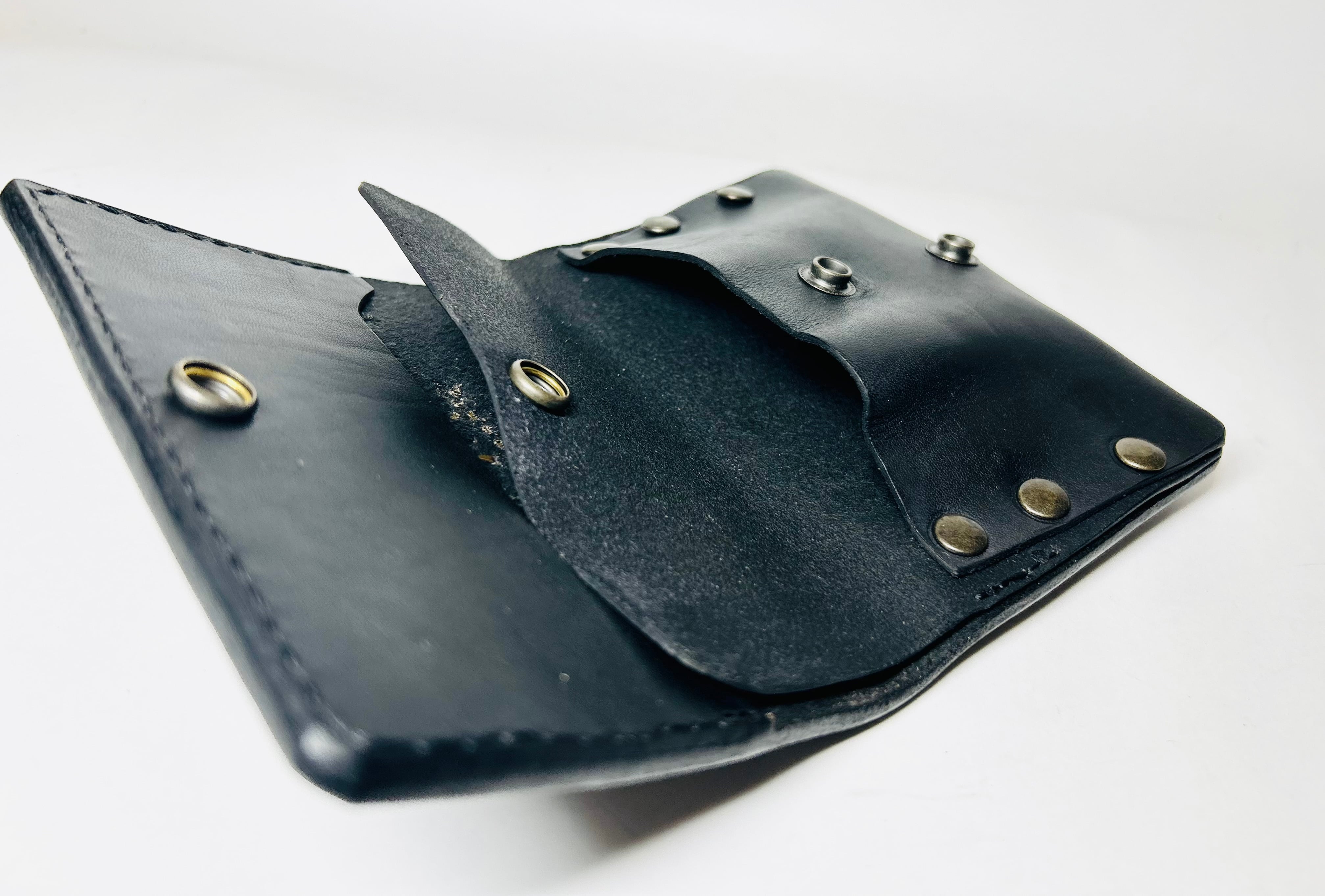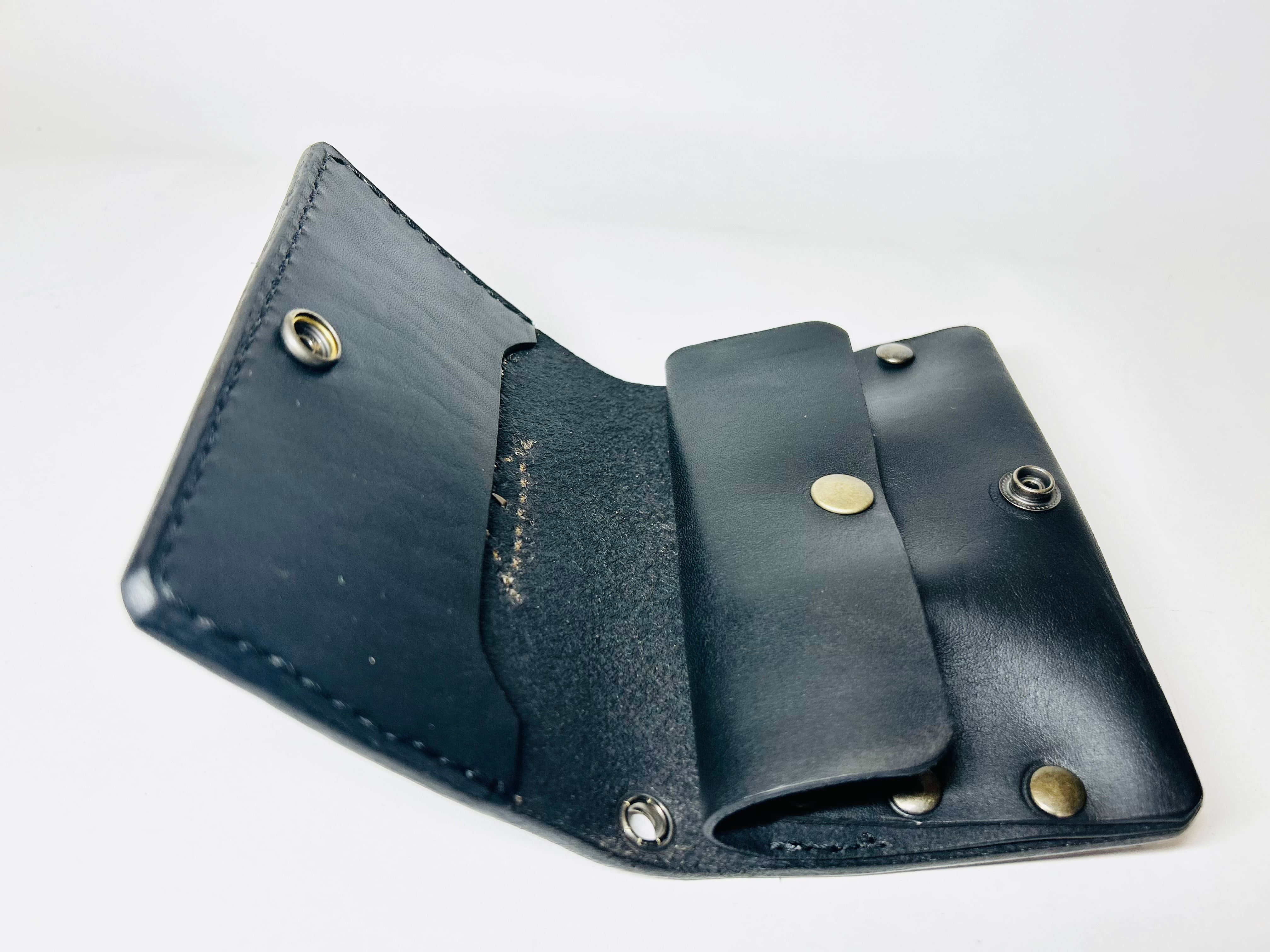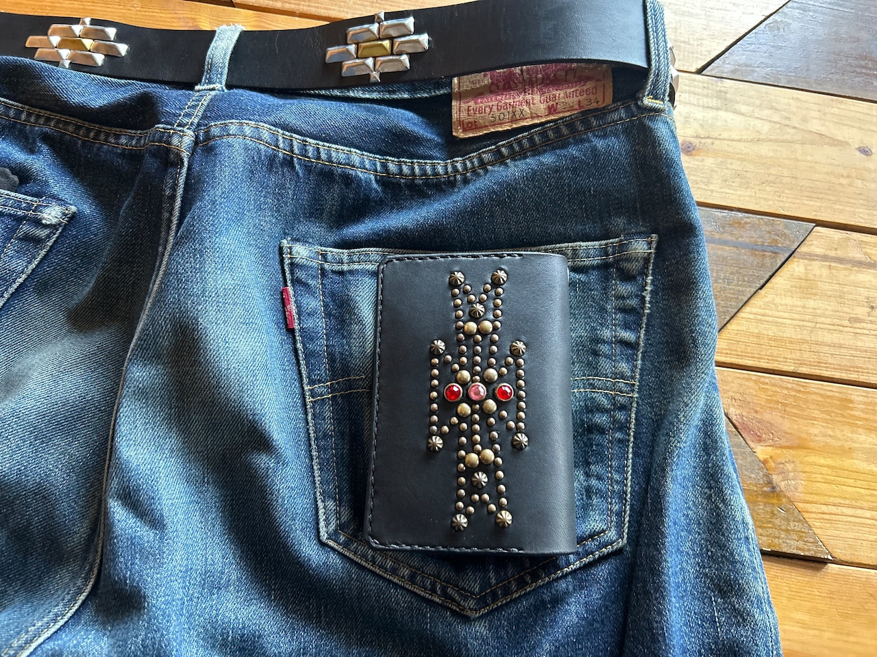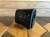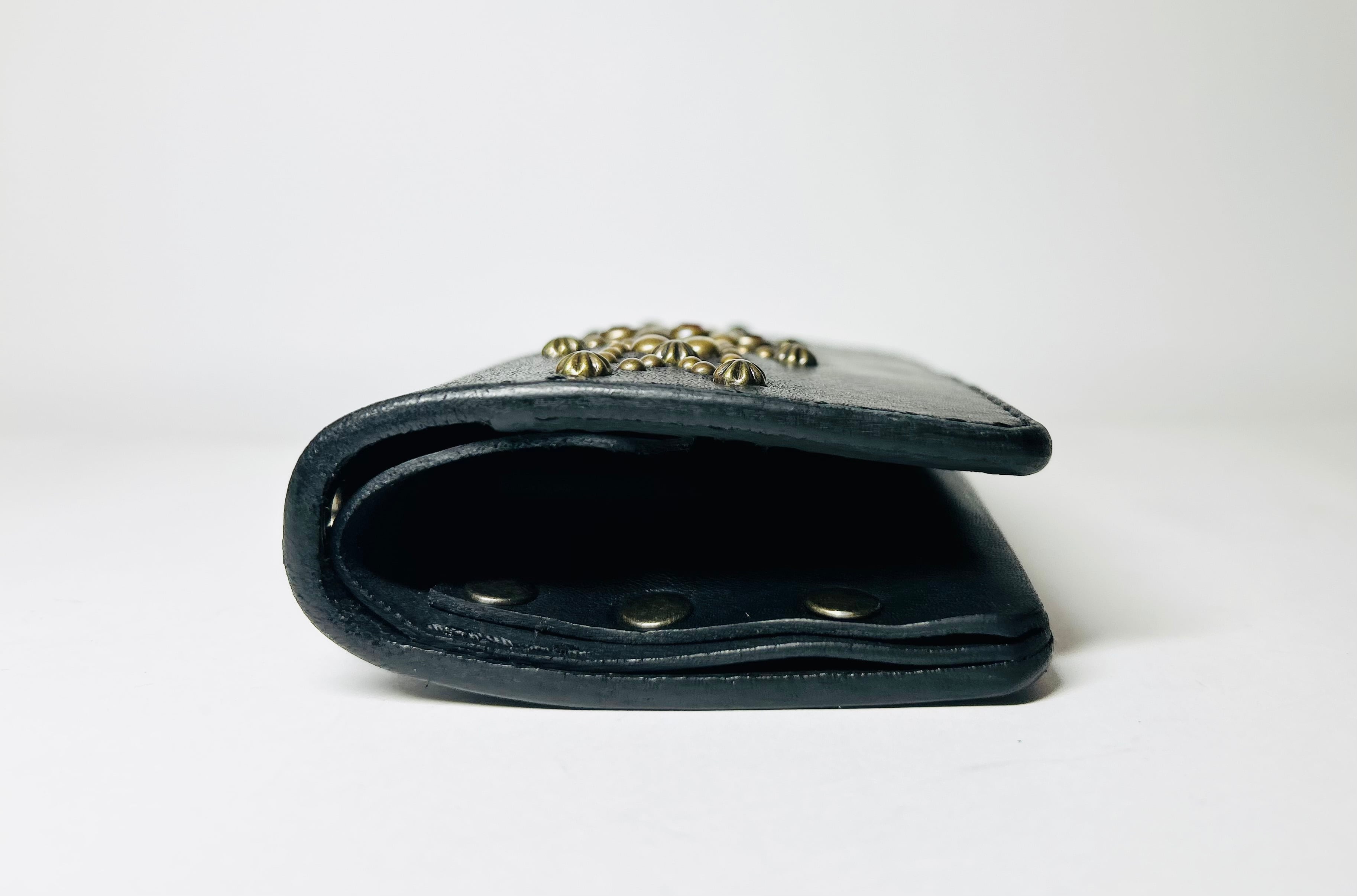 サドルレザー【牛レザー】を使用したトラッカーウォレット。コインケースが一体となったウォレットは多数コインが入り、お札は折り畳んだ状態で10枚以上、カード類は7枚以上と見た目以上に収納が可能です。またバックポケット、フロントポケットに入る使い勝手のよいサイズ感となります。アメリカのニューメキシコ州北部にあるチマヨ村のオルテガ一族に伝えられてき柄をアンティークブラススタッズで表しています。【サイズ】閉じた状態で、縦9約センチ 横約13センチ