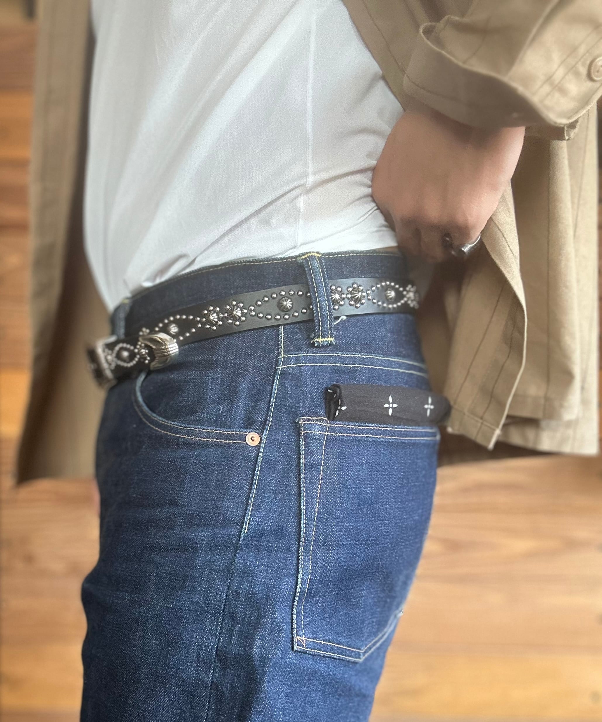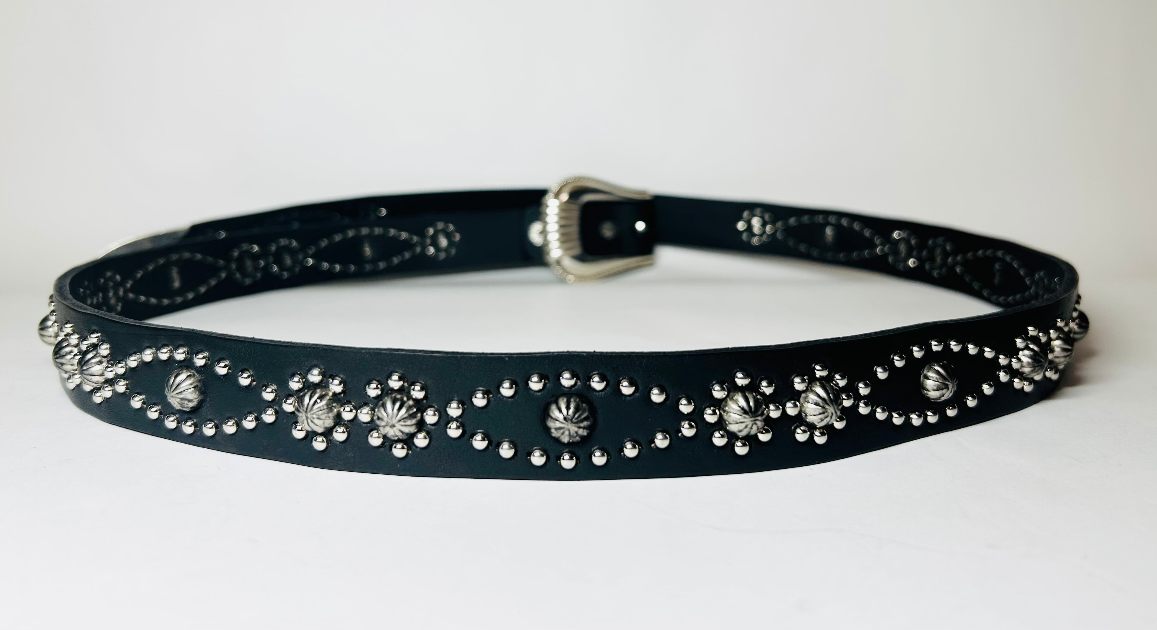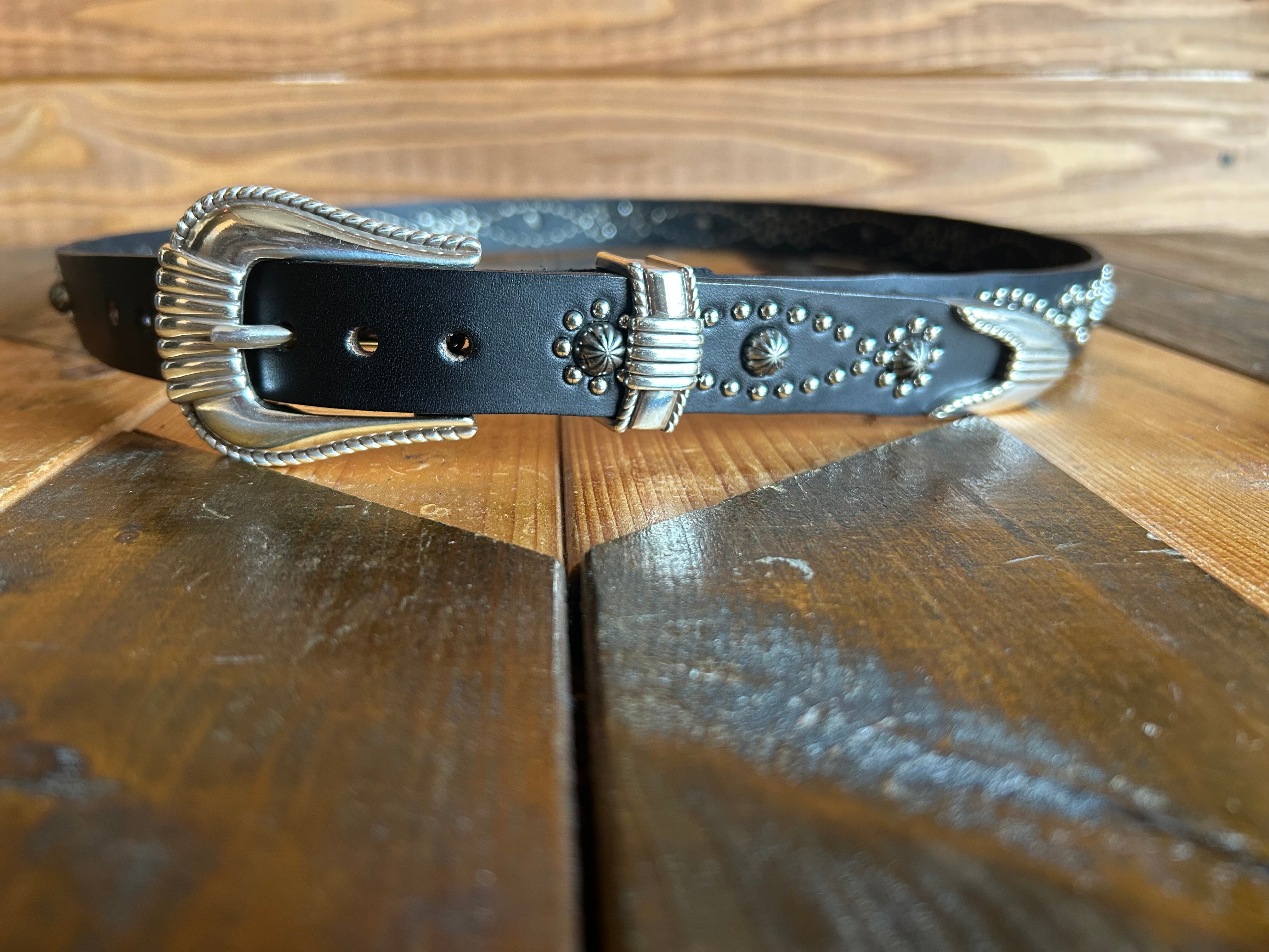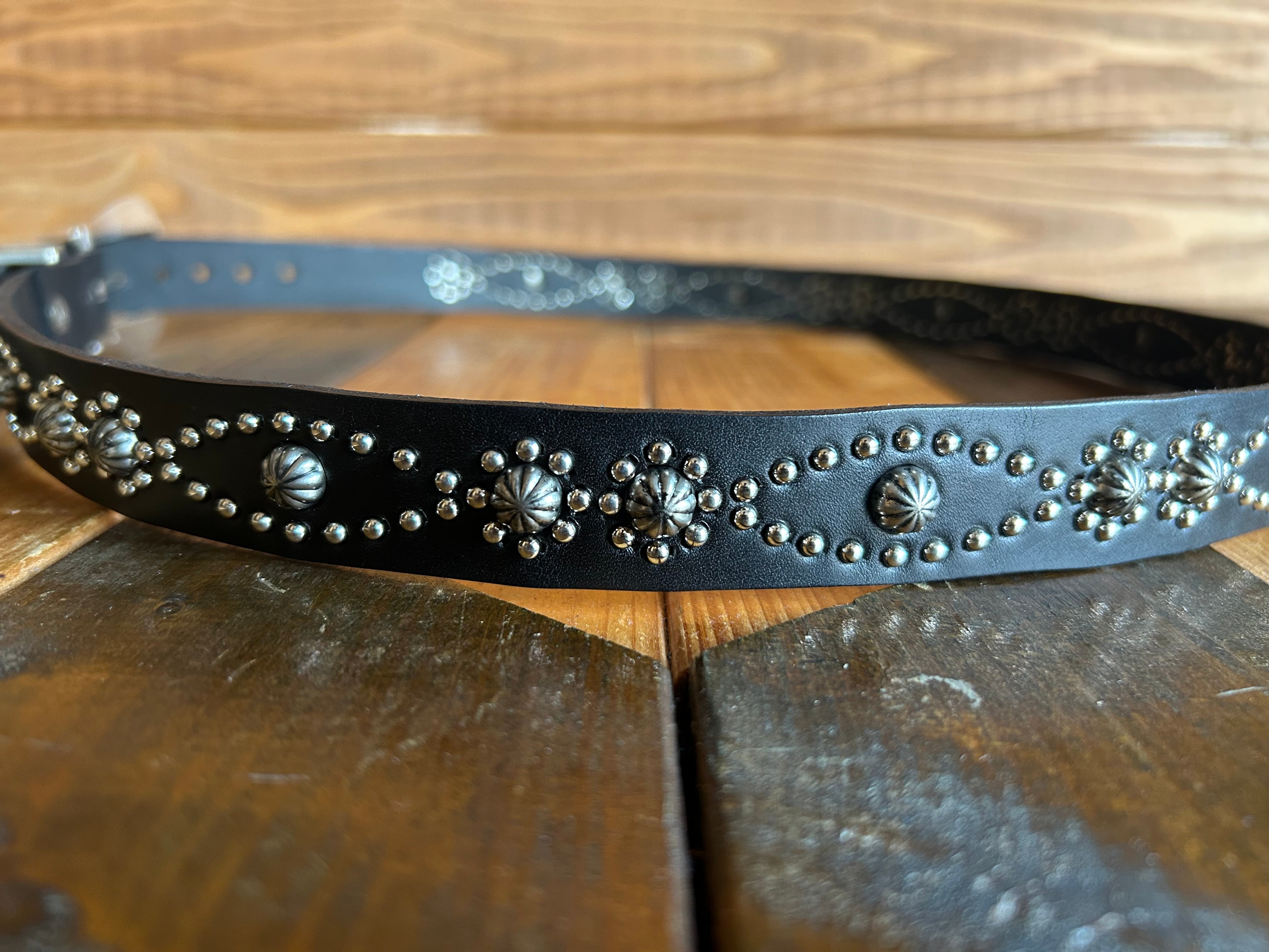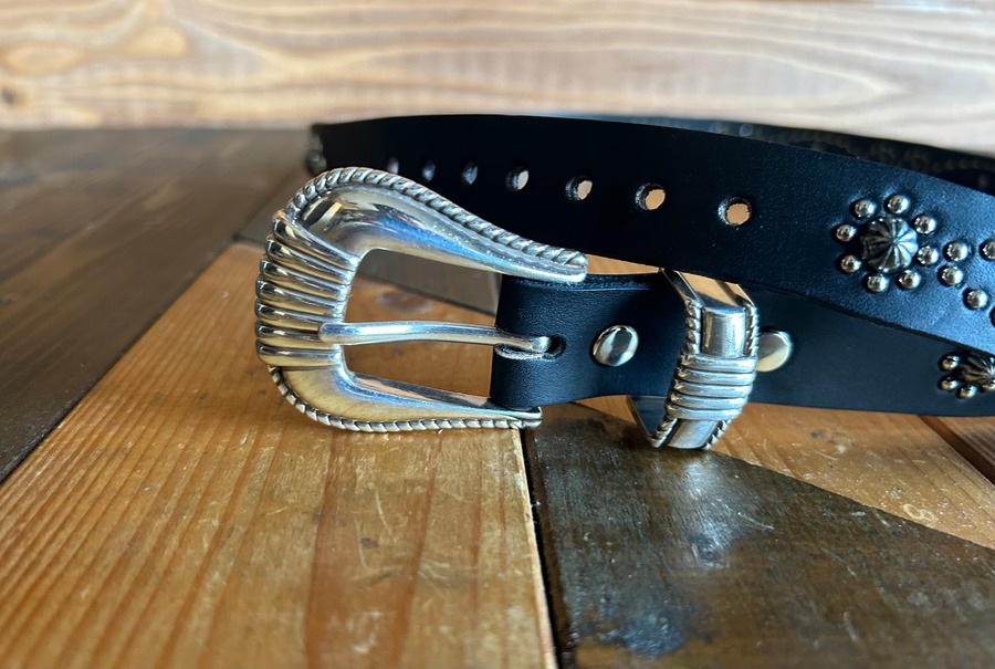 ローピング3ピースバックルを採用しベルト全面の360度にバタフライアポロを施したスタッズベルト。バックルの留め具はスナップボタン式ですので取り外しが可能です。