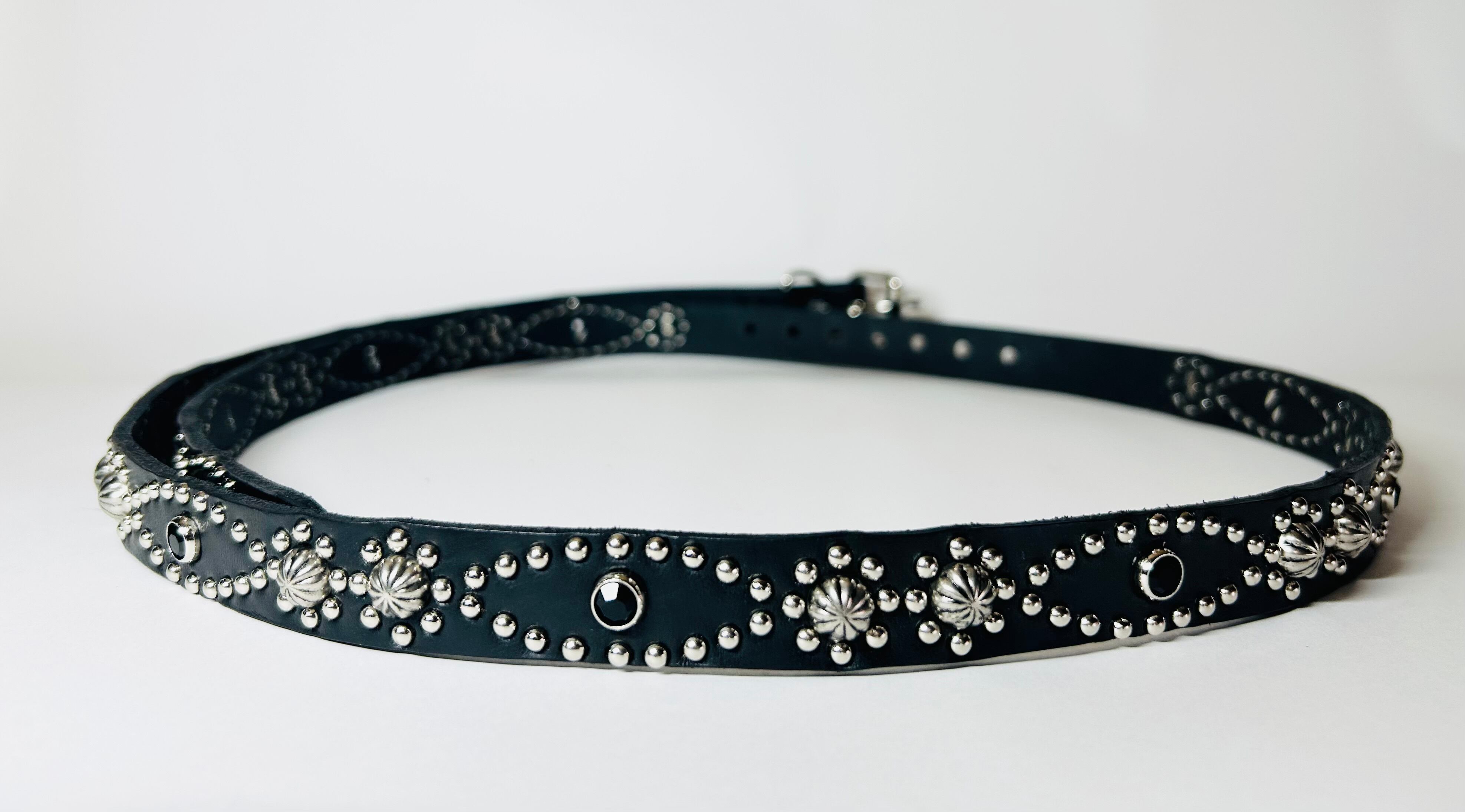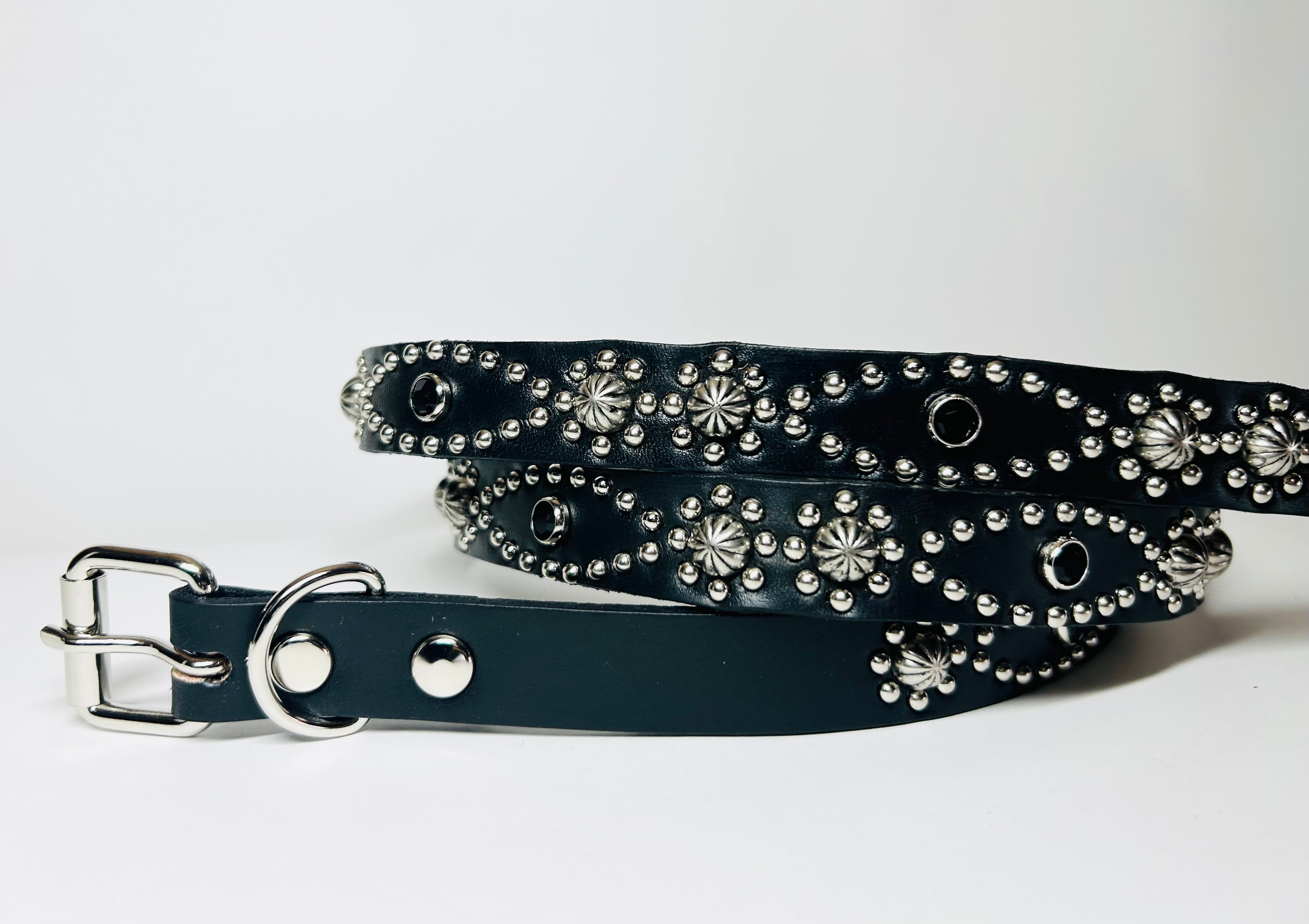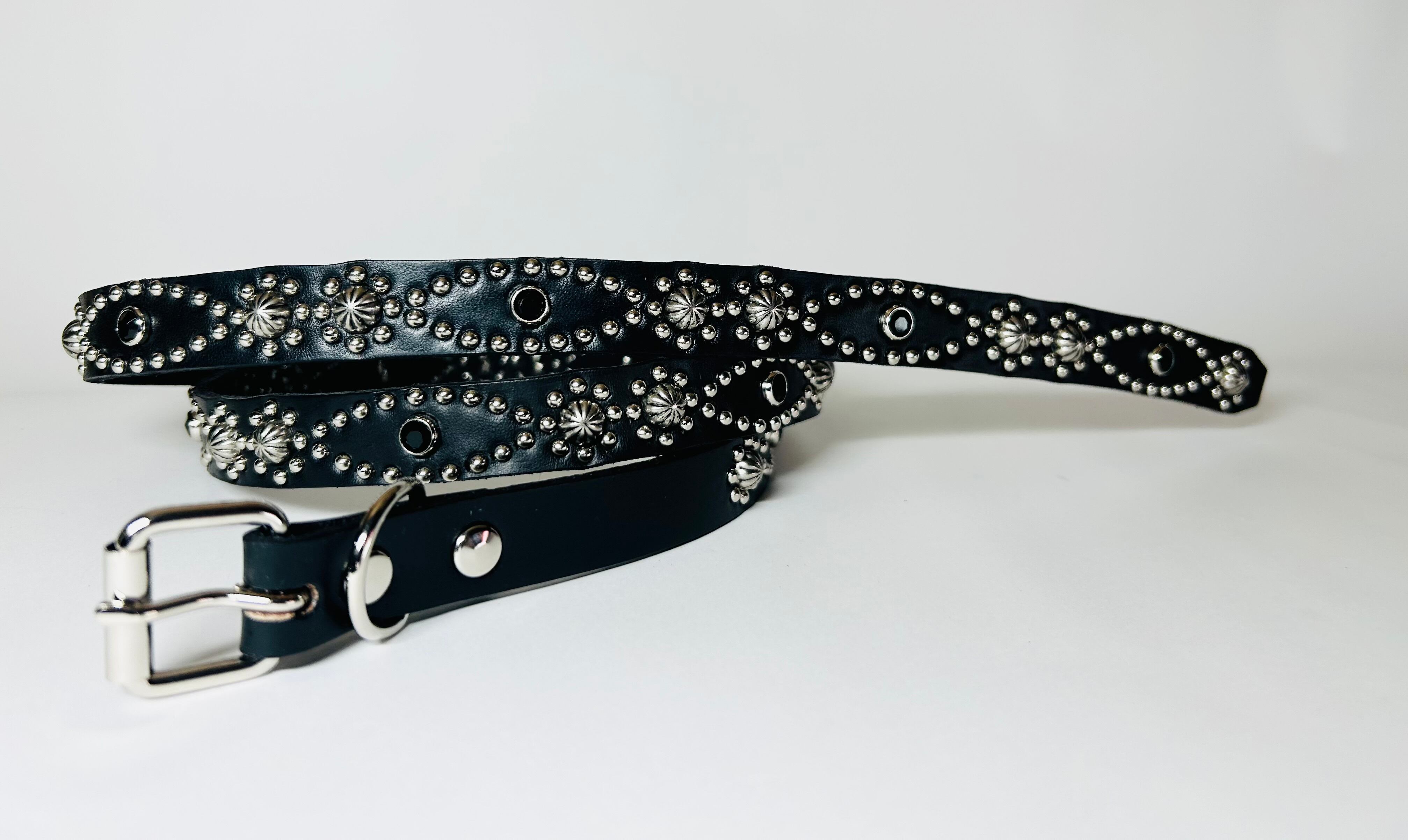 ベルトの全面360度にスタッズを施したナローベルト、着用画像はケンサキスクエアとなります。