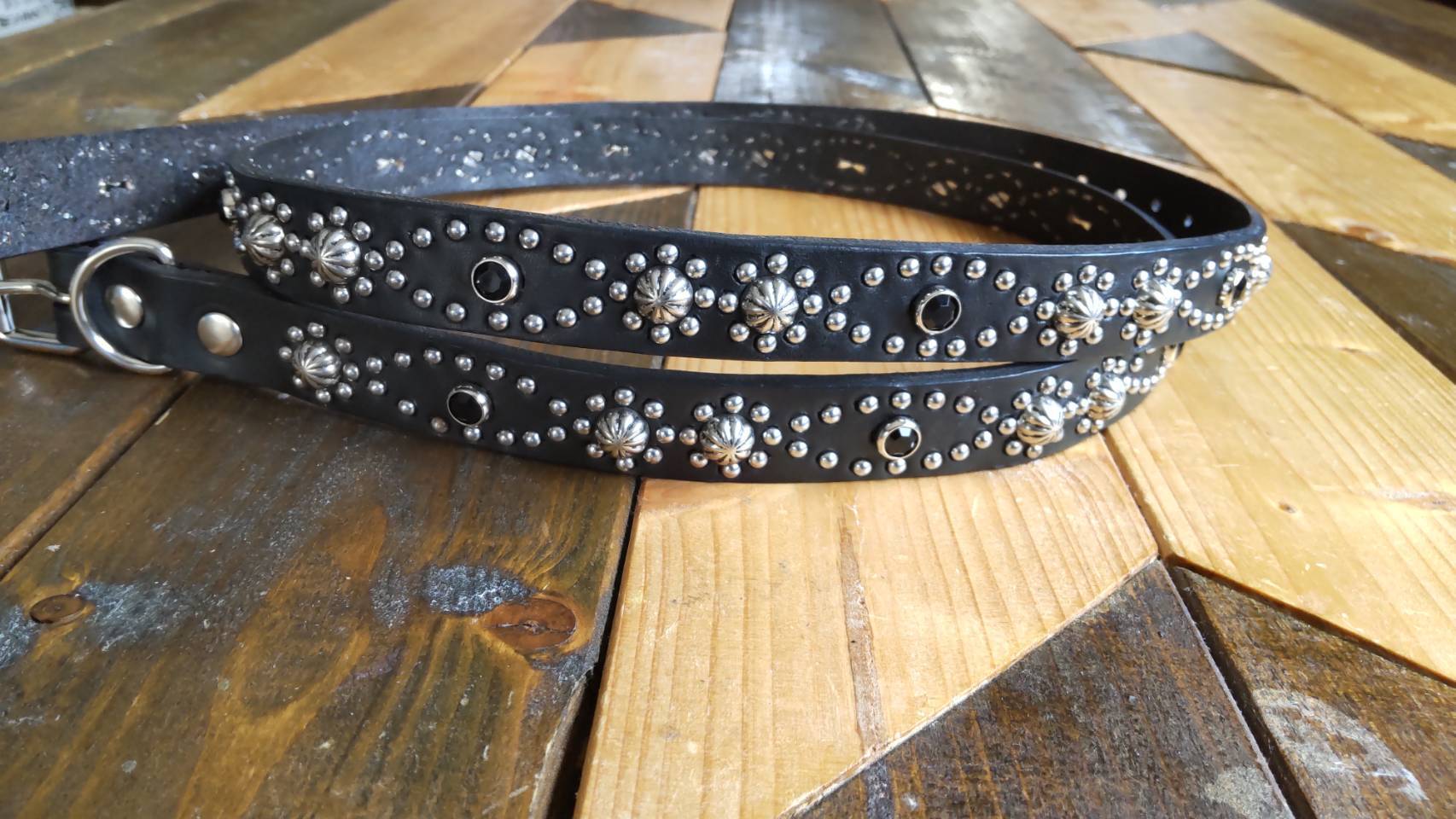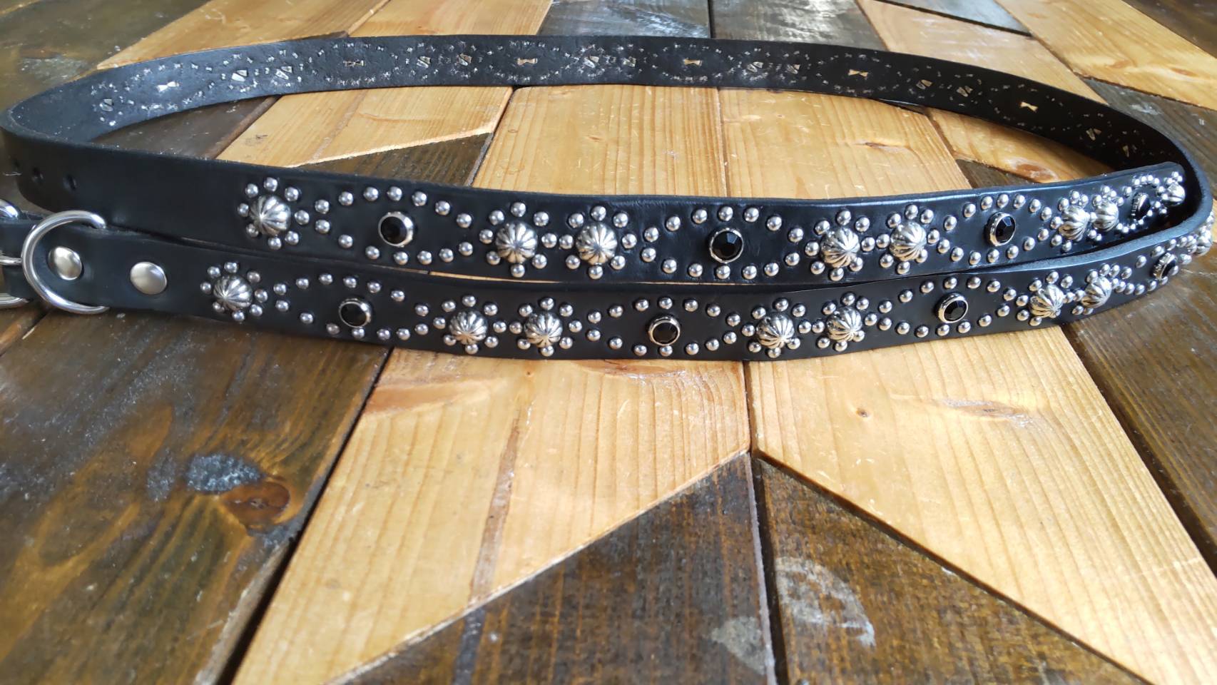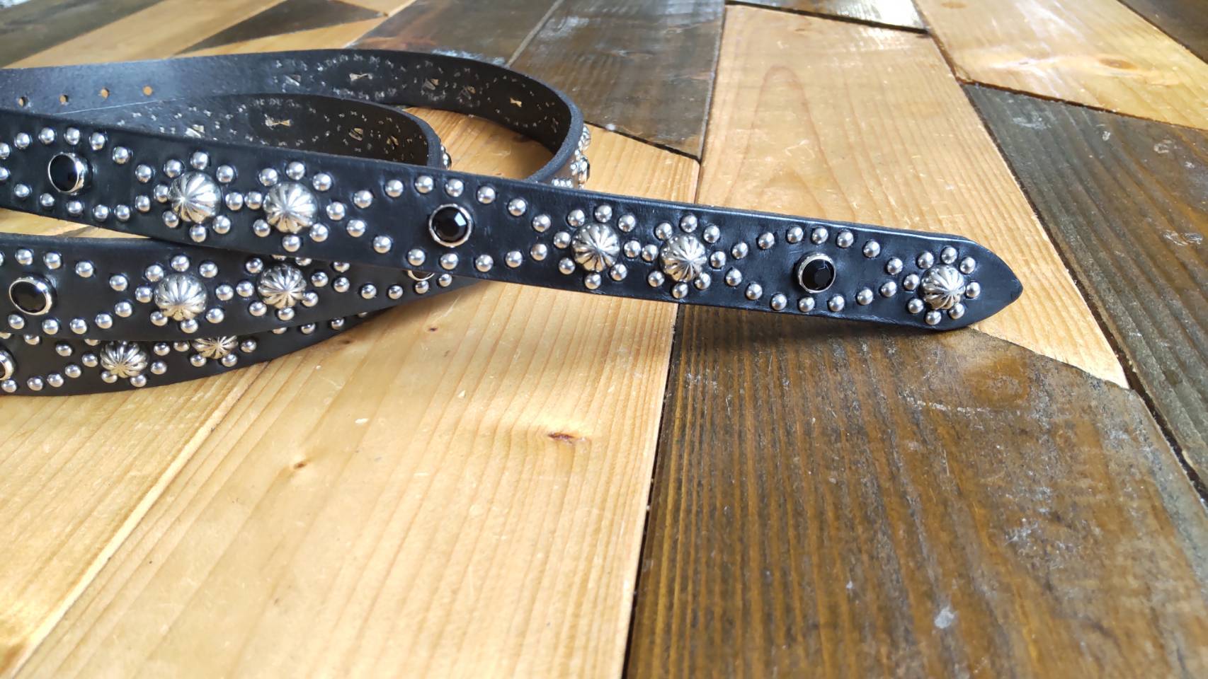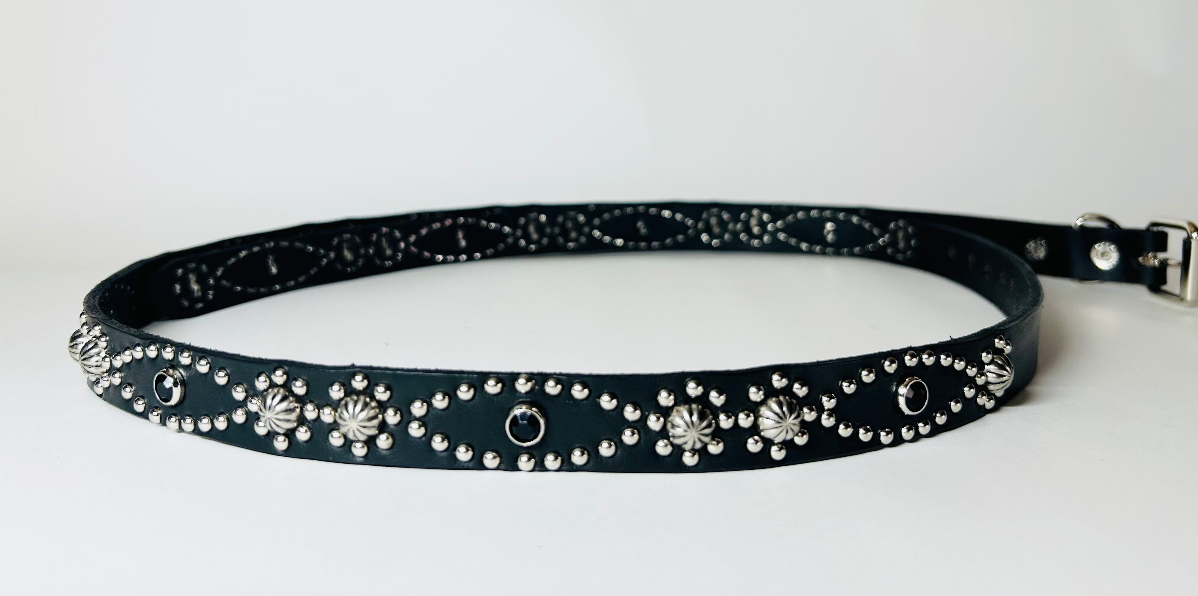 ベルトの全面360度にスタッズを施したナローベルト、着用画像はケンサキスクエアとなります。