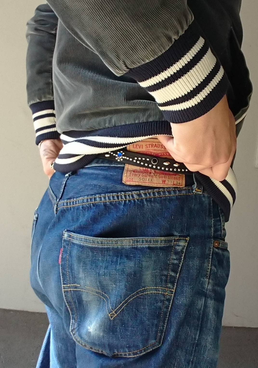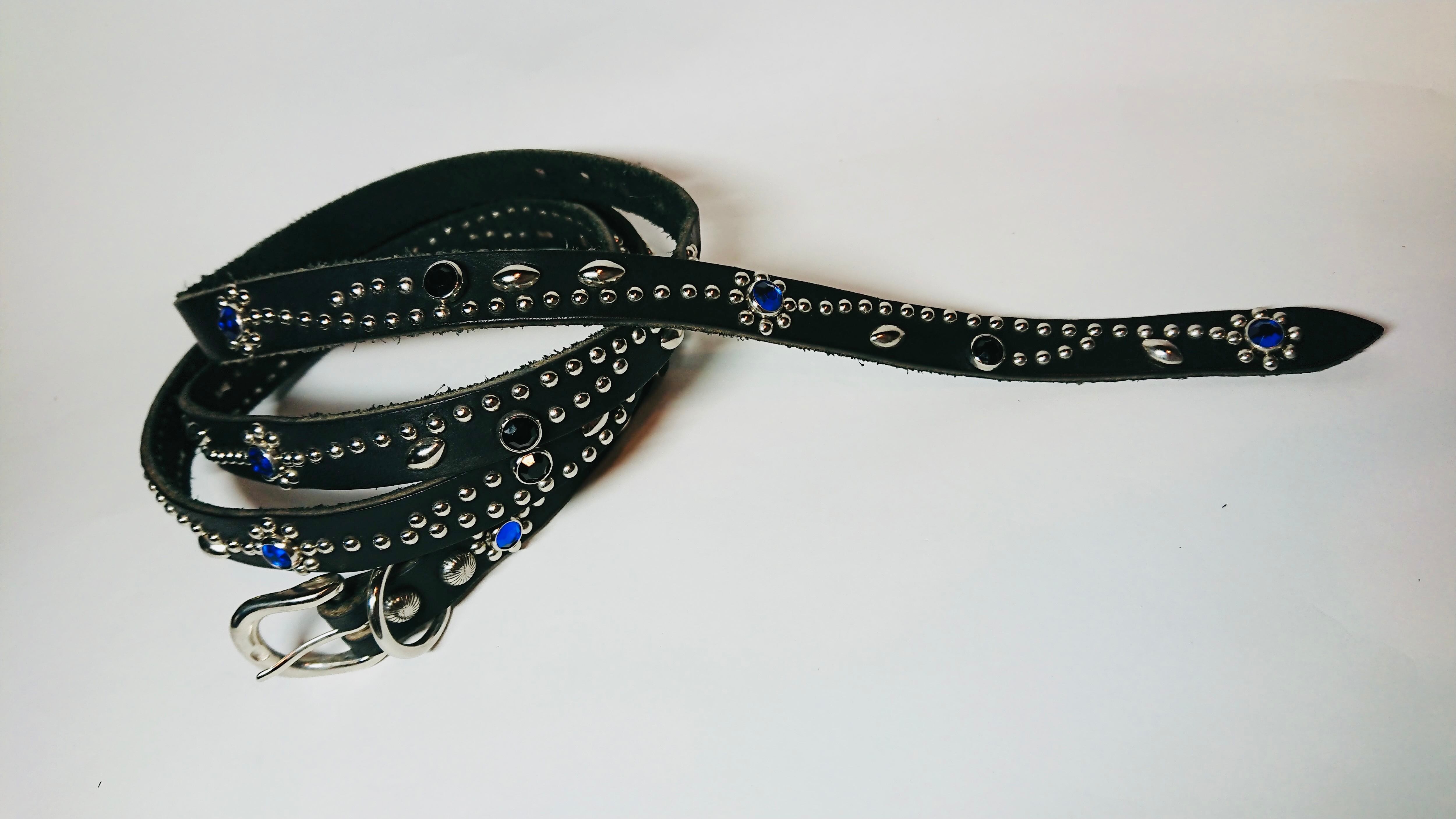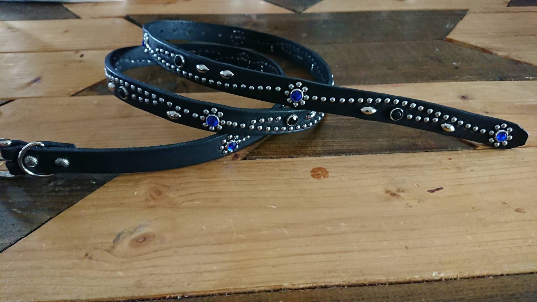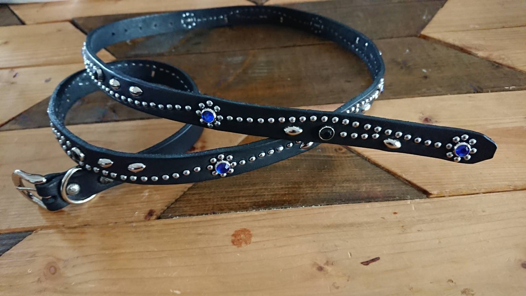 ベルト全体360度にスタッズを施したナローベルトです。ブラックとブルーのカラースタッズを使用しています。