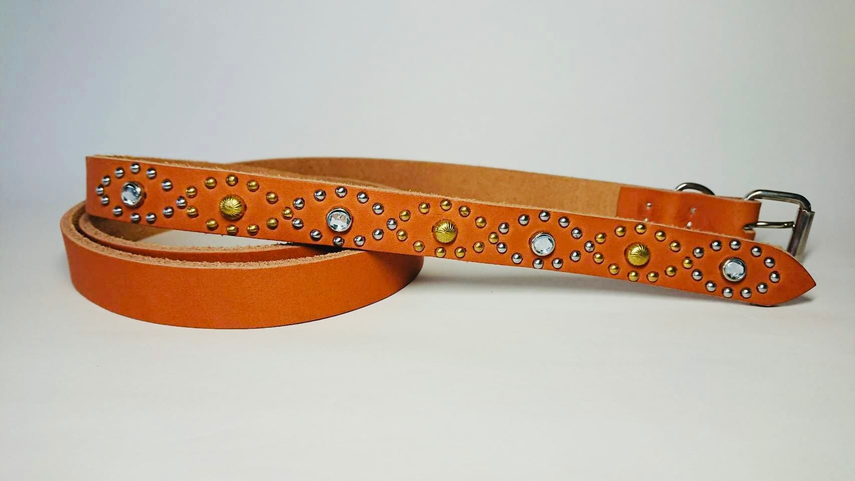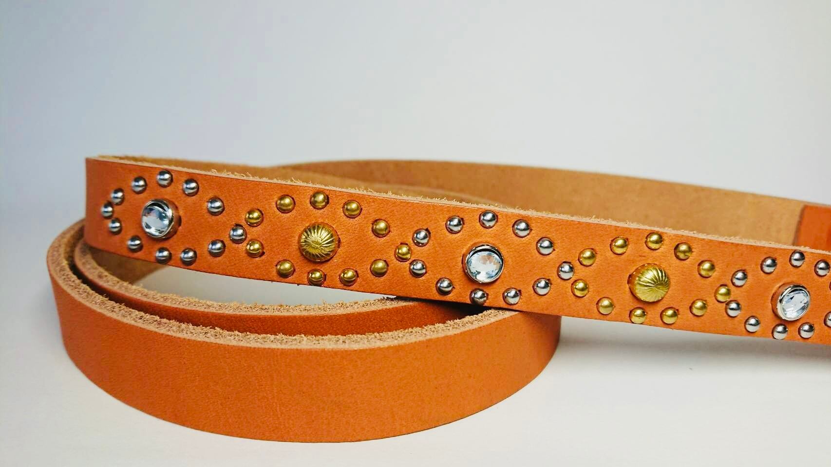 ケンサキにブラスゴールドスタッズとシルバースタッズを施したナローベルト。革色【ライトブラウン】【ゴールドブラススタッズ】はクスミのない明るいゴールド色のスタッズです。