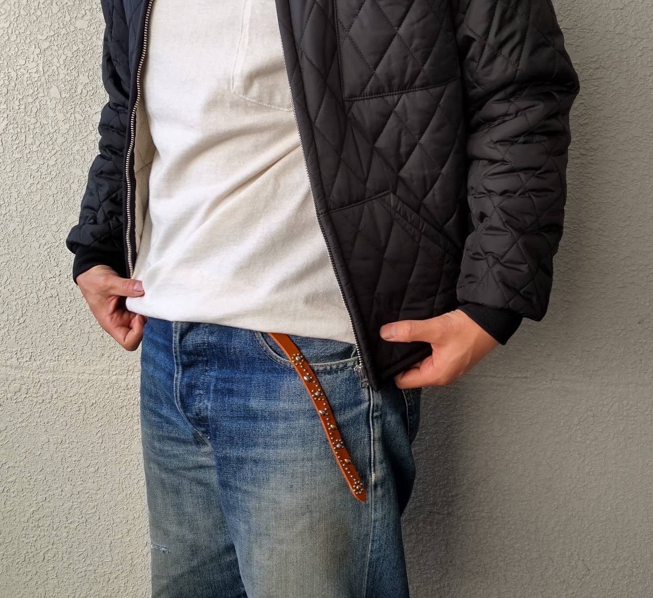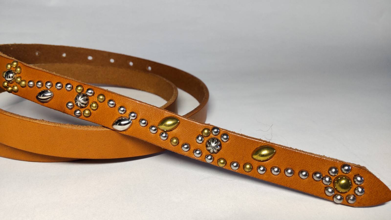 ベルトの剣先のみにゴールドブラススタッズとシルバースタッズでコントラストフラワーを施したナローベルト。革色【ライトブラウン】