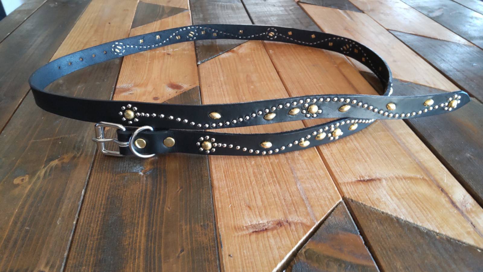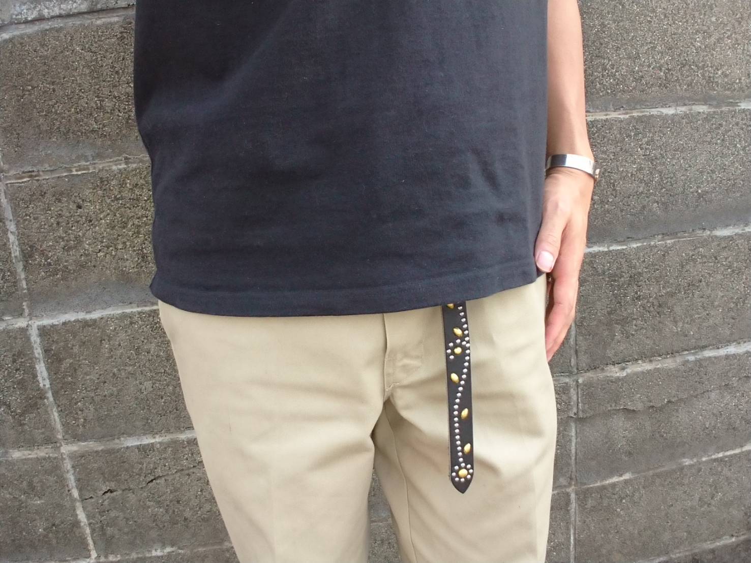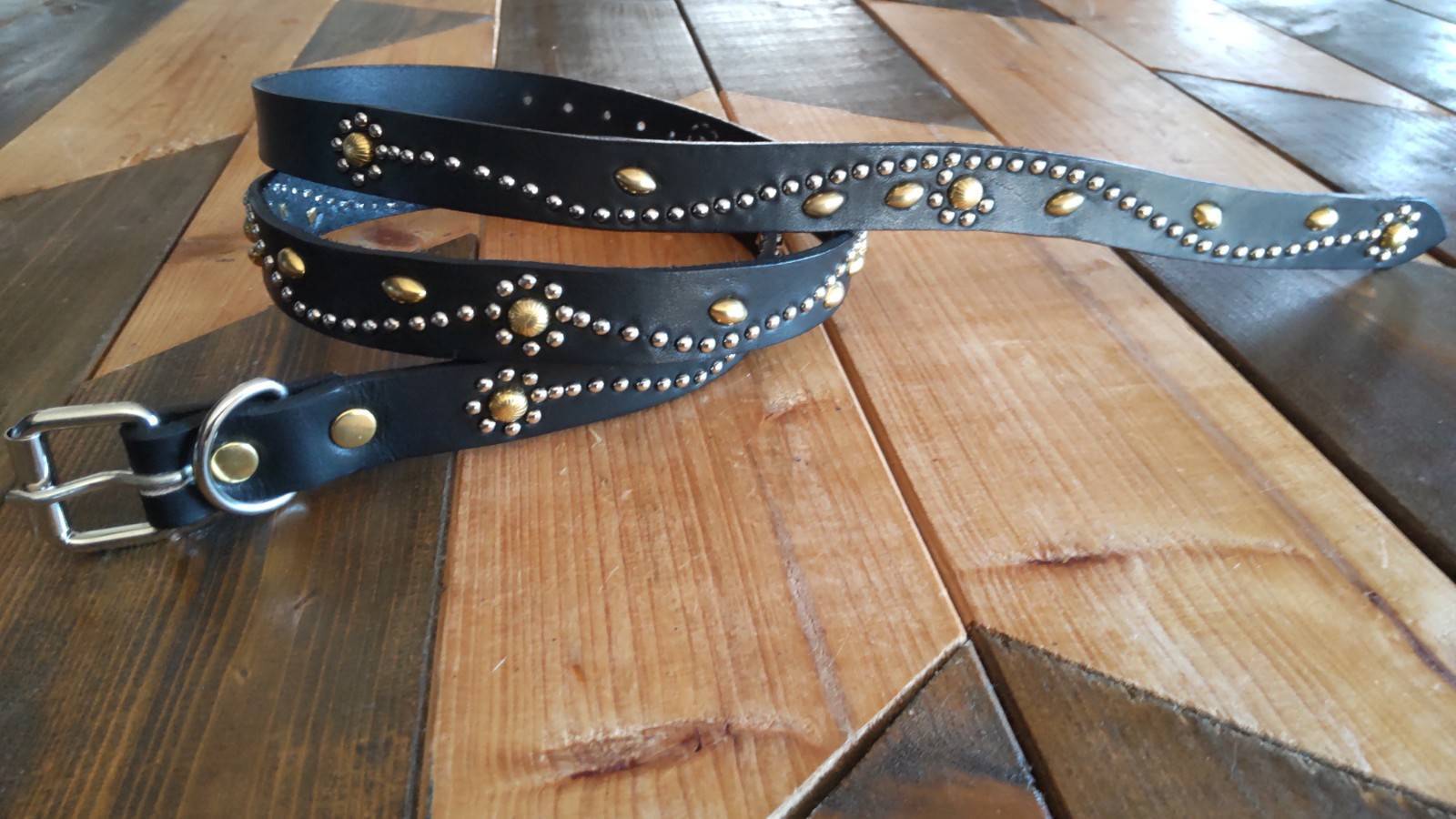 ベルト全体360度にフラワースタッズを施したナローベルト。着用画像の剣先はシャープになります。バックルの留め具がスナップボタン式ですのでバックルの取り外しが可能です。【ゴールドブラススタッズ】はクスミのない明るいゴールド色のスタッズです。